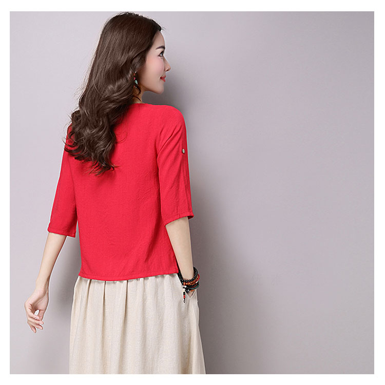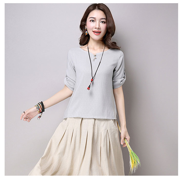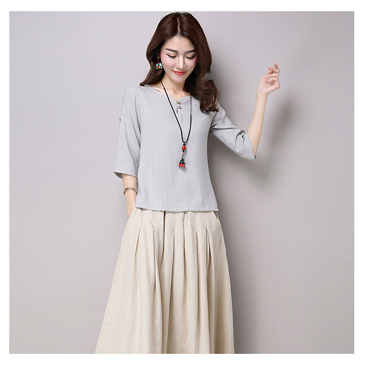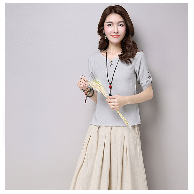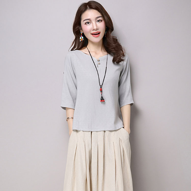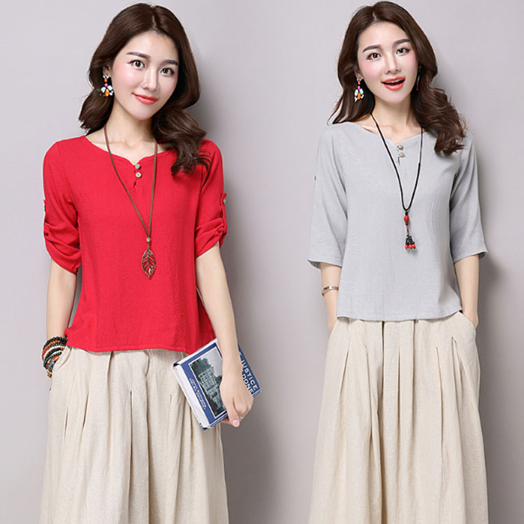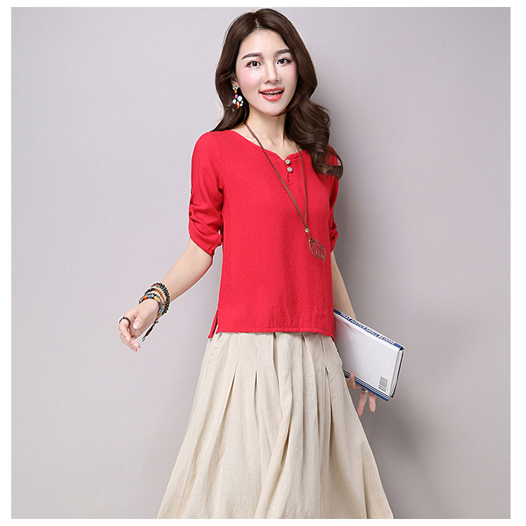 | チャイナ風プルオーバートップスが新登場! 通気性と吸湿性に優れた薄手の綿麻素材を使用した爽やかなサマートップスです。 天然素材独特のクタッと感がナチュラルで可愛い風合い。 | |