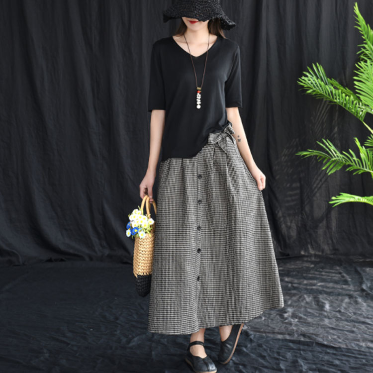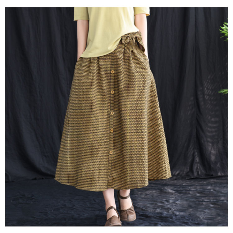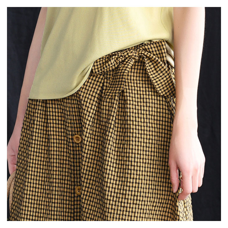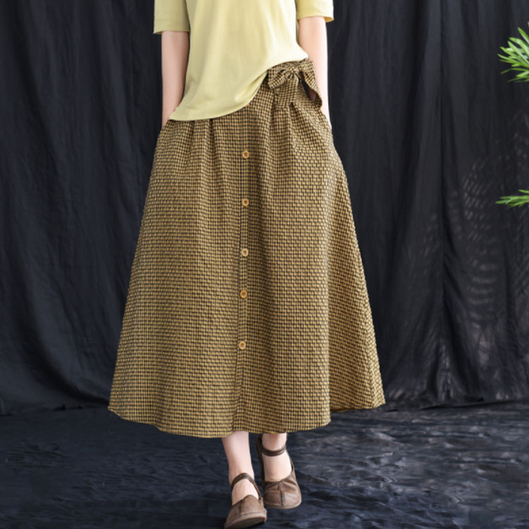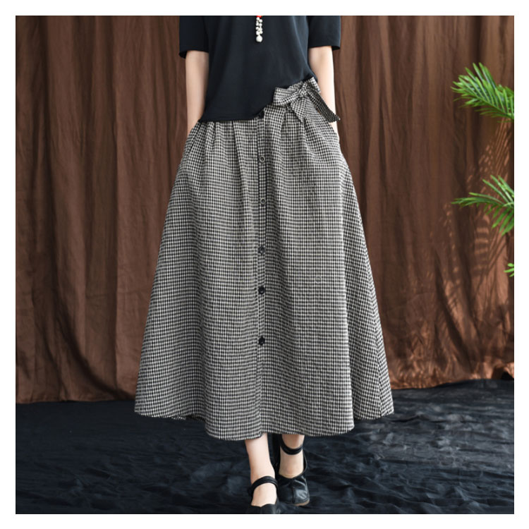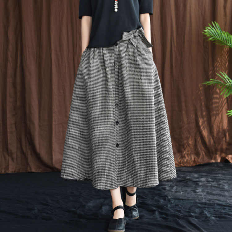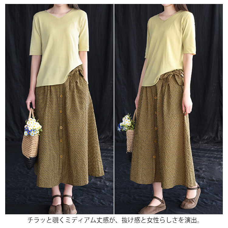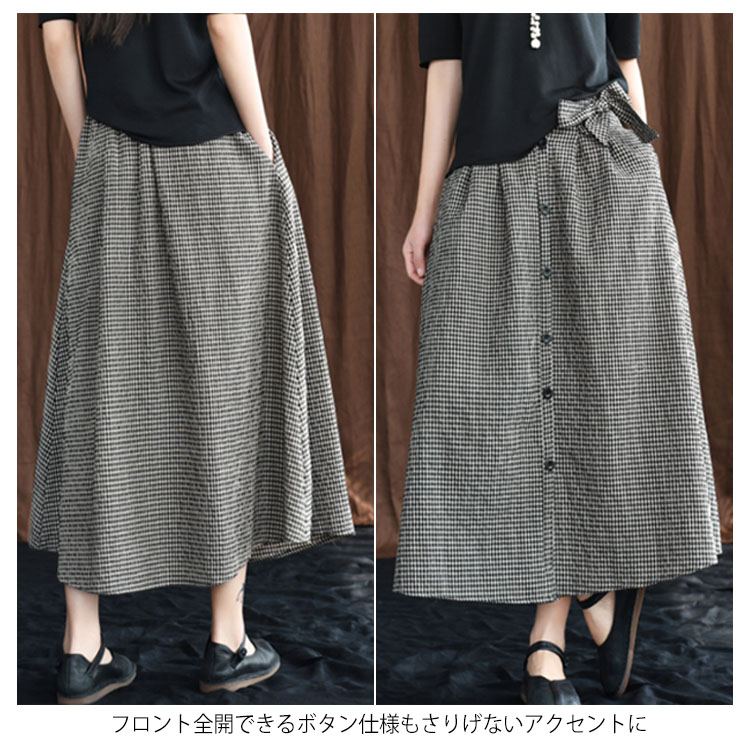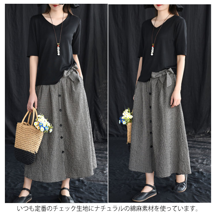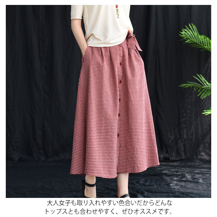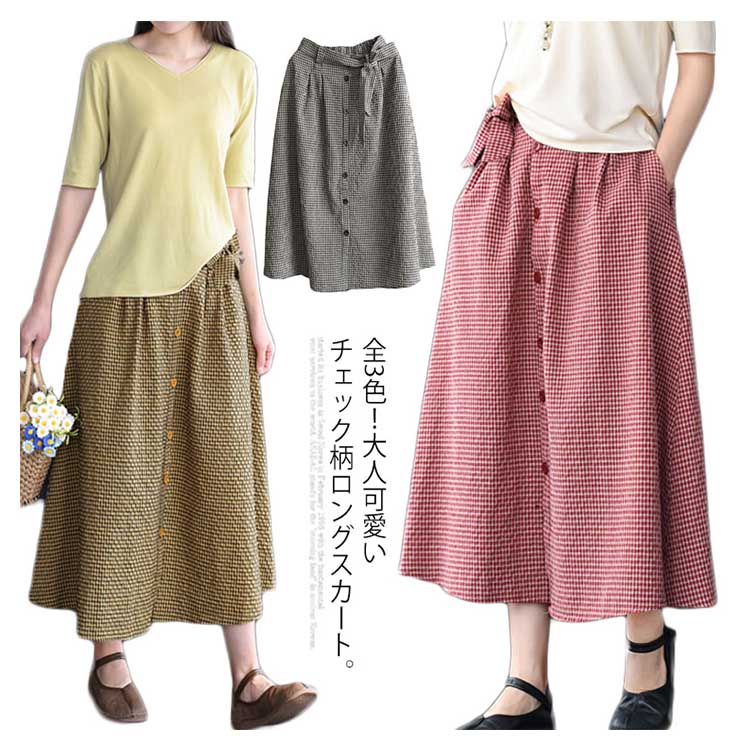 《送料無料》全3色!チェック柄ロングスカート リボン付き スカート リネンスカート リネン ロングスカート フレアスカート ミモレ丈 ミディアム丈 ボタン バックゴム ギンガム チェック 大人可愛い