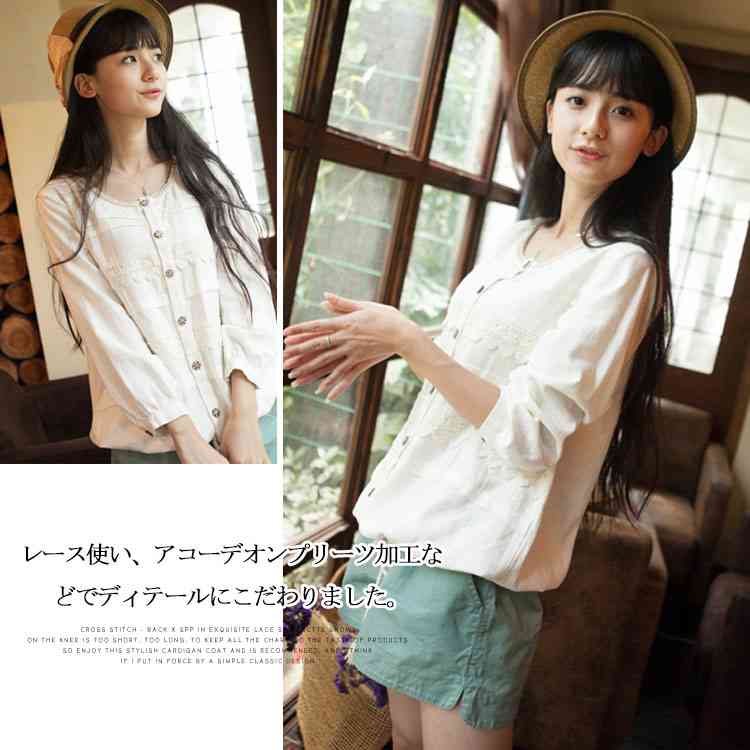 アコーデオンプリーツ加工トップス 綿麻 トップス ブラウス レディース リネントップス レーストップス カジュアル ナチュラル 可愛