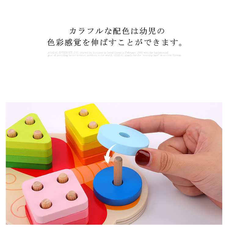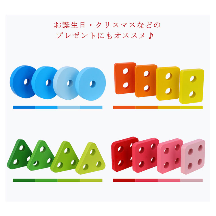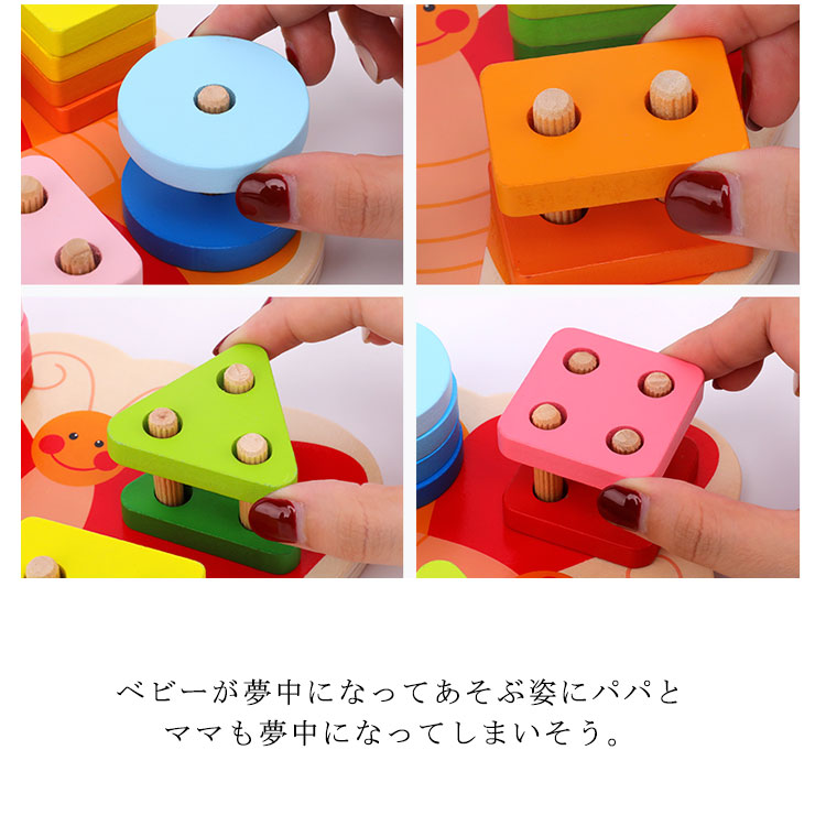 | 知育に最適な手と頭を使う木のおもちゃ♪ カラフルな配色は幼児の色彩感覚を伸ばすことができます。 ベビーが夢中になってあそぶ姿にパパとママも夢中になってしまいそう。 | |