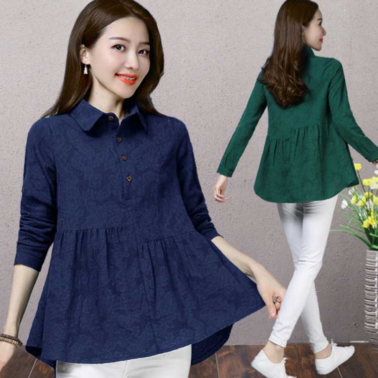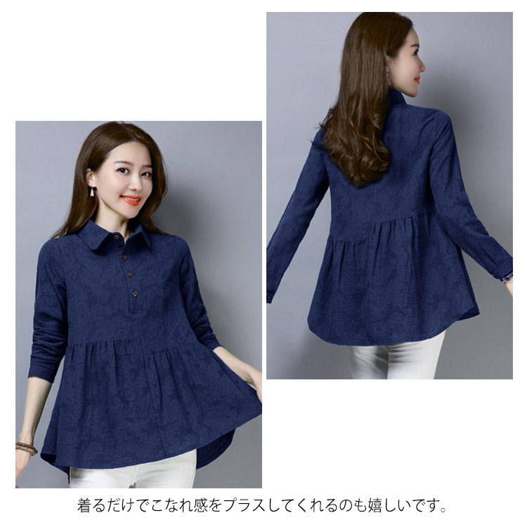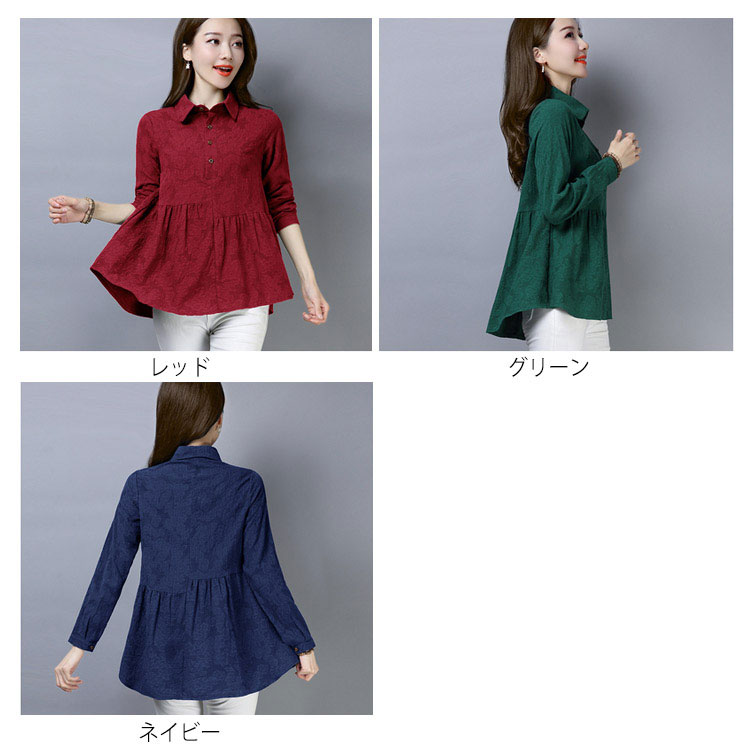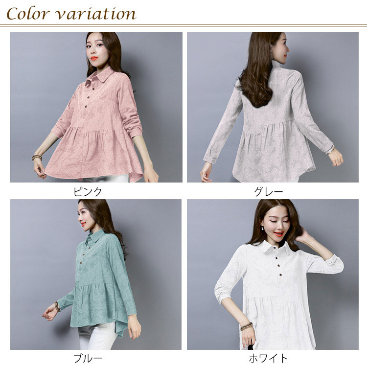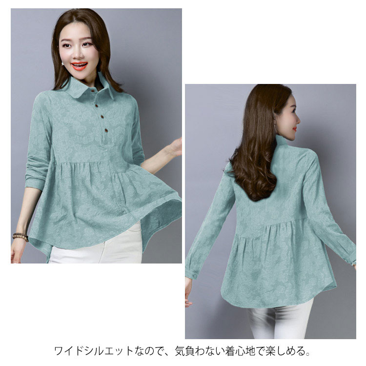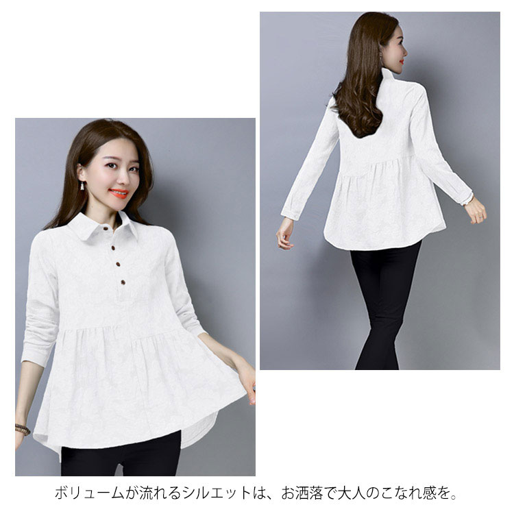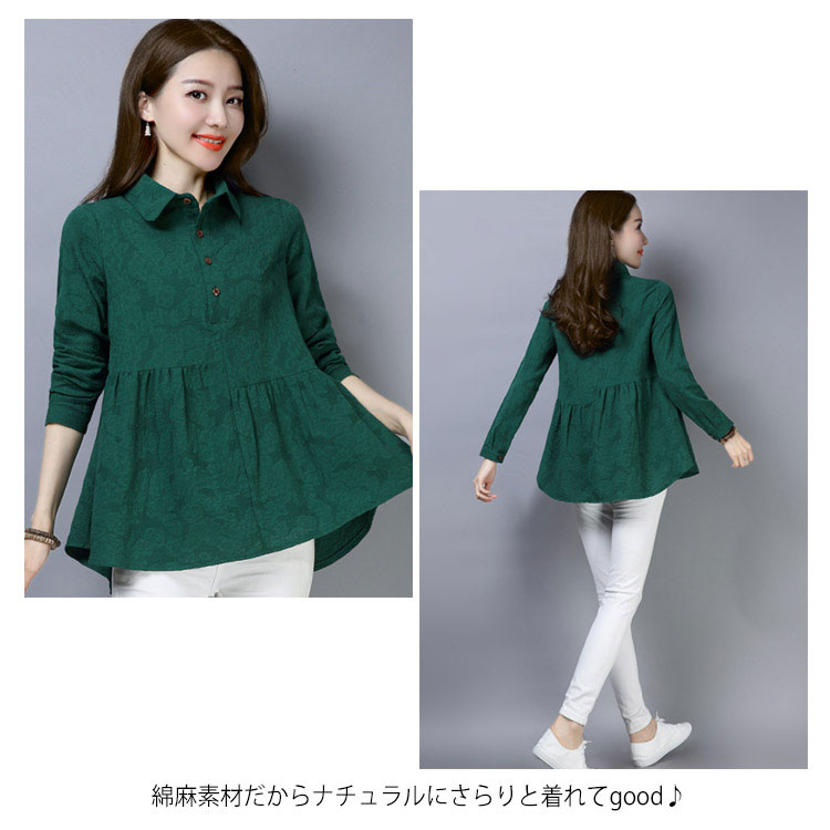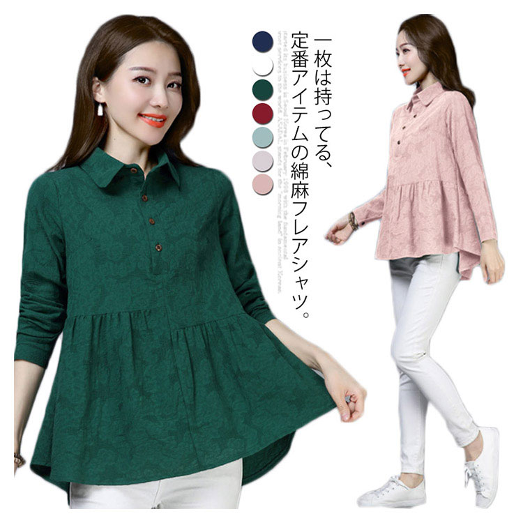 シャツ ブラウス レディース 長袖 トップス 綿麻 前開き 春秋 無地 フレアスリーブ 大きいサイズ ゆったり カジュアル ナチュラル お洒落 送料無料
