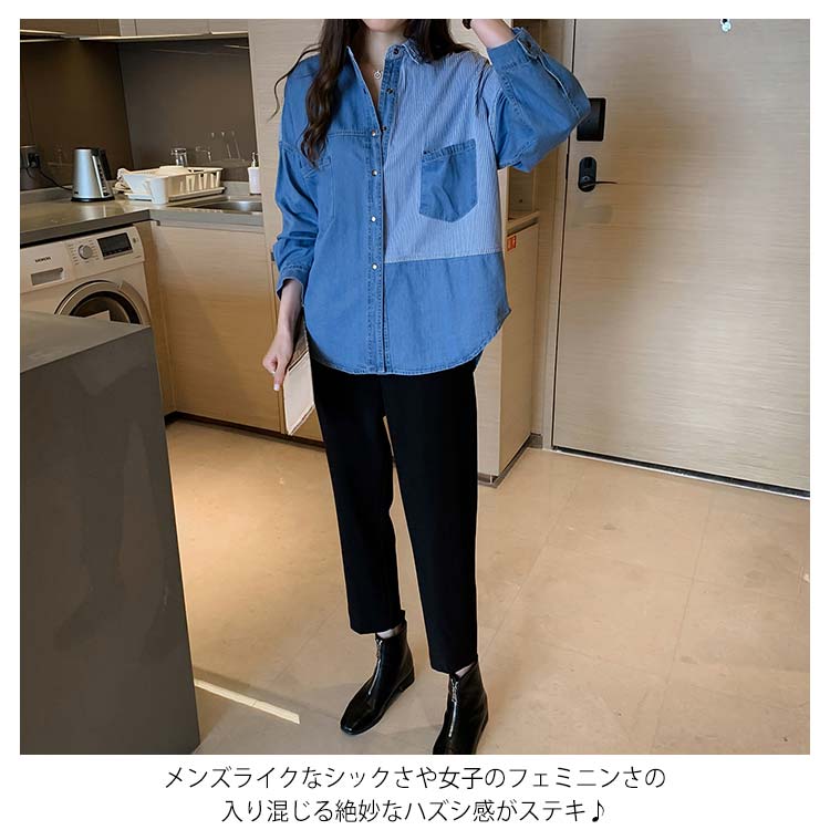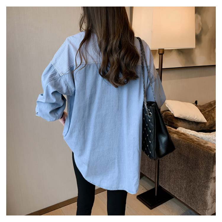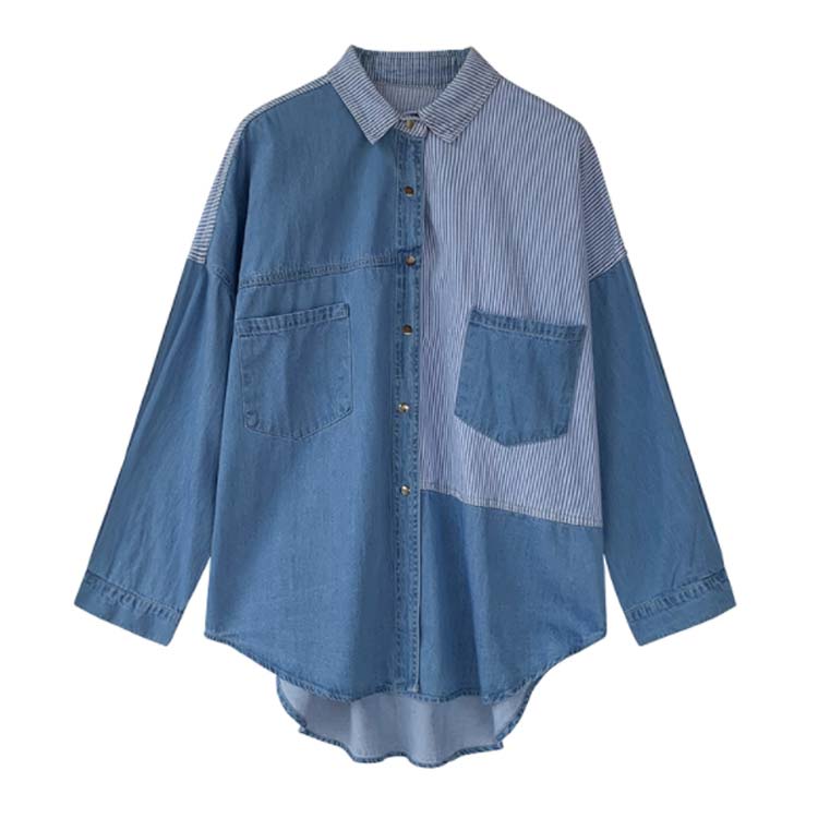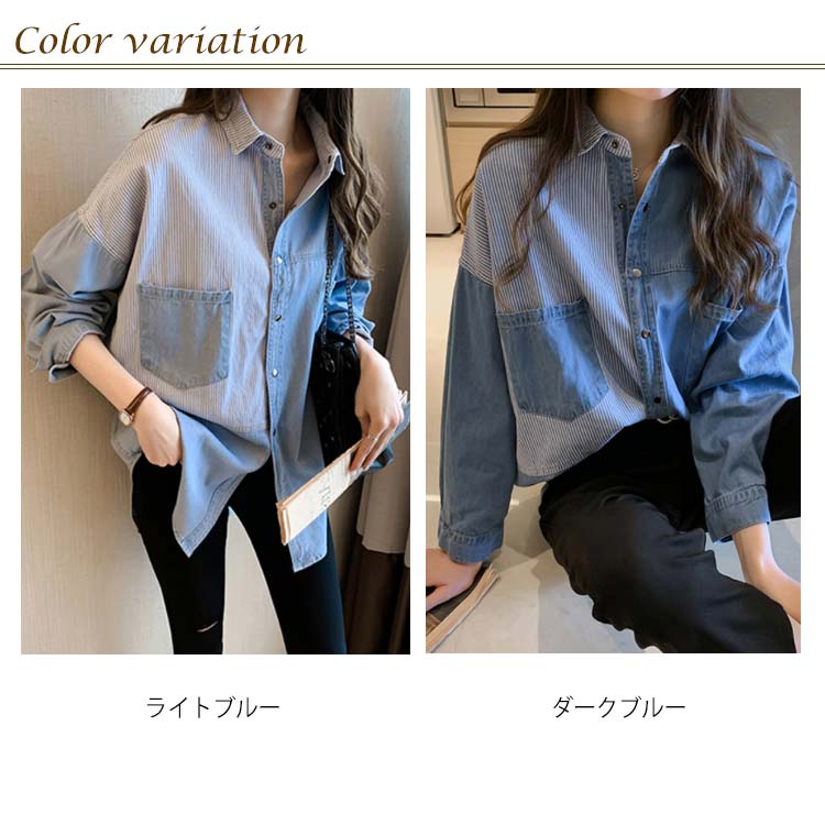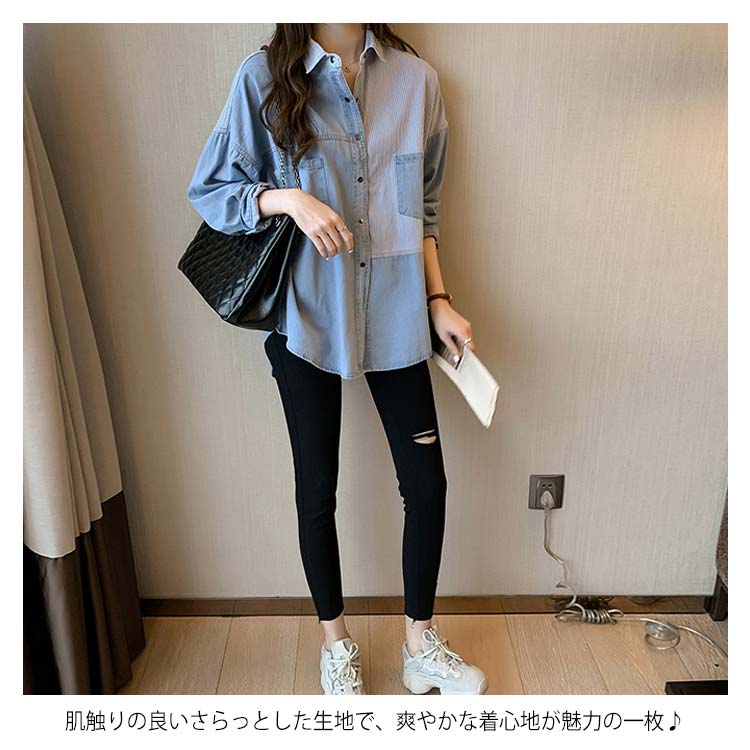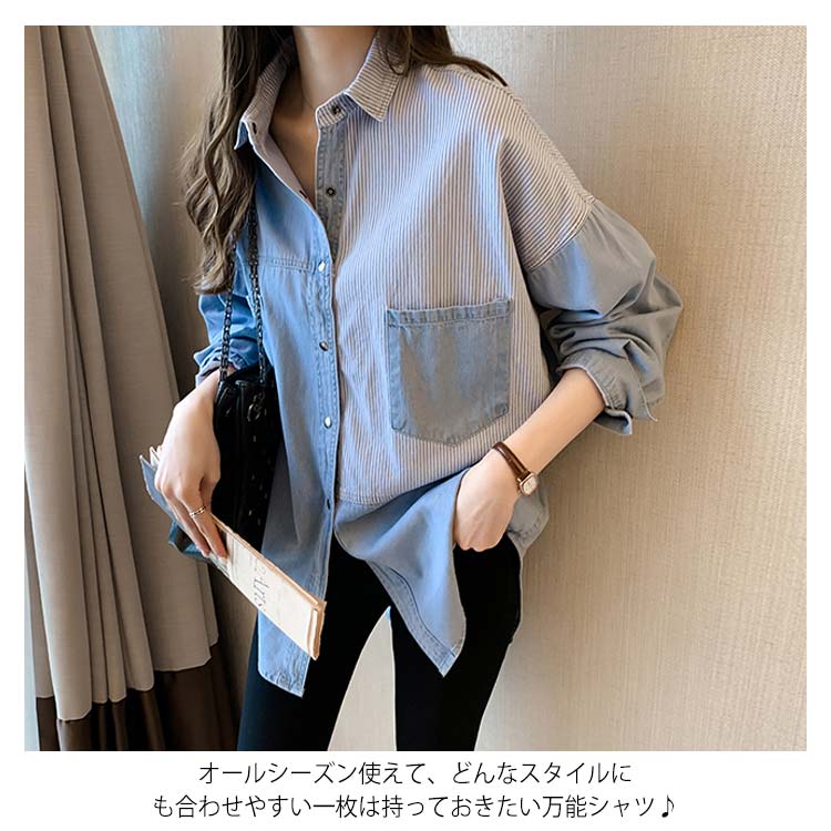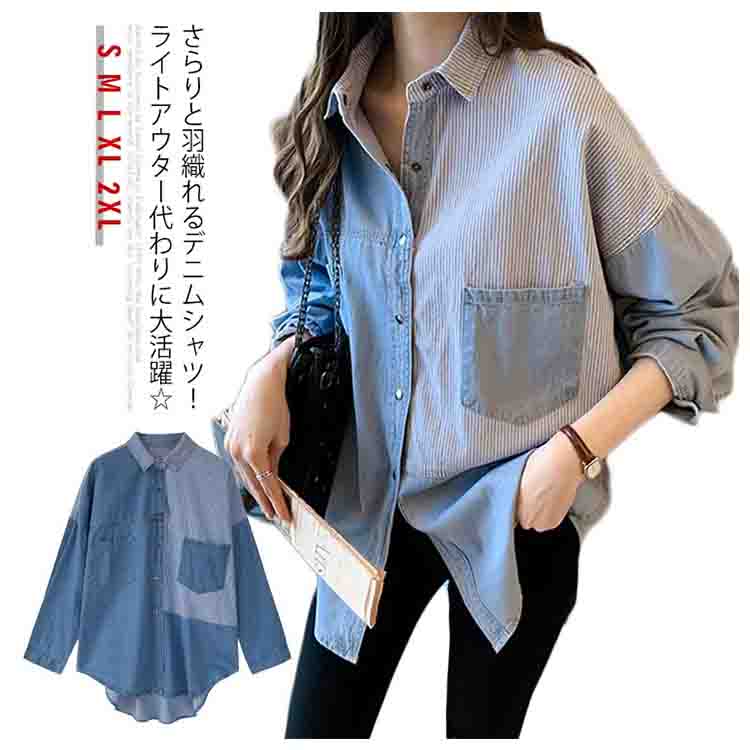 デニムシャツ レディース ブラウス 長袖シャツ ロング丈 切り替え ストライプ トップス ゆったり カジュアル 春秋物 着痩せ 人気 大きいサイズ お洒落 送料無料