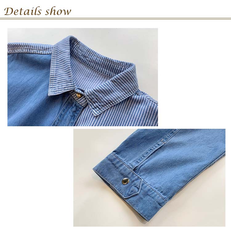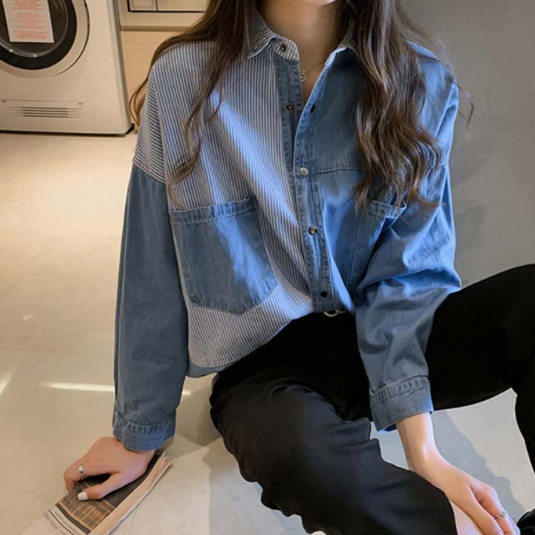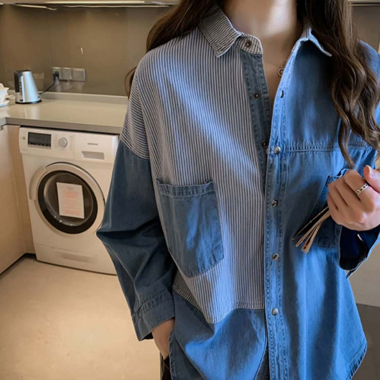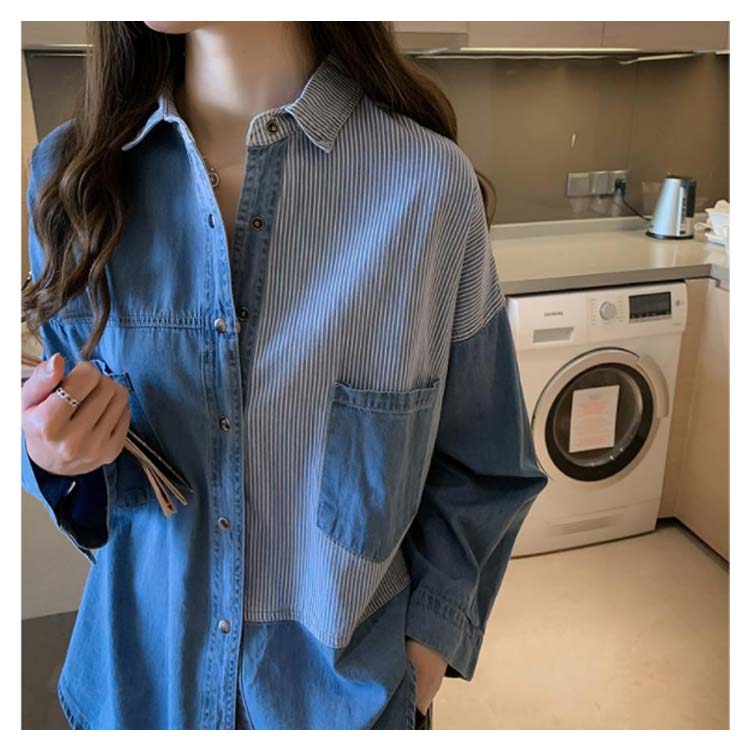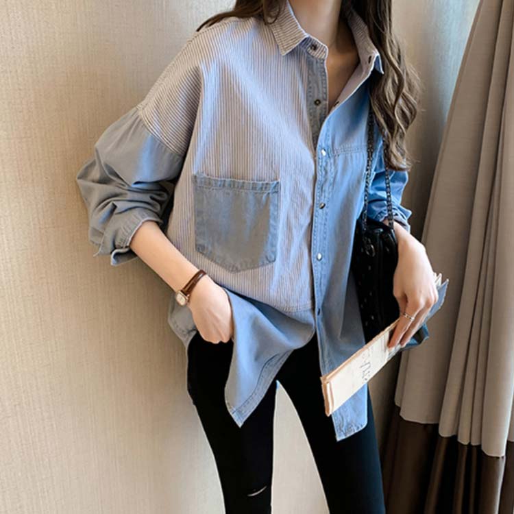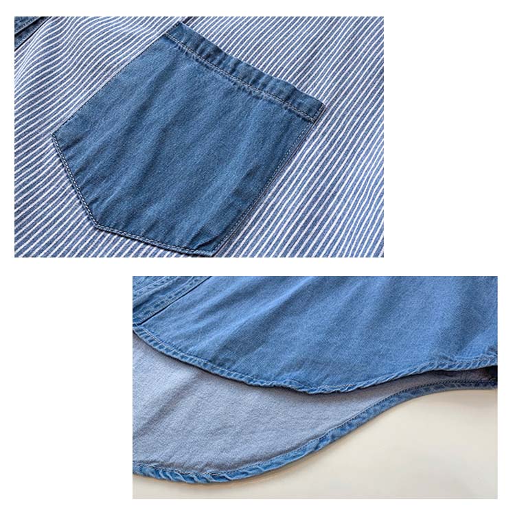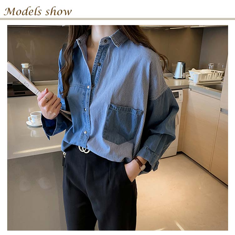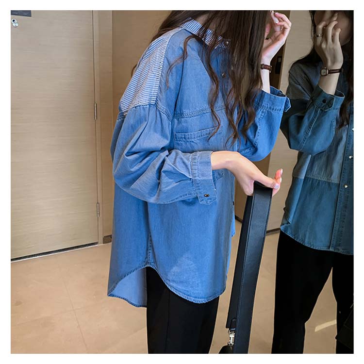 デニムシャツ レディース ブラウス 長袖シャツ ロング丈 切り替え ストライプ トップス ゆったり カジュアル 春秋物 着痩せ 人気 大きいサイズ お洒落 送料無料