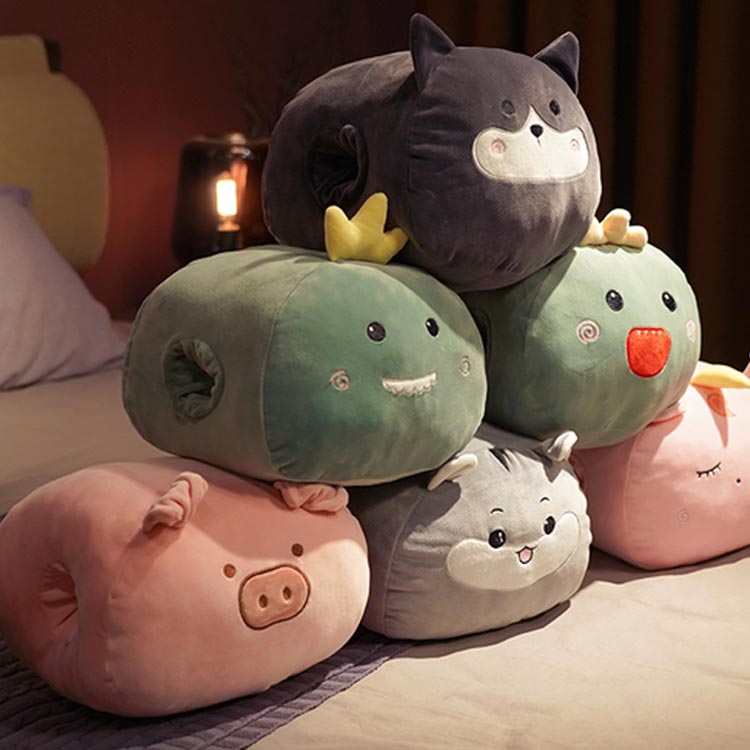 | オフィスやお部屋での休憩時大活躍するもちもち手入れクッション。 癒し系の動物やフルーツがとってもキュートなぬいぐるみクッション。 ふんわり柔らかな弾力、頭をやさしく包み込みます。 なめらかな肌触りの良いベロア調素材、思わず頬をよせたくなる自慢の素材♪ 両サイドの穴から手を入れて指先まで暖か!寒さ対策としても◎ ソファやベッドに置いてインテリアとしてもお勧めです。 | |
