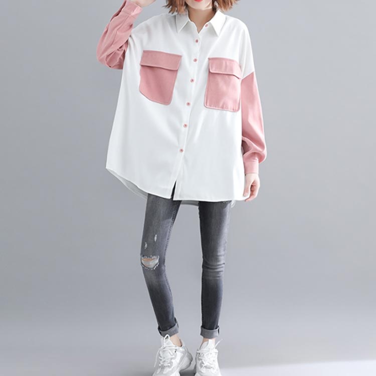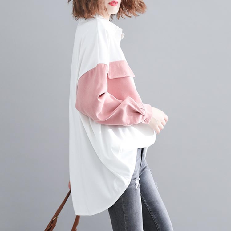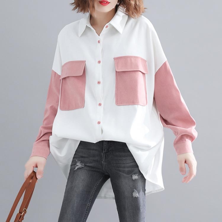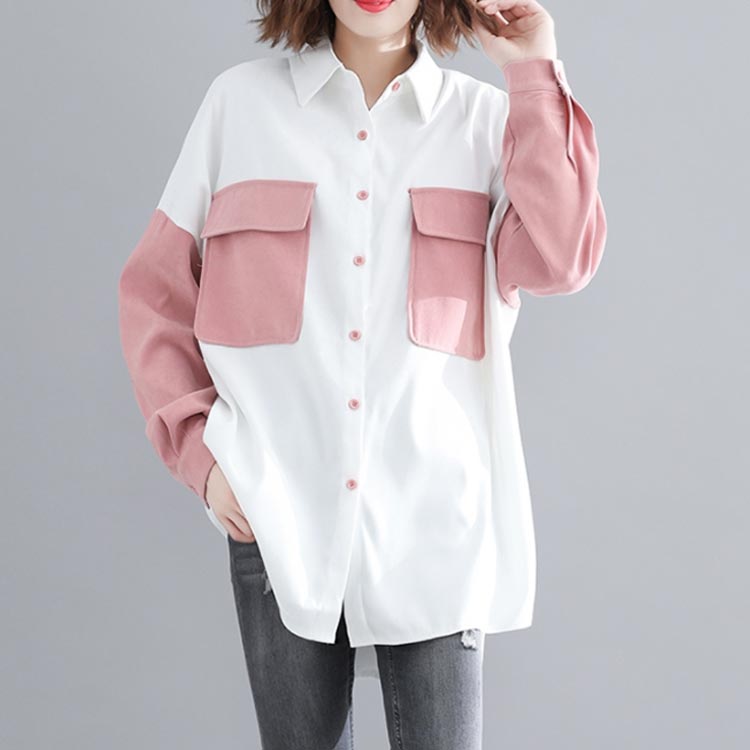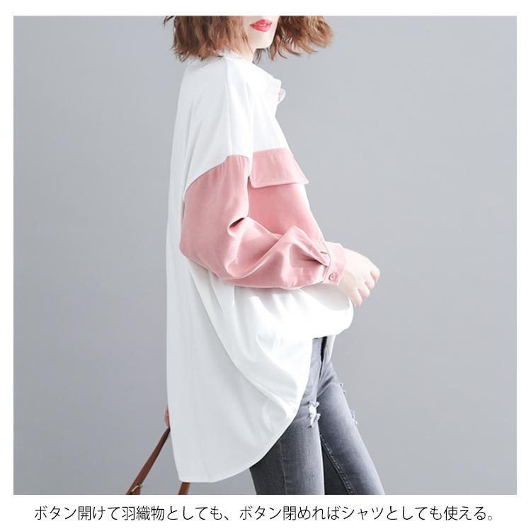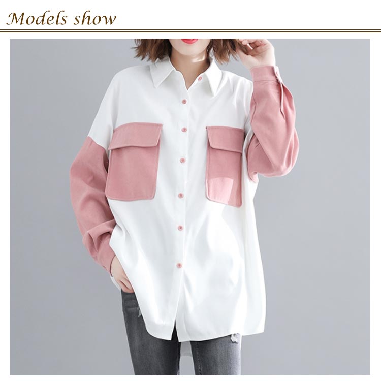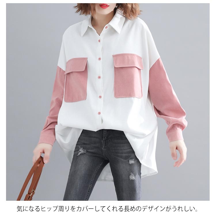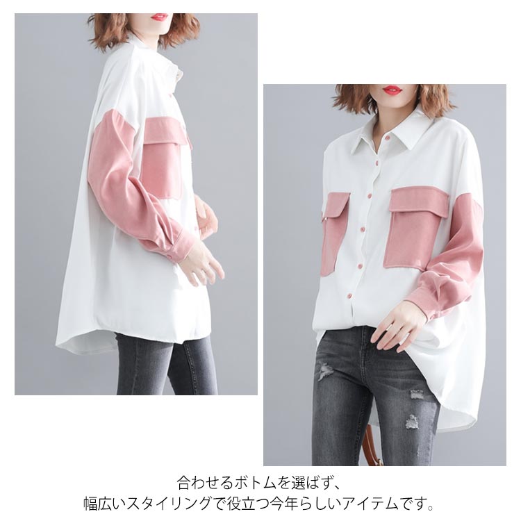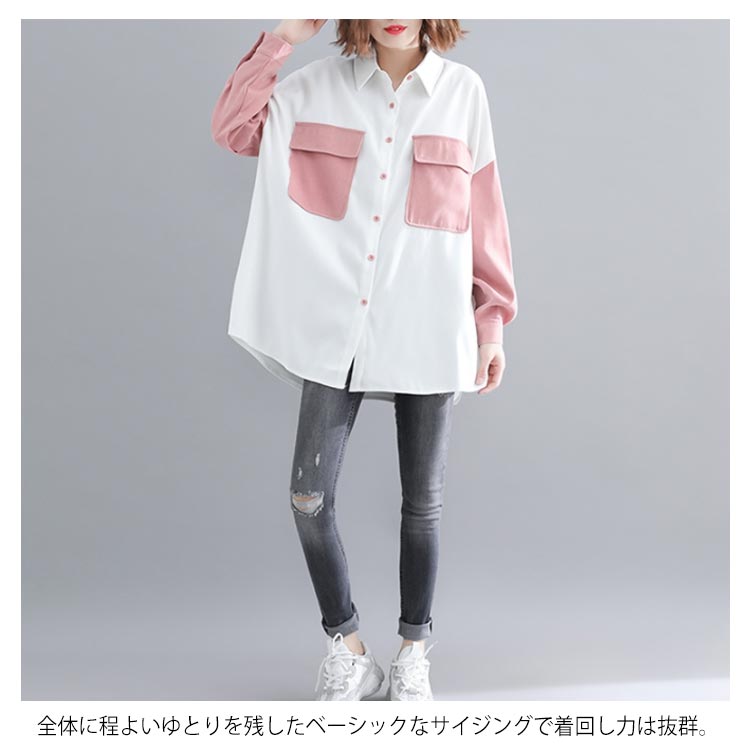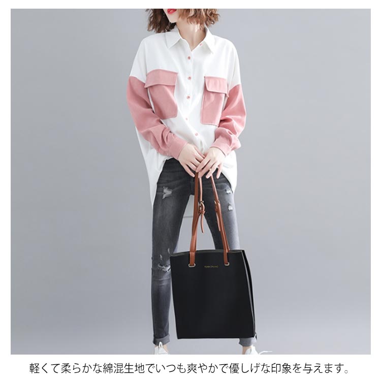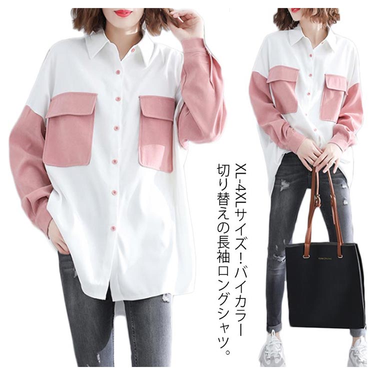《送料無料》XL-4XLサイズ!バイカラービッグシャツ 秋服 ロングシャツ チュニックシャツ ビッグシルエット シャツ ビッグシャツ バイカラー 切り替え 大きサイズ カジュアル 体型カバー レディース