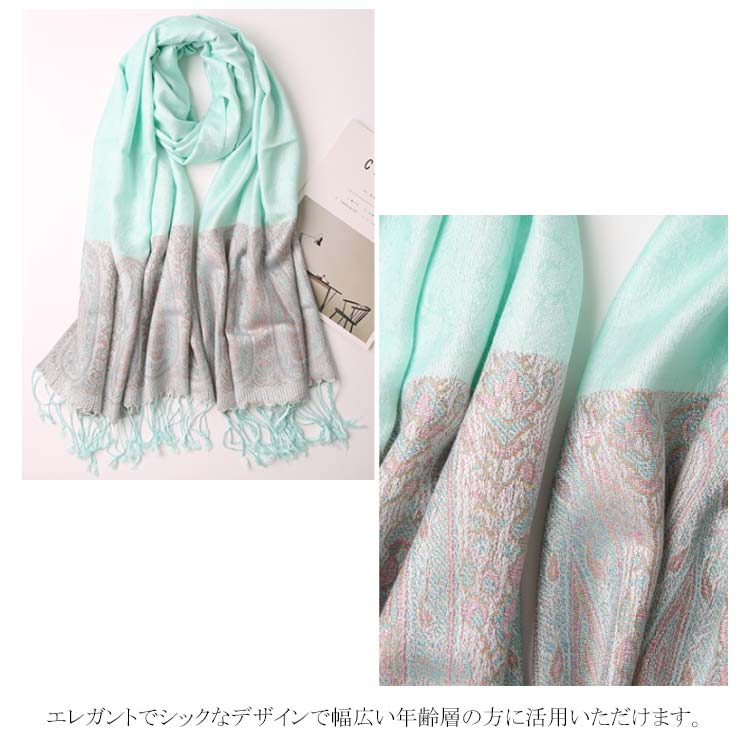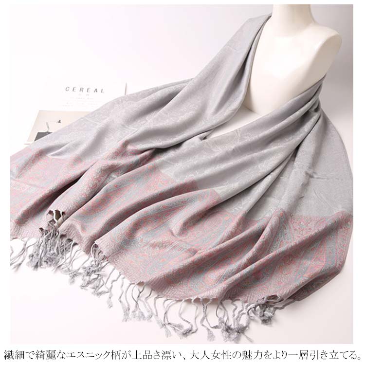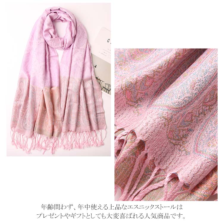 | 今期大人気のエスニック柄の大判ストール。 エレガントでシックなデザインで幅広い年齢層の方に活用いただけます。 柔らかで肌になじむ優しい綿混生地、保温性も抜群◎ 繊細で綺麗なエスニック柄が上品さ漂い、大人女性の魅力をより一層引き立てる。 人気の70センチ幅の大判で、ふんわりと身体が包み込まれるサイズ感で、秋冬はもちろん、夏の冷房対策としても◎ 年齢問わず、年中使える上品なエスニックストールはプレゼントやギフトとしても大変喜ばれる人気商品です。 | |