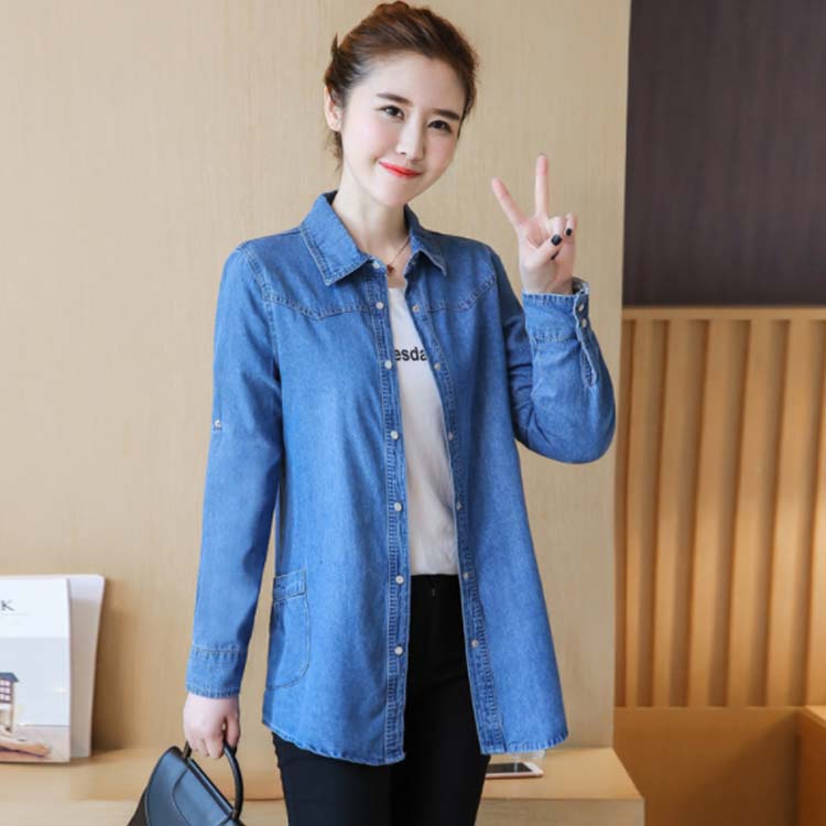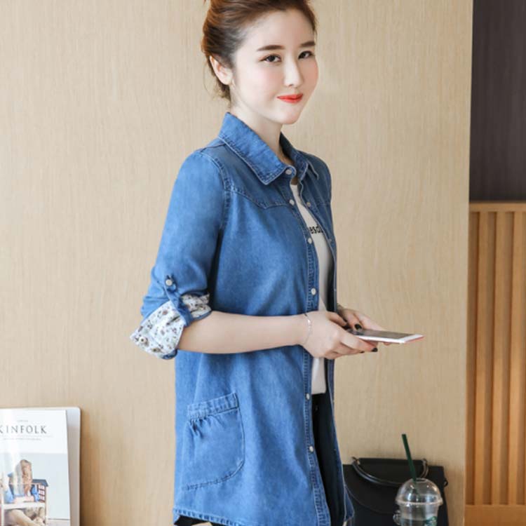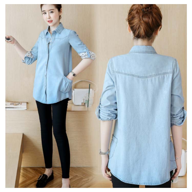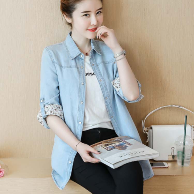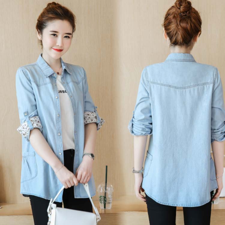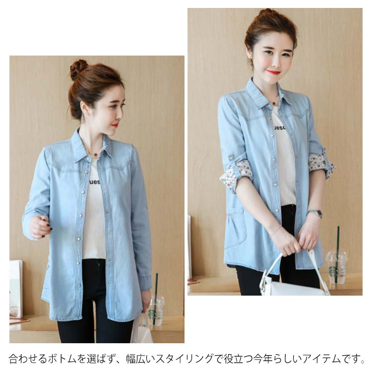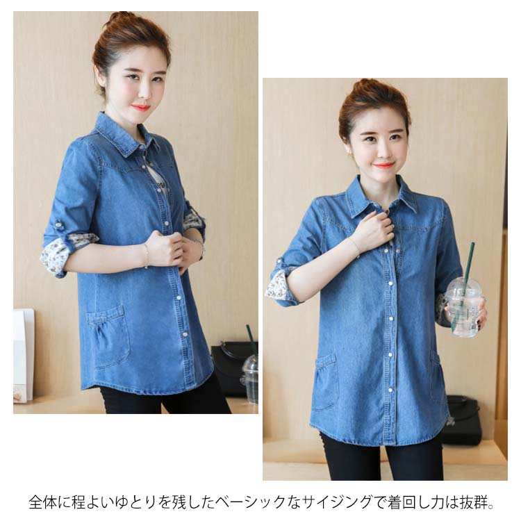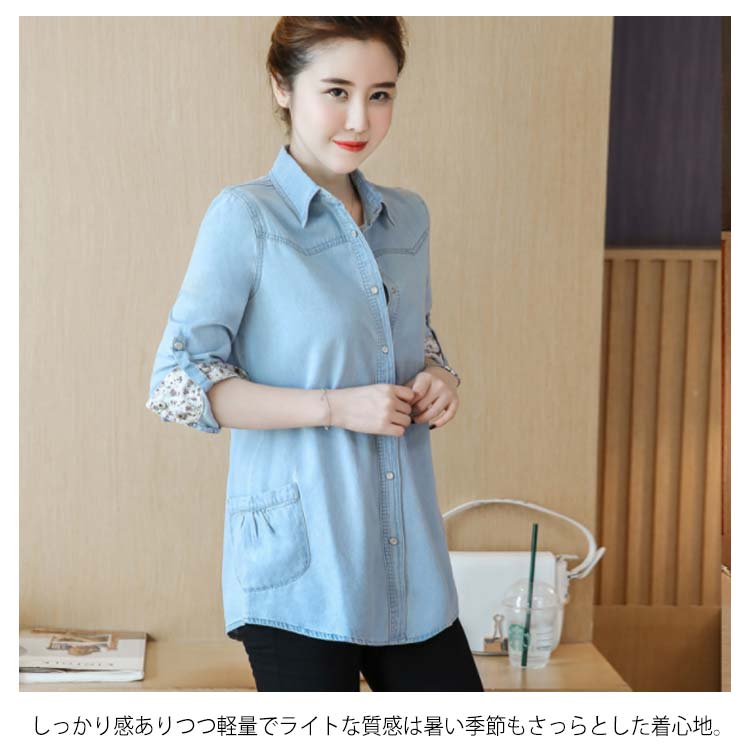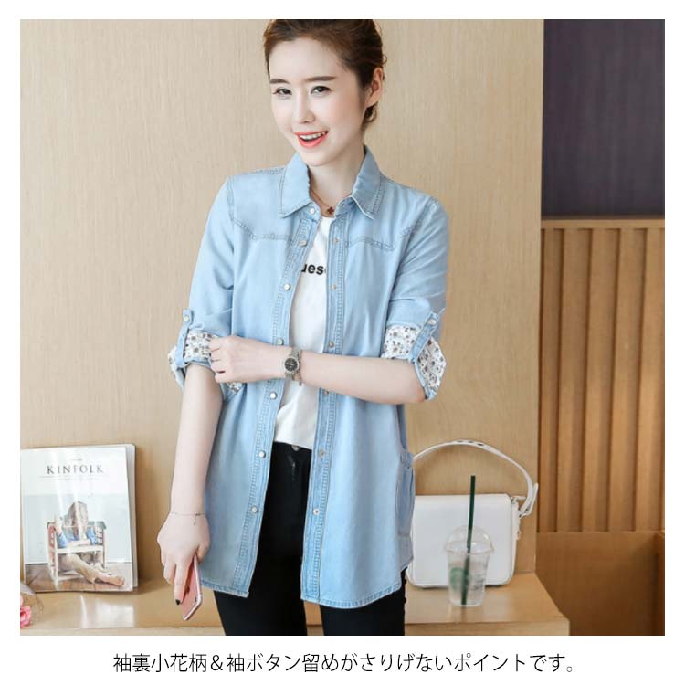 《送料無料》袖裏小花柄&袖ボタン留め デニムアウター ロングシャツ レディース デニムシャツ ロング丈 デニム シャツ ブラウス 羽織り 薄手 大人カジュアル 大きサイズ
