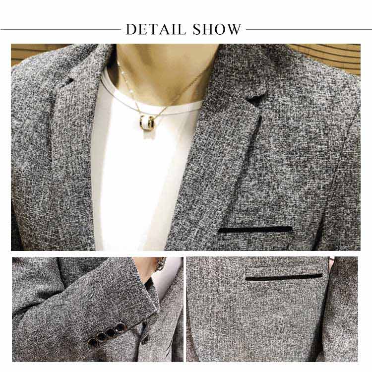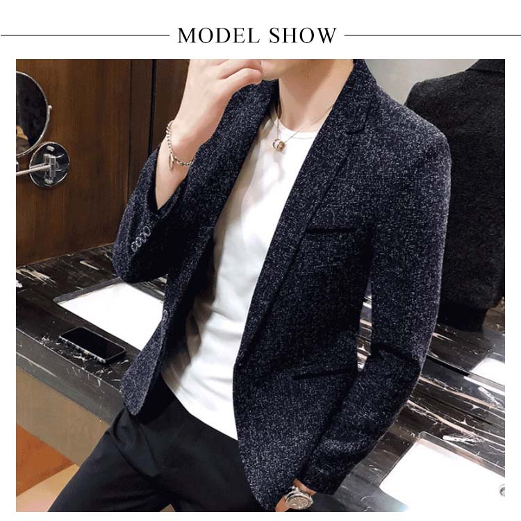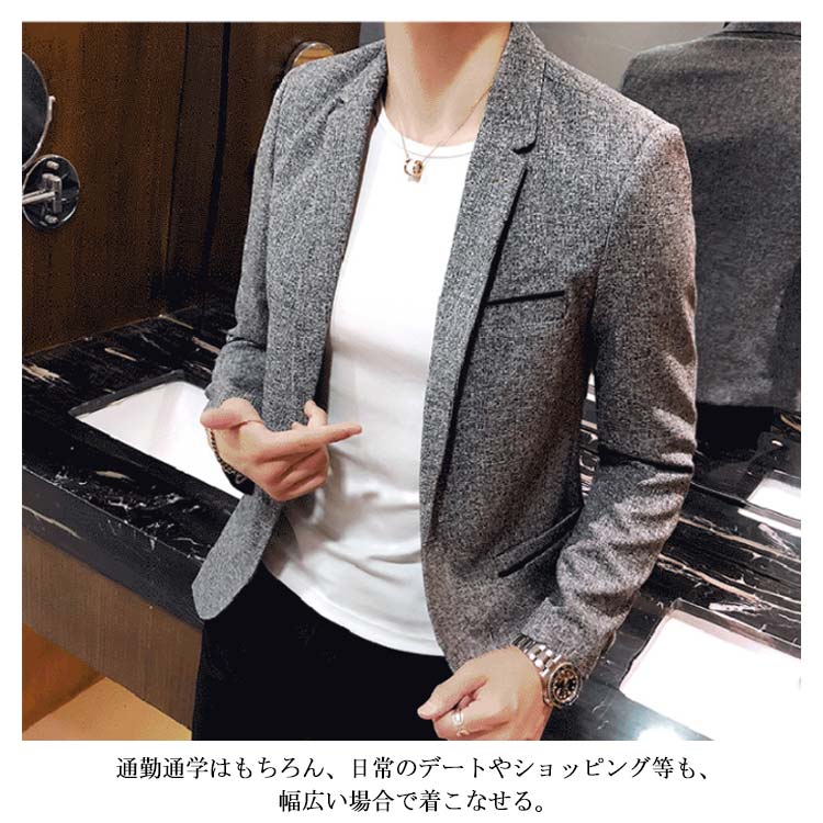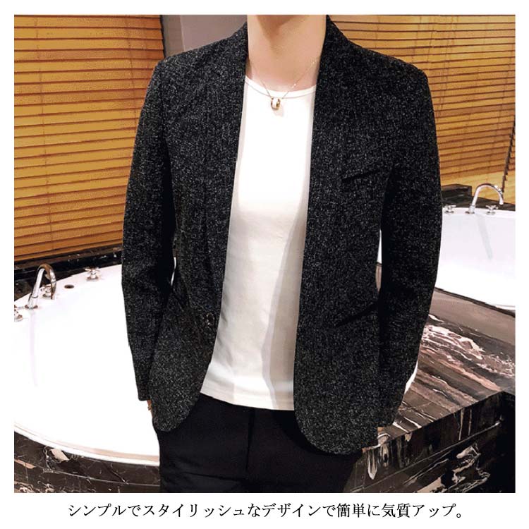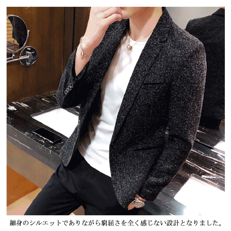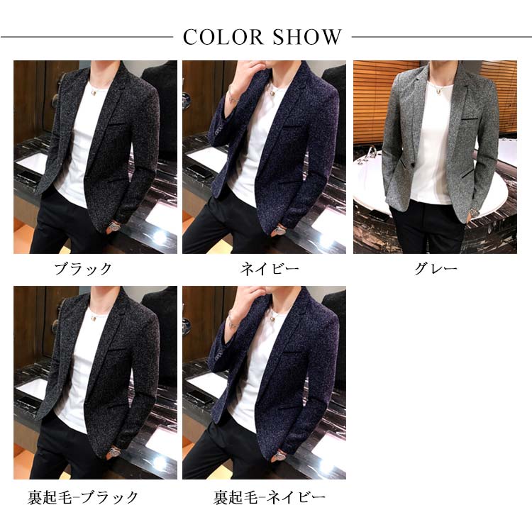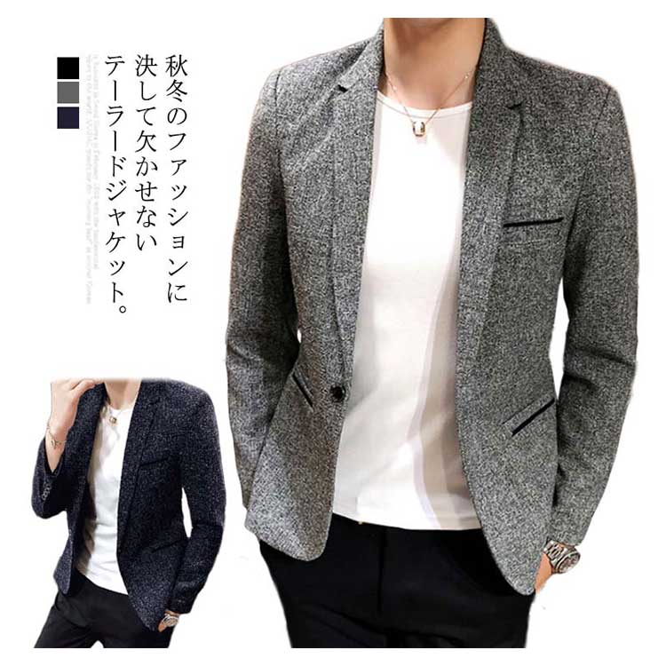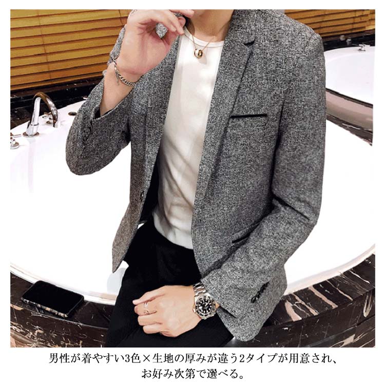| 秋冬のファッションに決して欠かせないテーラードジャケット。 細身のシルエットでありながら窮屈さを全く感じない設計となりました。 シンプルでスタイリッシュなデザインで簡単に気質アップ。 通勤通学はもちろん、日常のデートやショッピング等も、幅広い場合で着こなせる。 男性が着やすい3色×生地の厚みが違う2タイプが用意され、お好み次第で選べる。 | |