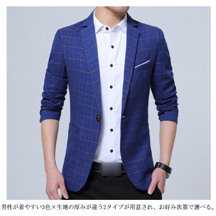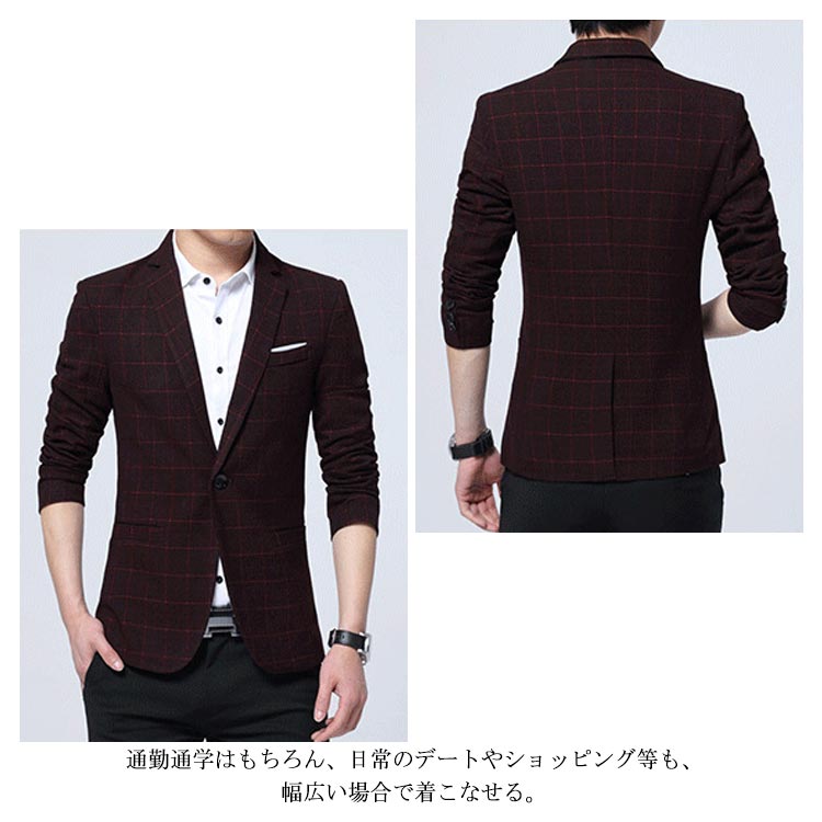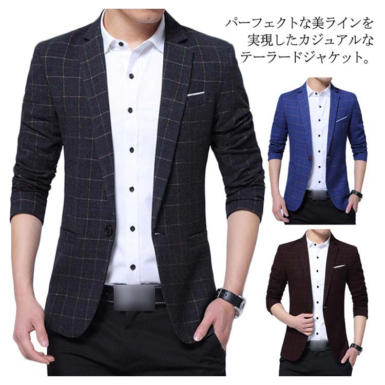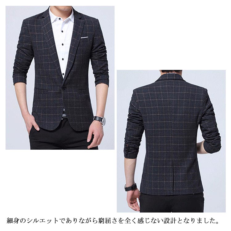 | パーフェクトな美ラインを実現したカジュアルなテーラードジャケット。 細身のシルエットでありながら窮屈さを全く感じない設計となりました。 おしゃれなチェック柄デザインで、羽織るだけで紳士の魅力を演出してくれます。 通勤通学はもちろん、日常のデートやショッピング等も、幅広い場合で着こなせる。 男性が着やすい3色×生地の厚みが違う2タイプが用意され、お好み次第で選べる。 | |