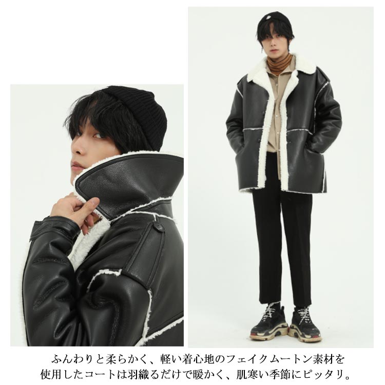 | 真冬も暖か!!身体も心も暖かになる新作コート! お洒落で暖かい裏ボアコート★冬の頼もしい相棒に! ムートンコート一点投入で作る!冬のリッチカジュアルスタイル。 ふんわりと柔らかく、軽い着心地のフェイクムートン素材を使用したコートは羽織るだけで暖かく、肌寒い季節にピッタリ。 | |
