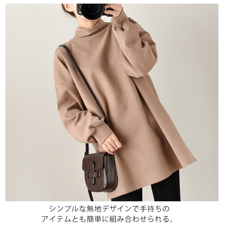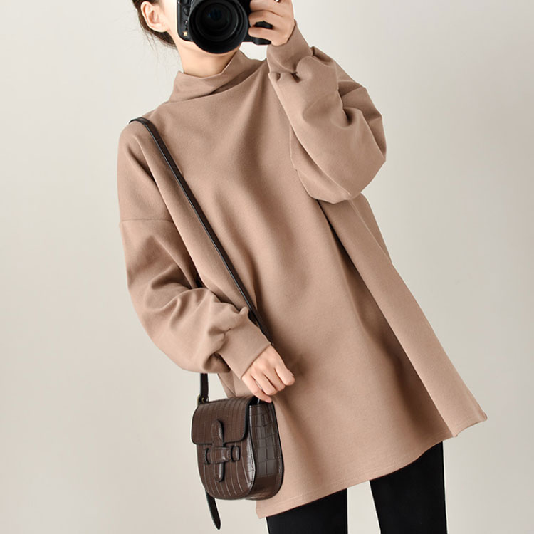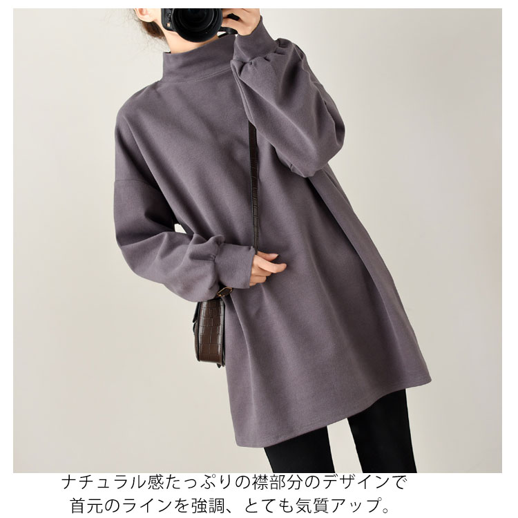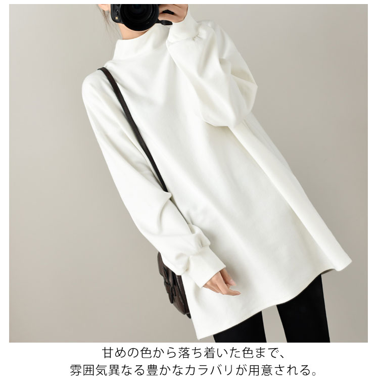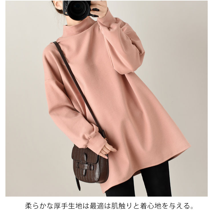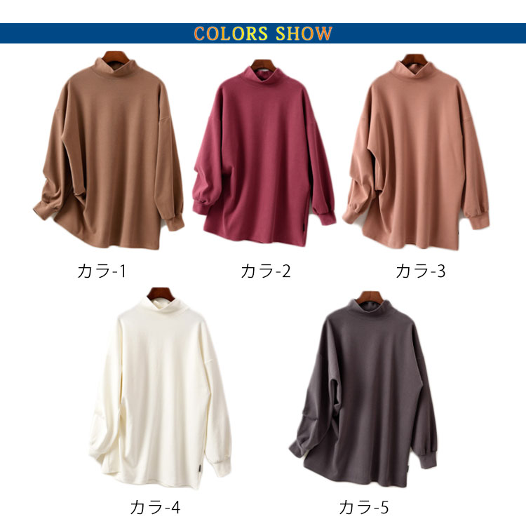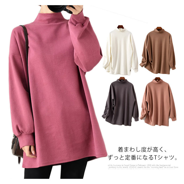 Tシャツ カットソー タイトルネック トップス ブルオーバー ロング丈 レディース 長袖 シンプル カラバリ 無地 秋冬物 厚手 お洒落 体型カバー 厚手