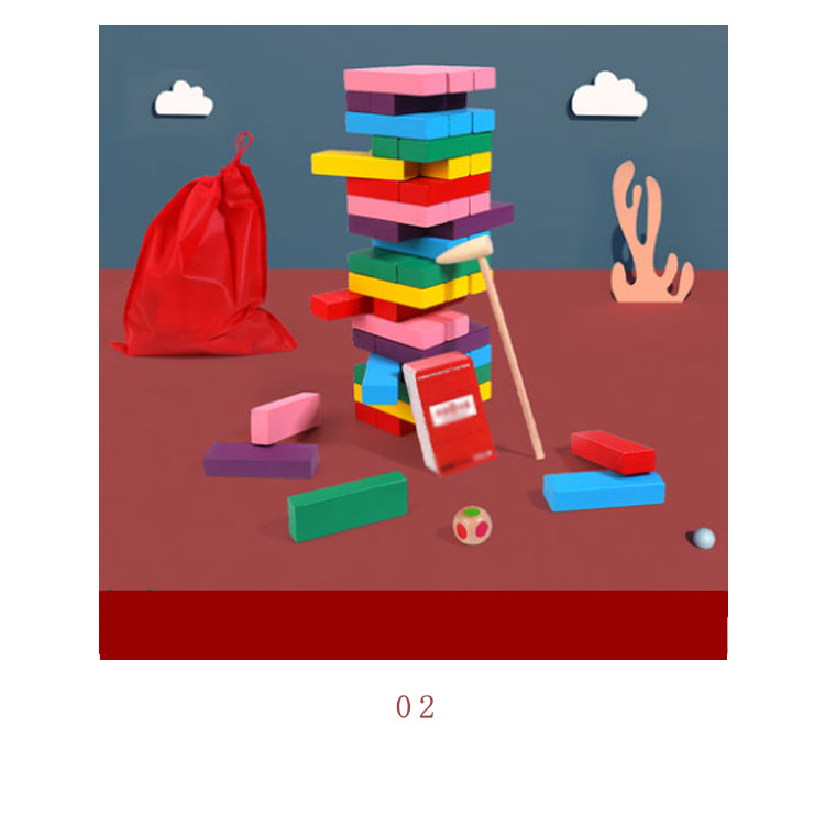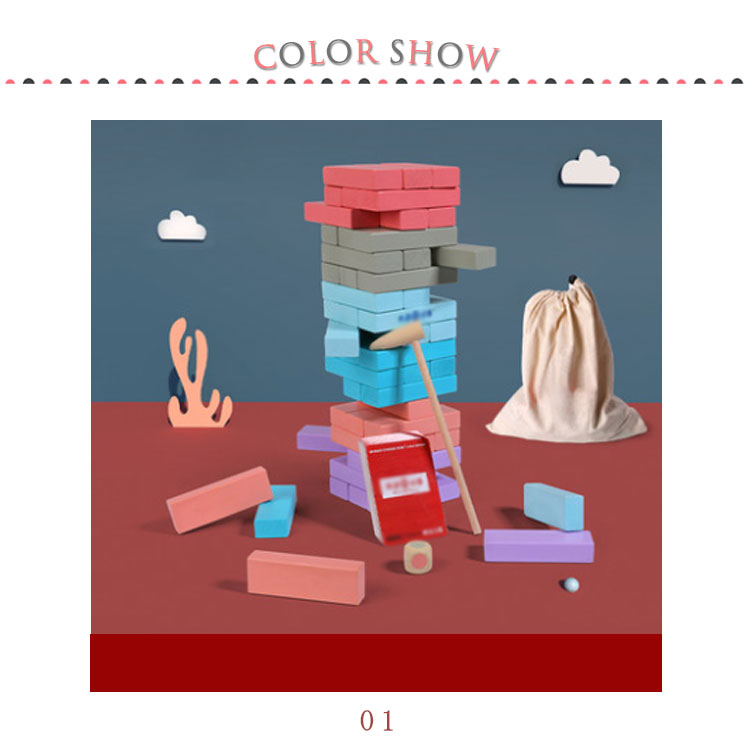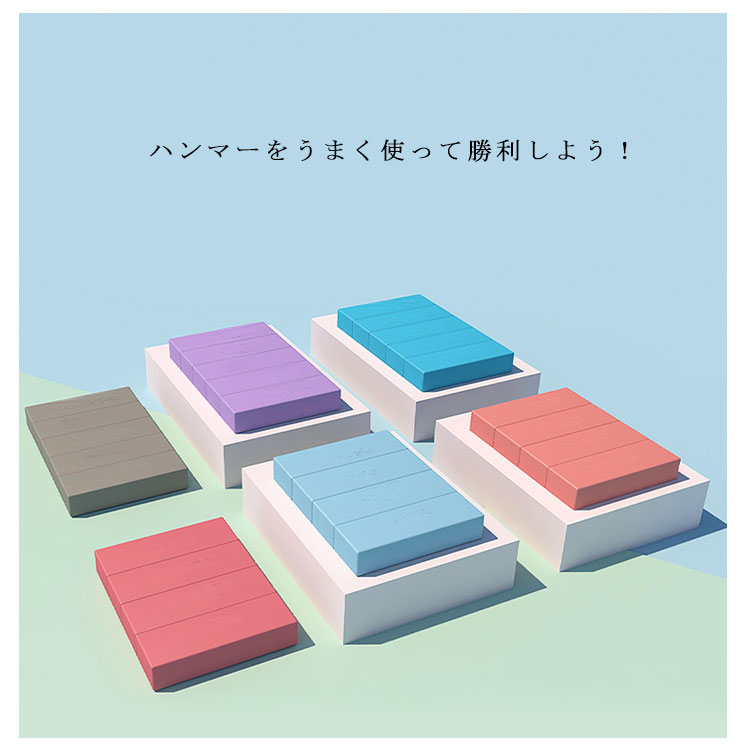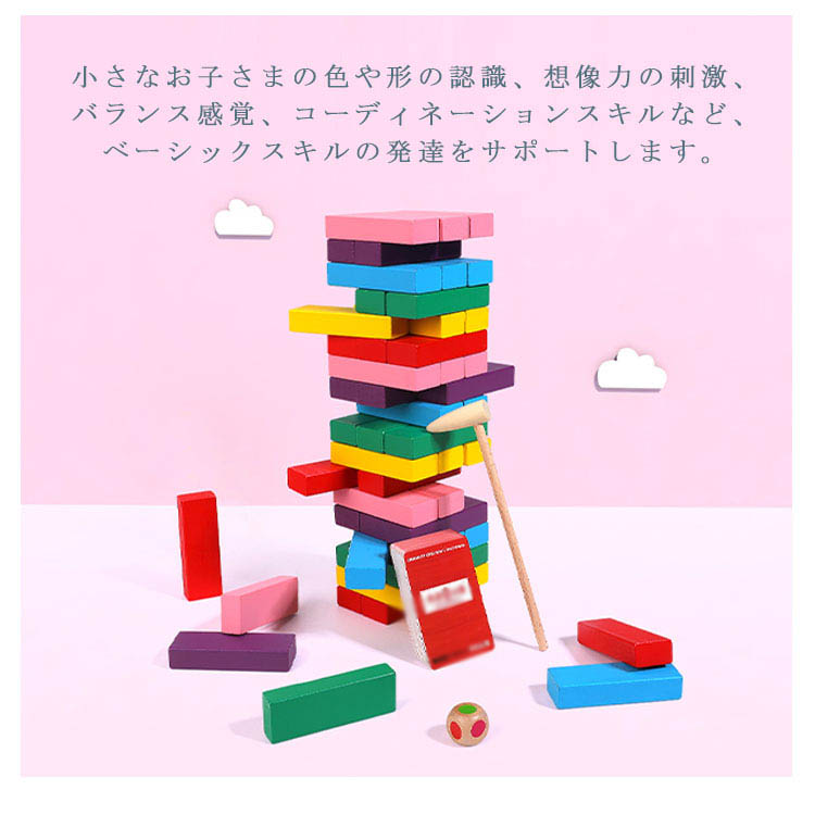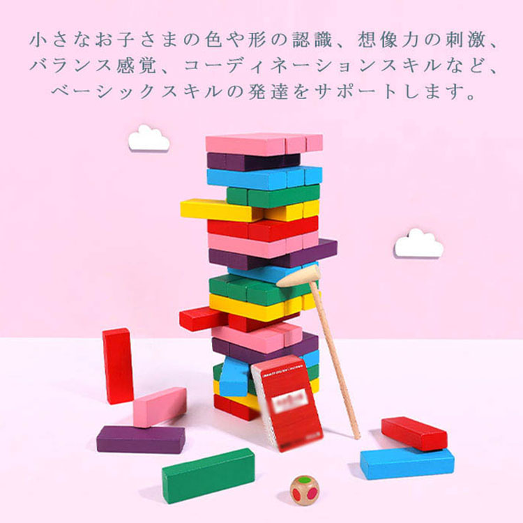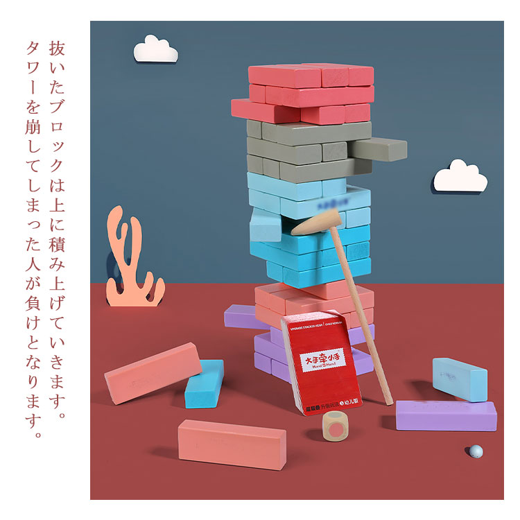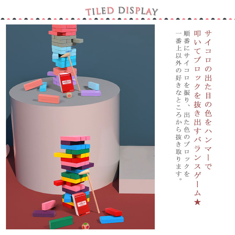 | サイコロの出た目の色をハンマーで叩いてブロックを抜き出すバランスゲーム★ 順番にサイコロを振り、出た色のブロックを一番上以外の好きなところから抜き取ります。 抜いたブロックは上に積み上げていきます。 タワーを崩してしまった人が負けとなります。 | |