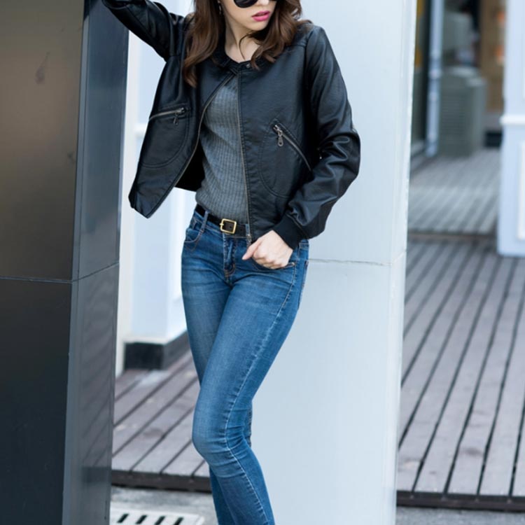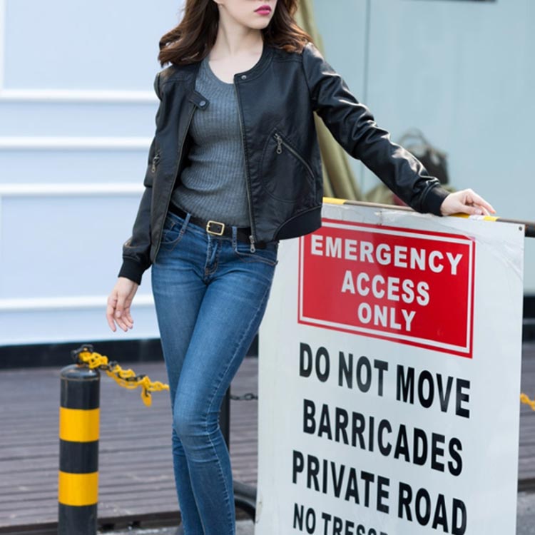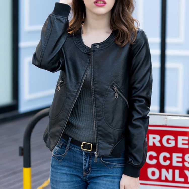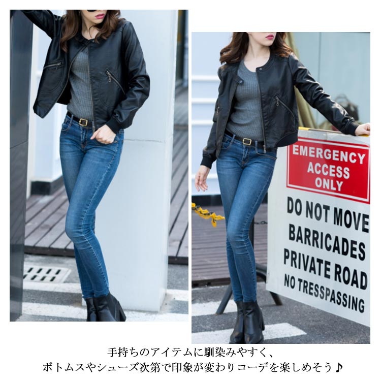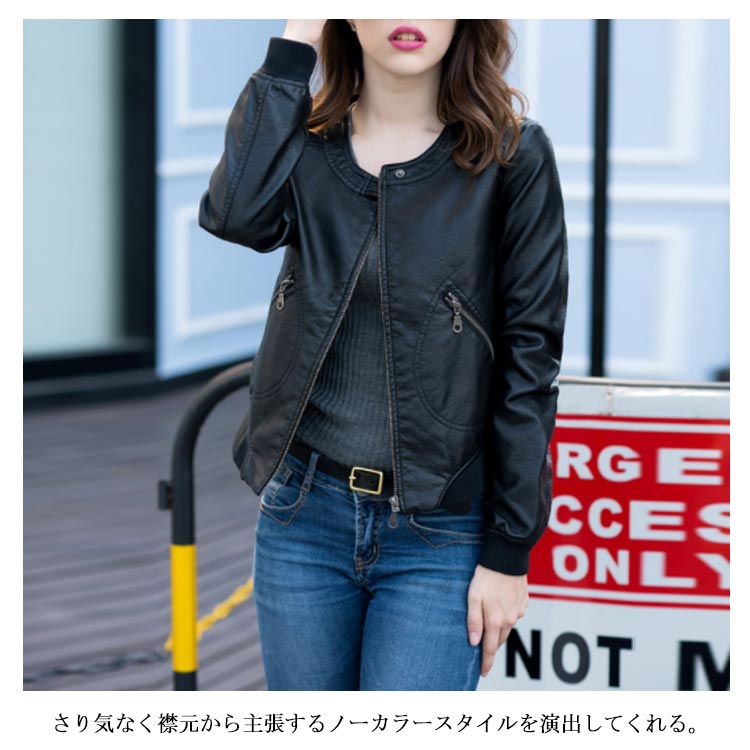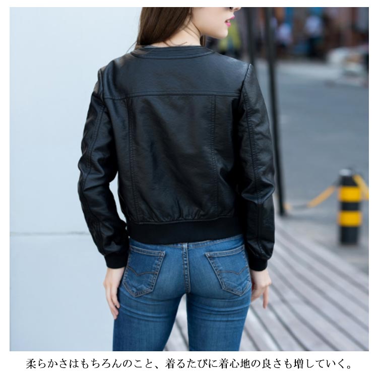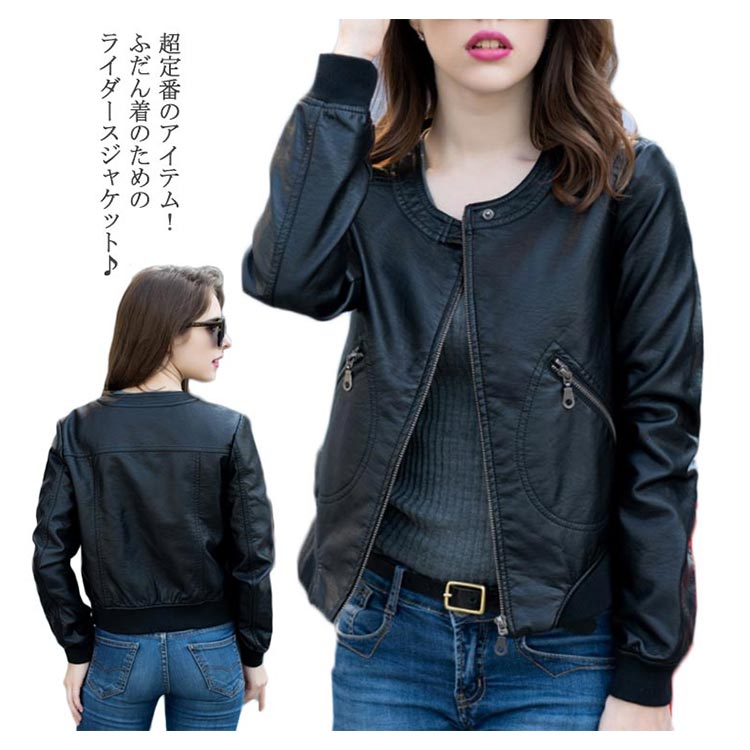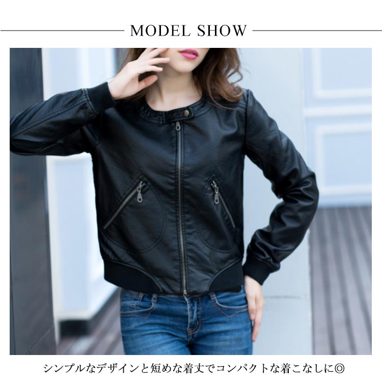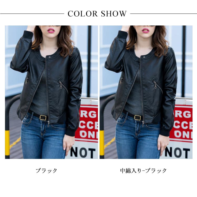 ライダースジャケット ショート丈 革ジャン レディース レザージャケット 中綿入り ブルゾン アウター ラウンドネック 体型カバー 大きいサイズ ブラック 春秋冬