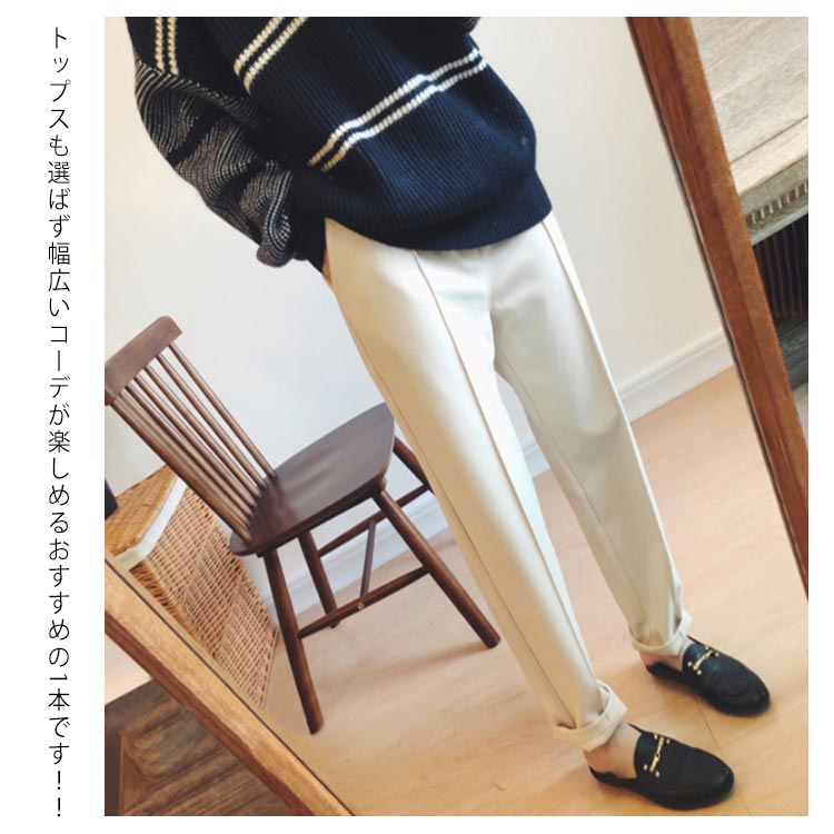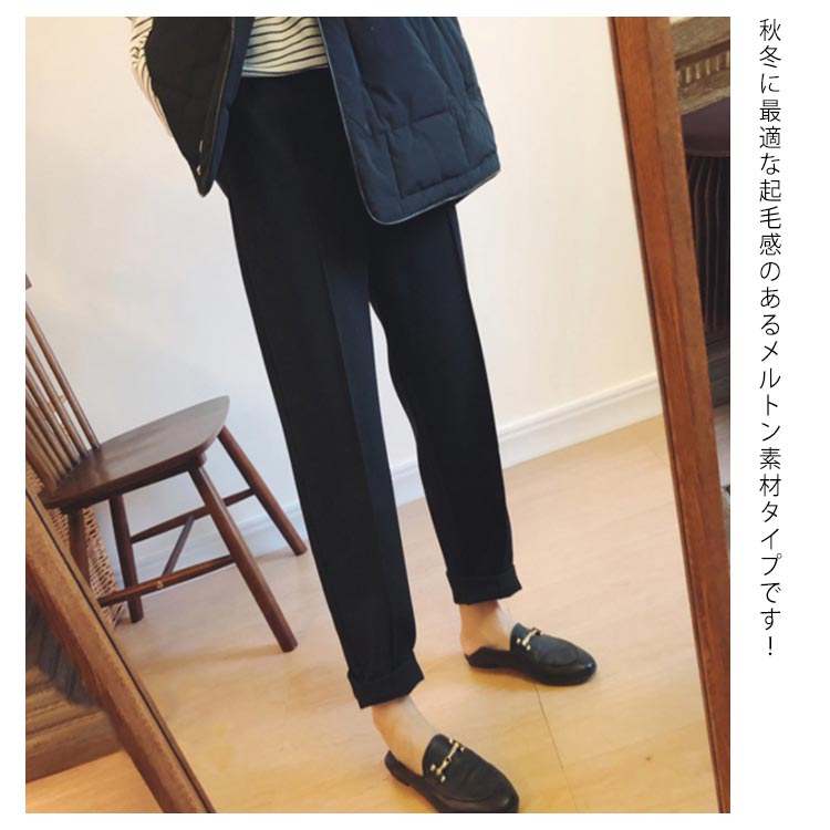 | 全3色×7サイズ!テーパードのシルエットで、キレイなシーンでも履ける新作パンツ。 美脚効果抜群で着用感が良い九分丈に 裾に向けてすっきりとしたデザインです。 秋冬に最適な起毛感のあるメルトン素材タイプです! ウエストゴムtypeだから楽チン。 ヒールでキレイめに、話題のスリッポンでカジュアルに…♪ トップスも選ばず幅広いコーデが楽しめるおすすめの1本です!! | |