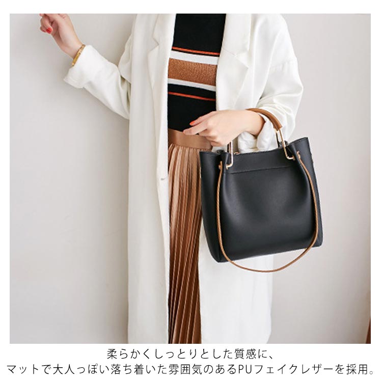 | 程よく抜け感のあるシンプルさが大人コーデにぴったりな2wayバッグ。 手持ちやショルダーバッグとして肩かけでも使える2way仕様。 幅広マチで手回り品だけでなく書物まで入る収納力! 柔らかくしっとりとした質感に、マットで大人っぽい落ち着いた雰囲気のあるPUフェイクレザーを採用。 上品に持てるコンパクトなサイズ感でお出かけにも最適です。 | |