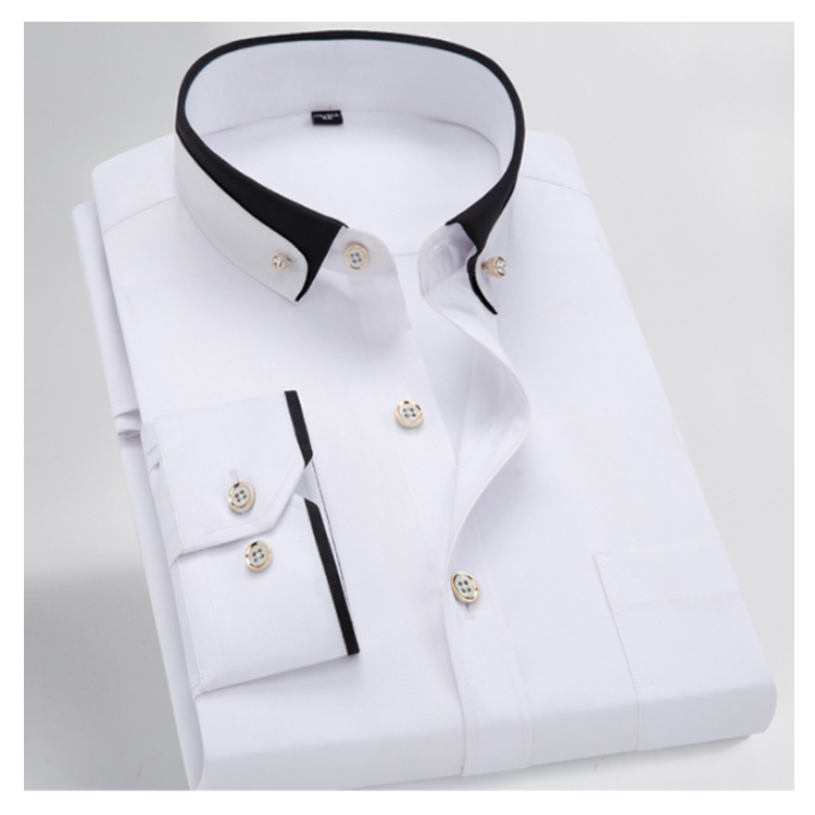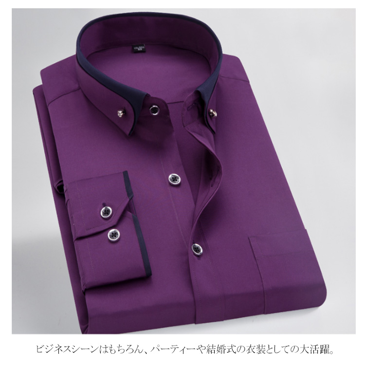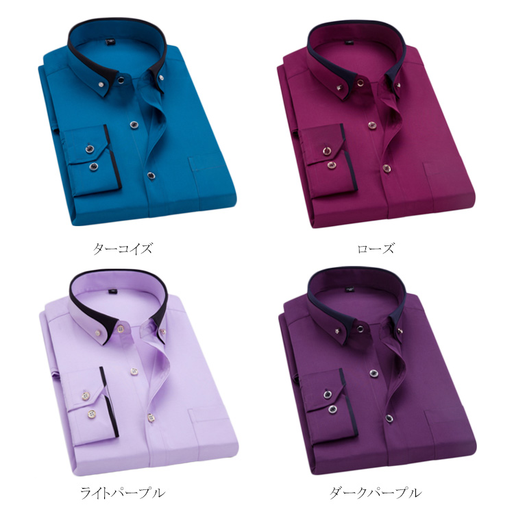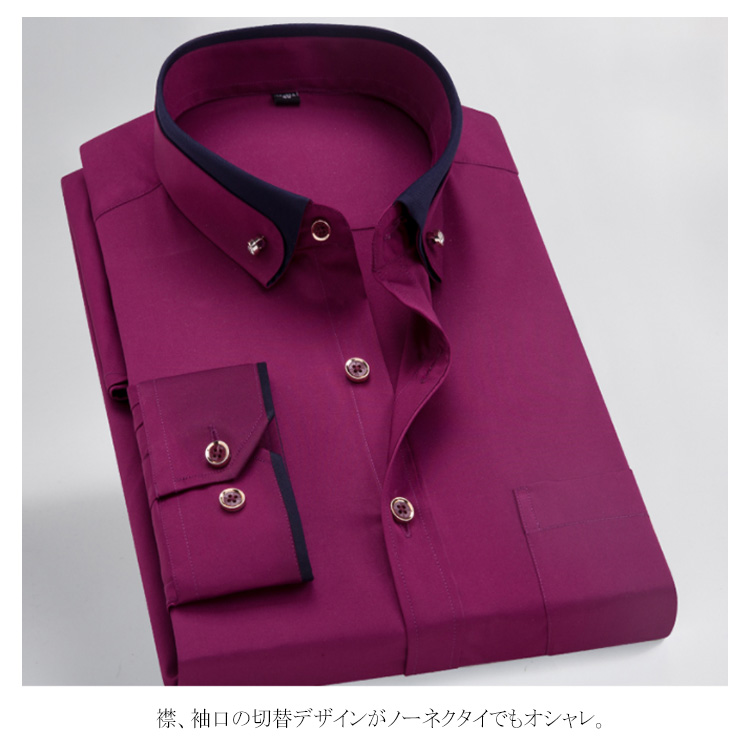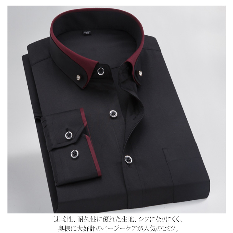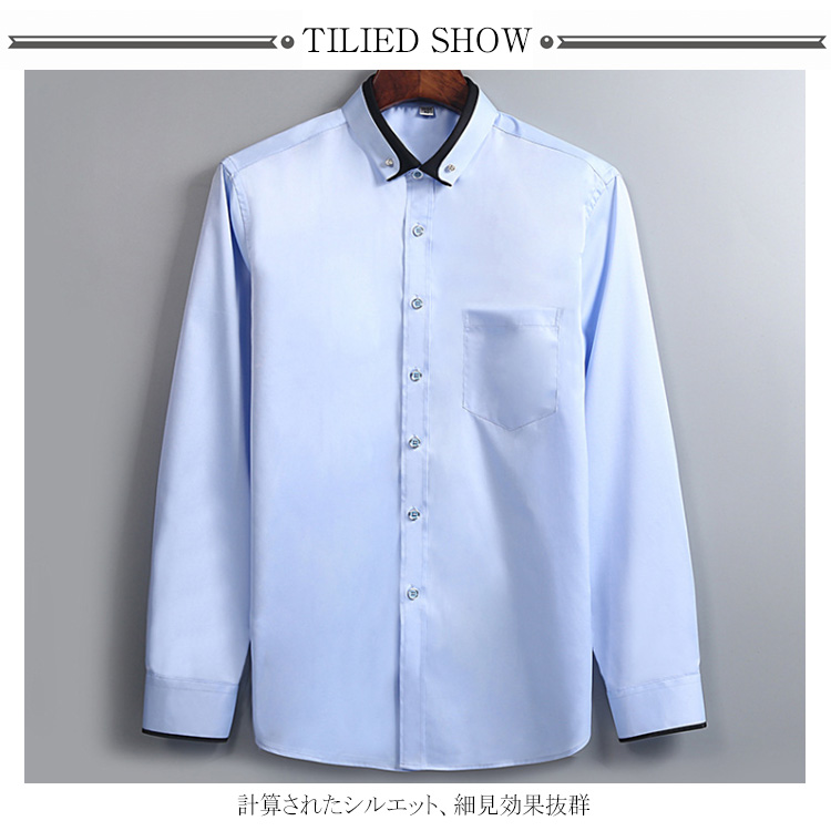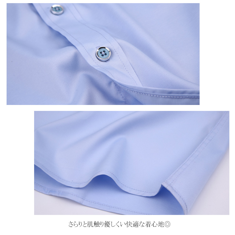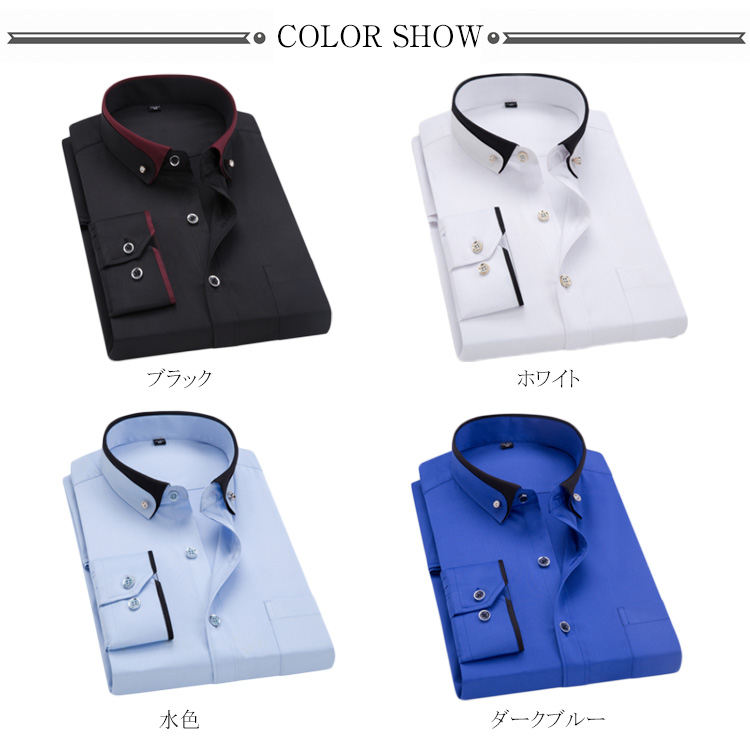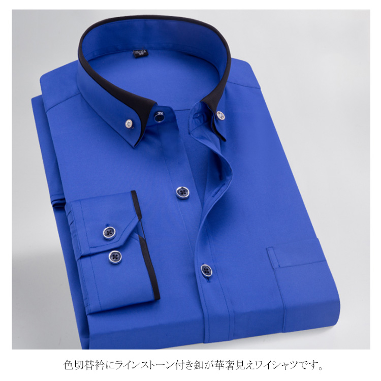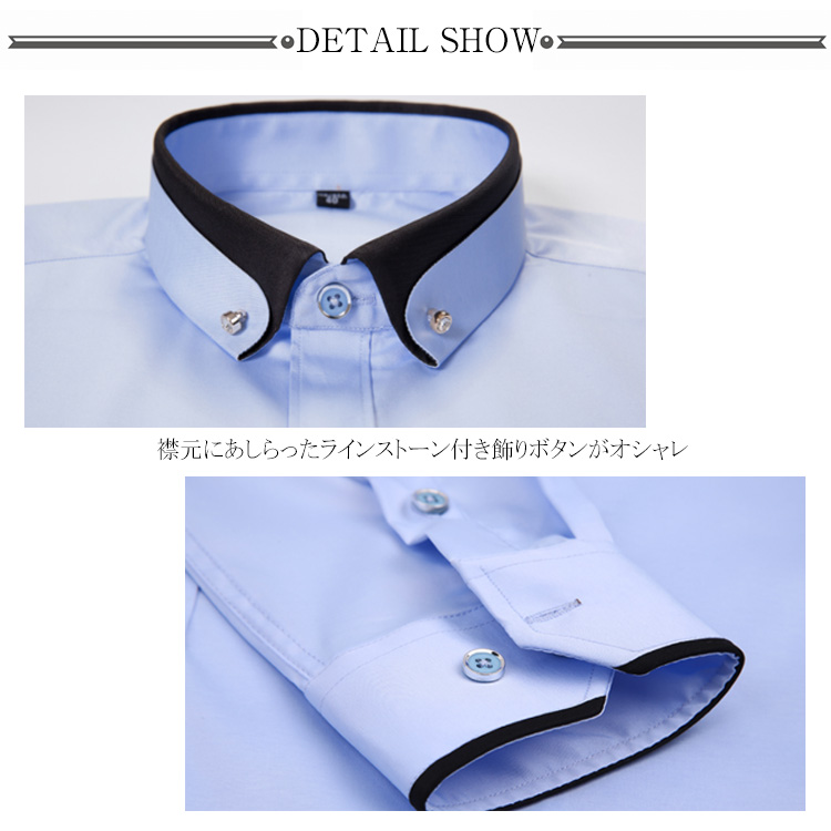 | 華やかな衿デザインが魅力的♪ 色切替衿にラインストーン付き釦が華奢見えワイシャツです。 シックで凛々しい印象を醸してくれる一枚に仕上がり。 襟、袖口の切替デザインがノーネクタイでもオシャレ。 速乾性、耐久性に優れた生地、シワになりにくく、奥様に大好評のイージーケアが人気のヒミツ。 ややストレッチあり、動きやすい。 ビジネスシーンはもちろん、パーティーや結婚式の衣装としての大活躍。 | |