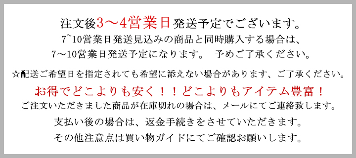 ●色合いはモニター環境により若干の誤差が出ます。 ●綿混合商品は洗濯時に多少縮む事がございます。 ●本製品は生産過程におきまして、生地を織る際の糸の継ぎ目や多少のほつれが生じることがありまが、品質上は問題ありません。また、生地の織りに他繊維が混紡している場合もございます。 ▼色落ちの恐れがございますので、他のものとは分けて洗濯してください。 ▼タンブラー乾燥はお避け下さい。 ▼洗濯の際は他の物と区別して、漂白剤を避け、手洗いを お勧めします。 | |