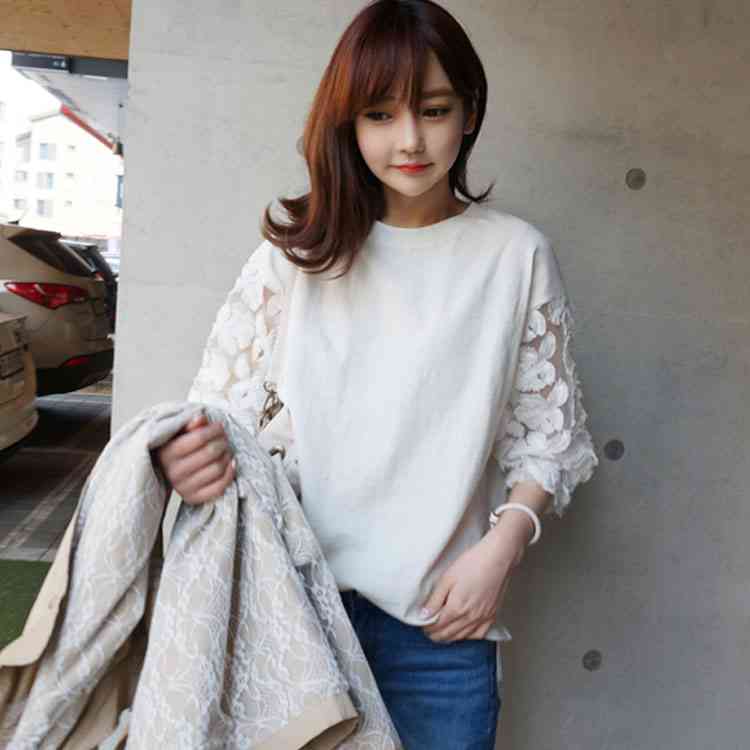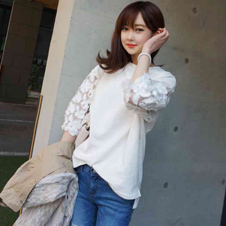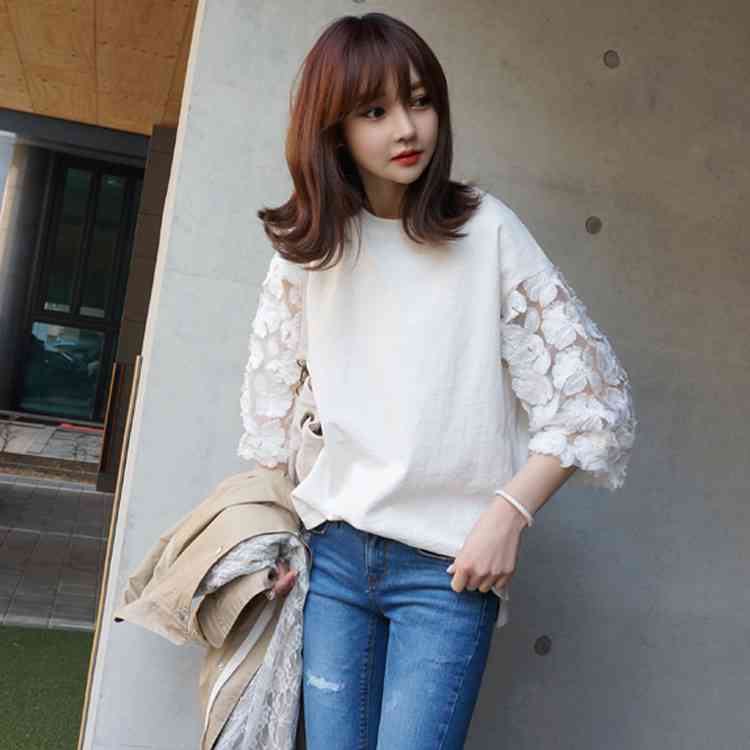 Tシャツ カットソー 七分袖 トップス 刺繍レース 切り替え レディース ラウンドネック フラワーレース 花柄 刺繍 レース 白 ホワイト 春 夏 大
