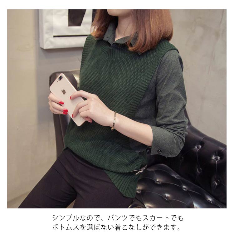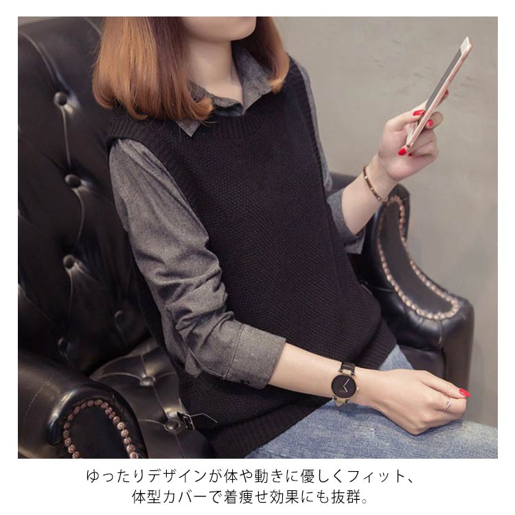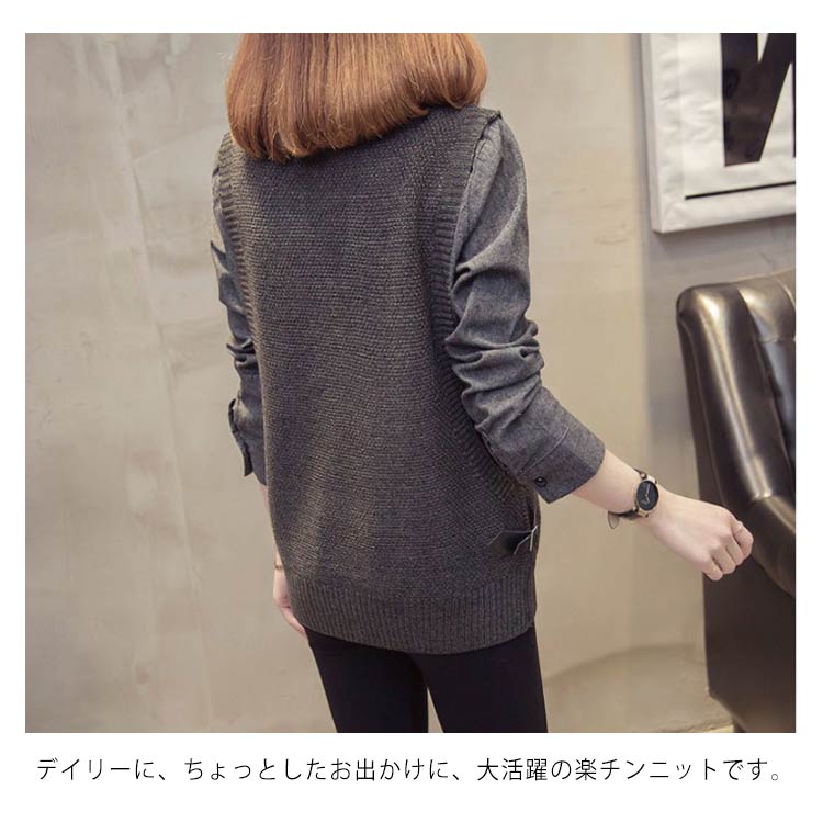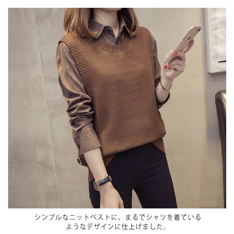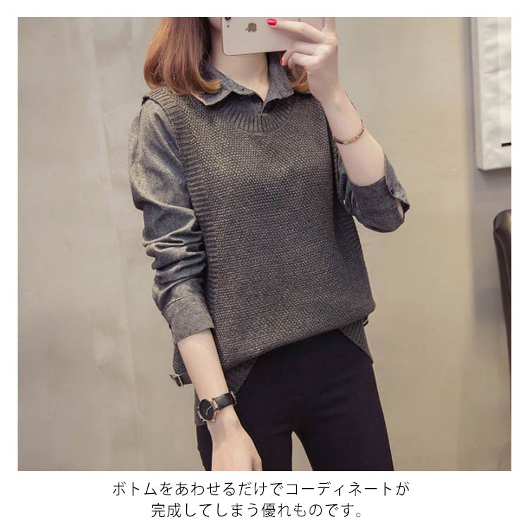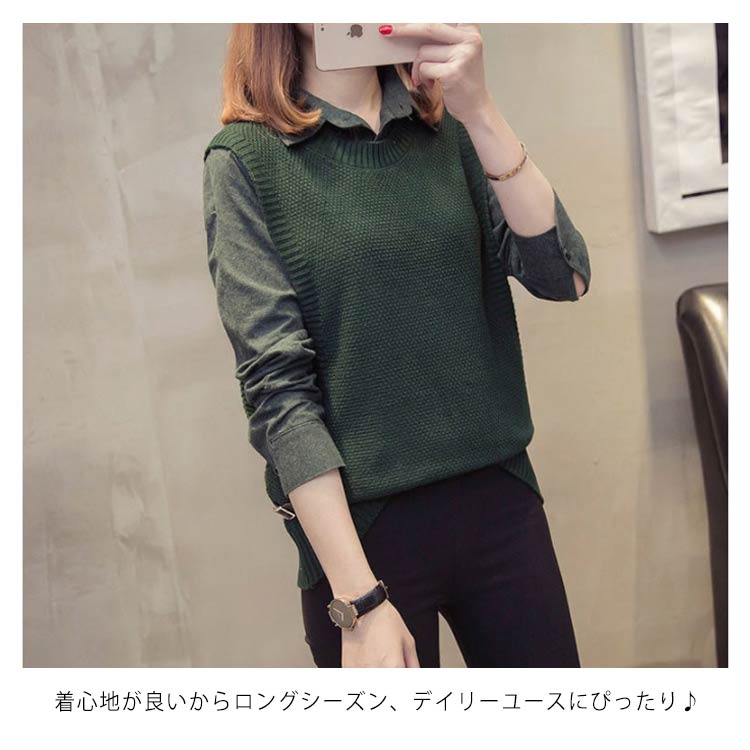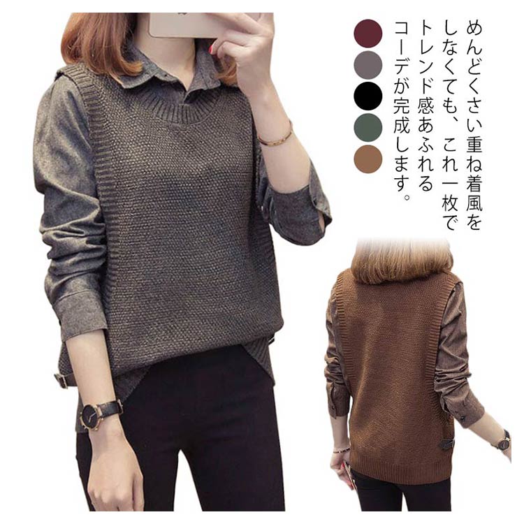 レディース トップス 重ね着風 チュニック セーター ニットセーター ニットベスト レイヤード風 シャツ ブラウス プルオーバー 長袖 カットソー 体型カバー レディースファッション 大人可愛い ナチュラル カジュアル 春秋