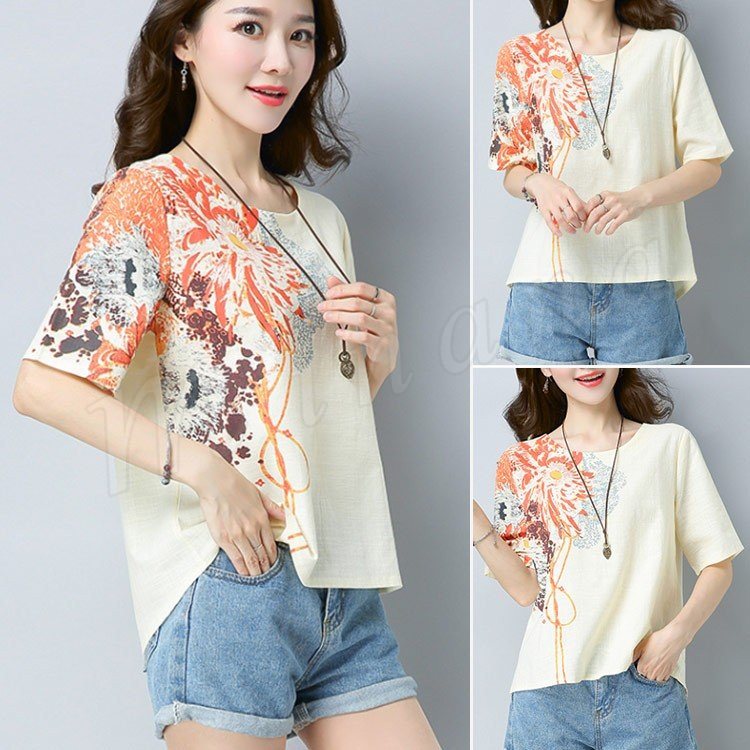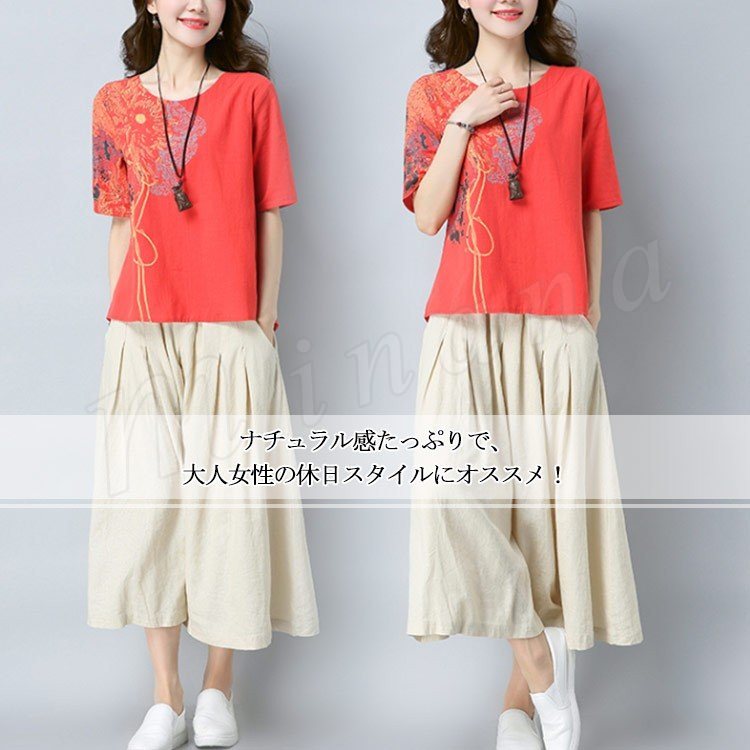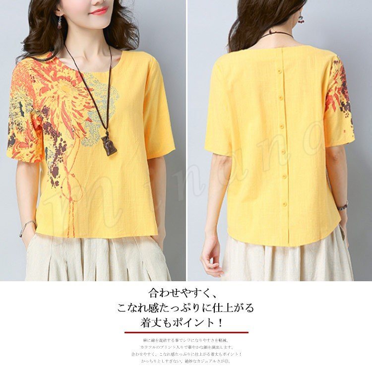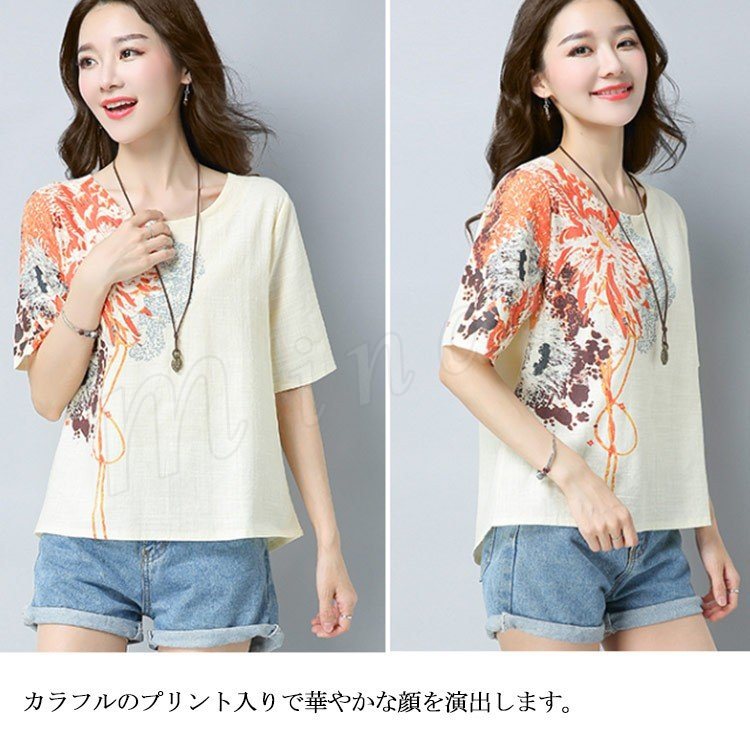 【】M-6Lサイズ!綿麻トップス レディース リネン トップス tシャツ ブラウス 半袖 プリントtシャツ エスニック風 ショート丈 大きサイ