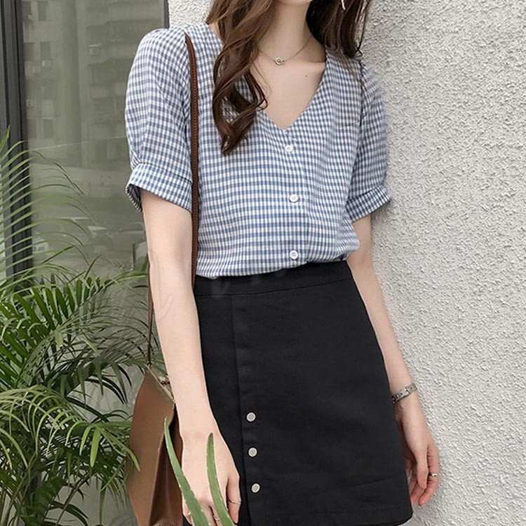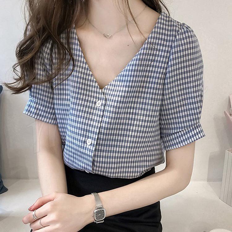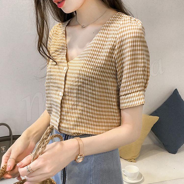 シャツブラウス Vネック チェック柄 半袖 レディース トップス チュニック フェミニン エレガント 通勤 スタイリッシュ OL 新作