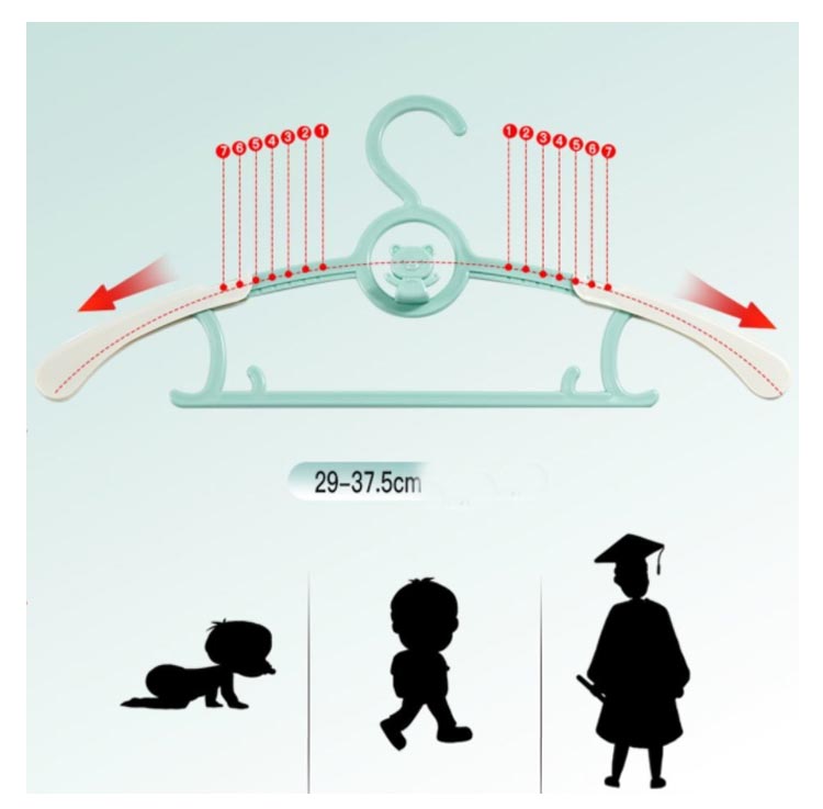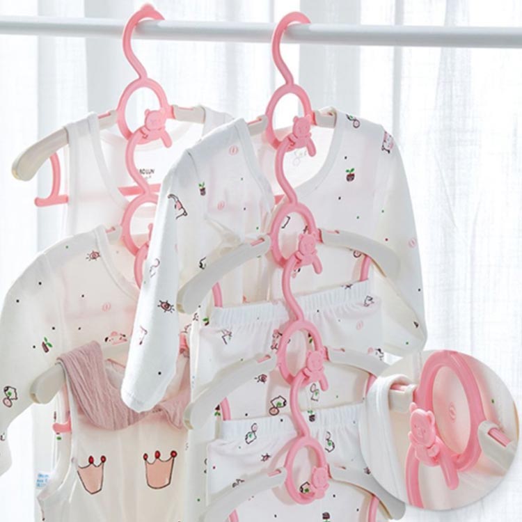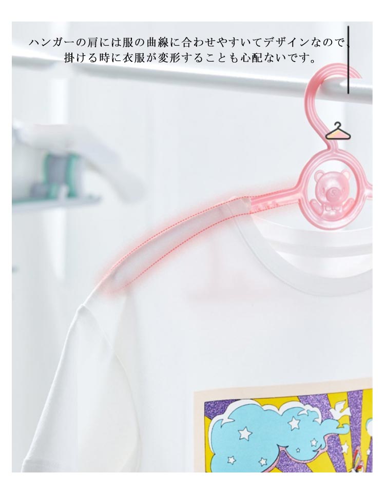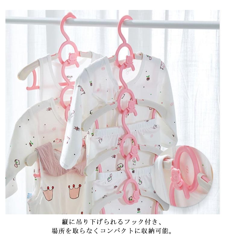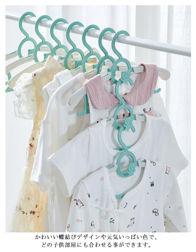 キッズ服のサイズによってアームが伸びるハンガー。かわいい蝶結びデザインや元気いっぱい色で、どの子供部屋にも合わせる事ができます。縦に吊り下げられるフック付き、場所を取らなくコンパクトに収納可能。ハンガーの肩には服の曲線に合わせやすいてデザインなので、掛ける時に衣服が変形することも心配ないです。