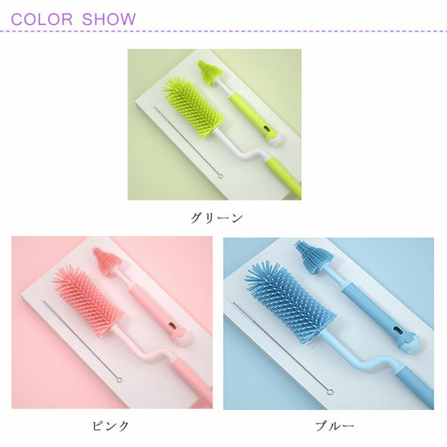 哺乳瓶やその部品を洗う専用のブラシ3点セットです。シリコンブラシは汚れを効果的に落とし、乾きも早く、細菌が繁殖しにくいので衛生的です。環境に優しいシリコン製で、耐久性に優れた高温も耐えるので安心です。360度回転可能なブラシハンドルで、ボトルの隅々まで汚れをこすり落とします。おしゃぶりブラシは乳首型なので、内部を深く洗浄できる。ストローブラシは、ストローの内側を洗うのに便利です。(ご注意:高温で殺菌する場合は、ハンドルを外してください。ハンドルはPP樹脂製で、ただ80℃の耐熱性があります。)