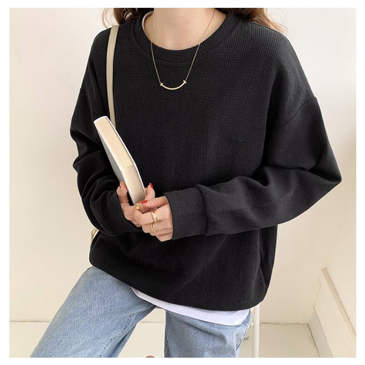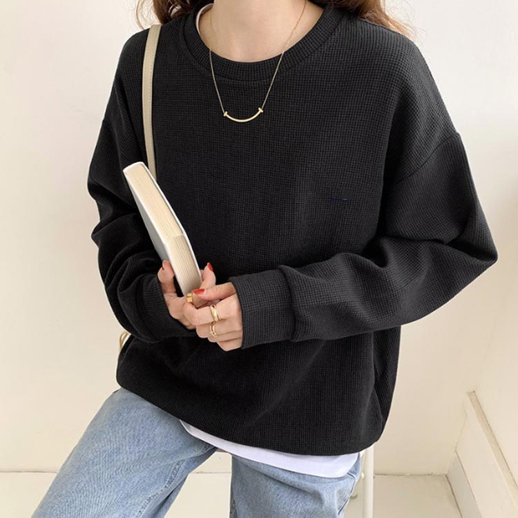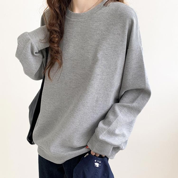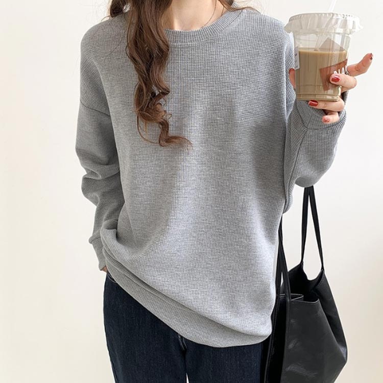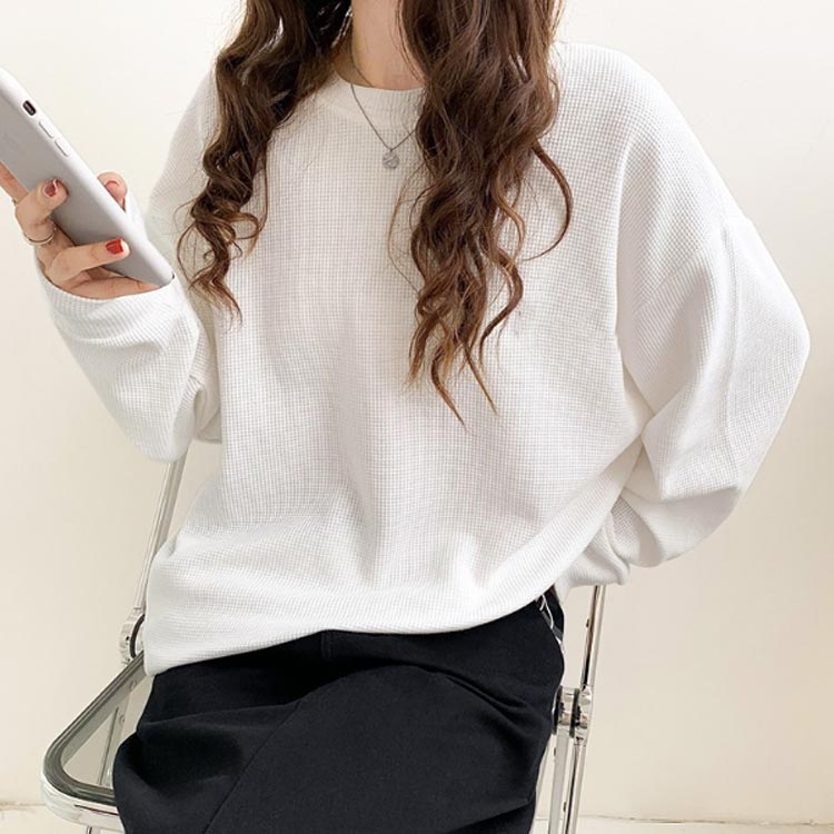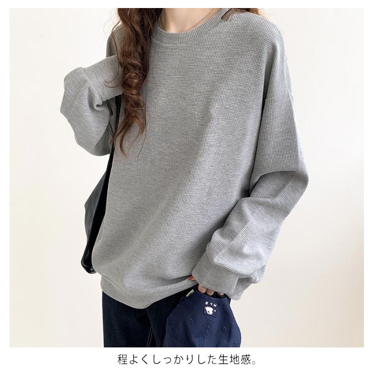 【送料無料】 Tシャツ カットソー レディース トップス 長袖 ワッフル ゆったり 春 秋 ワッフルカットソー ラウンドネック プルオーバー ワッフルトレーナー 黒 白 ブラック グレー ホワイト