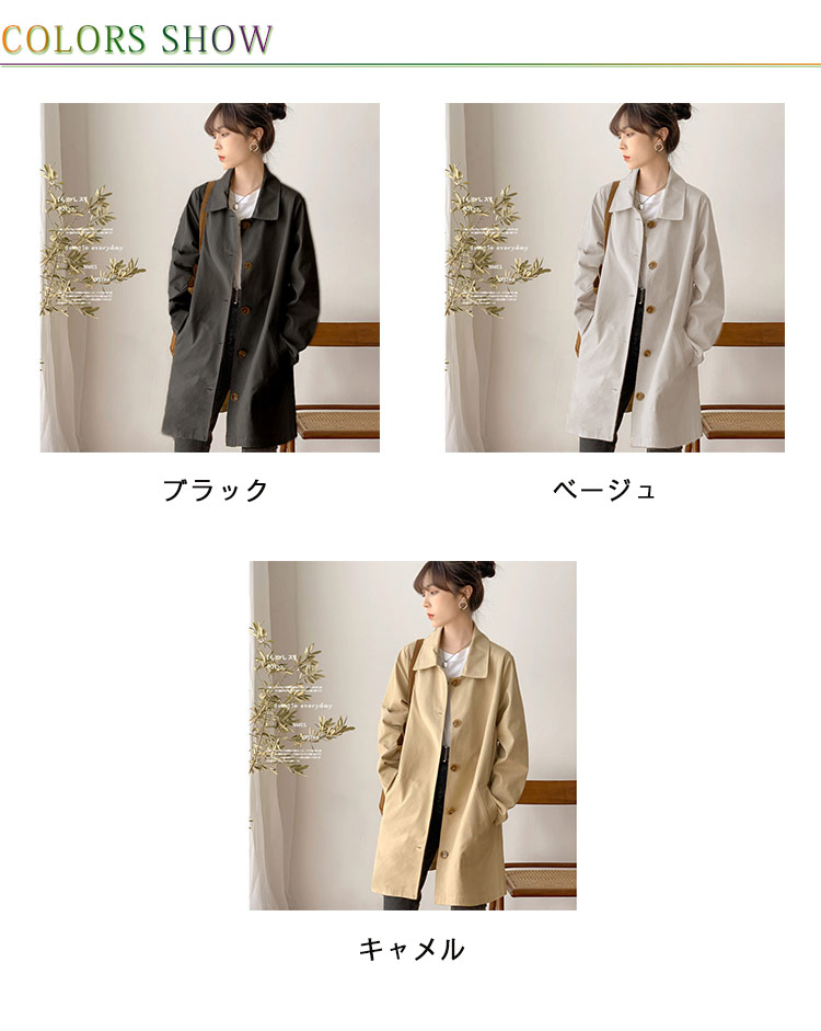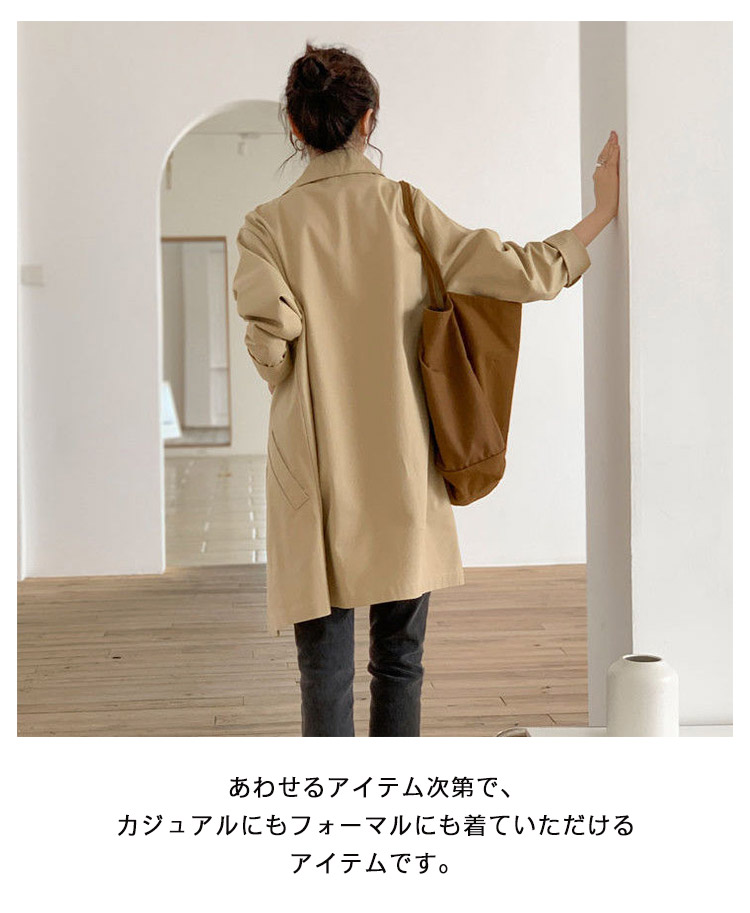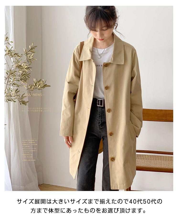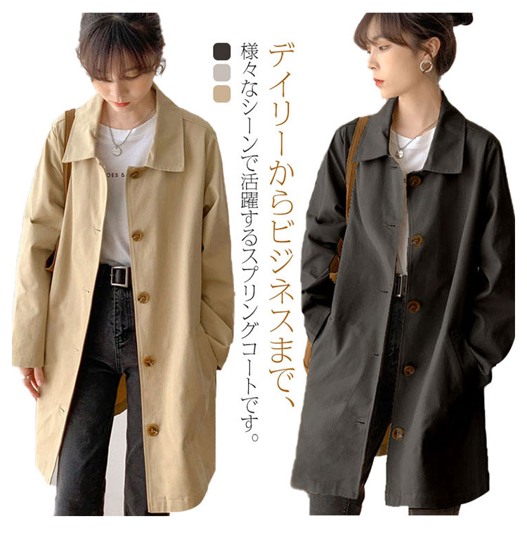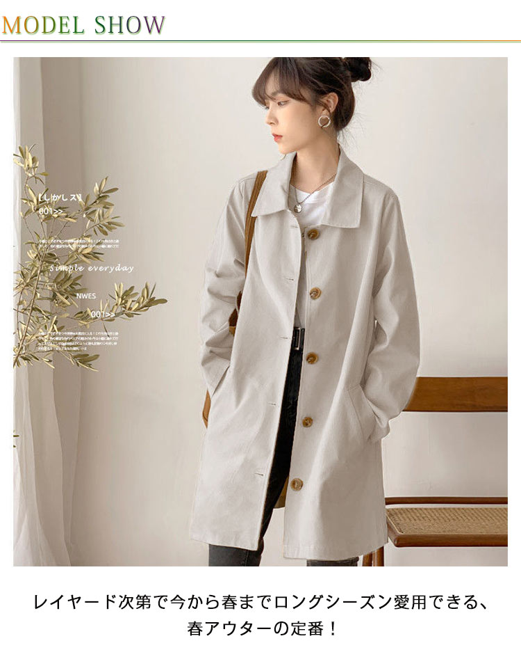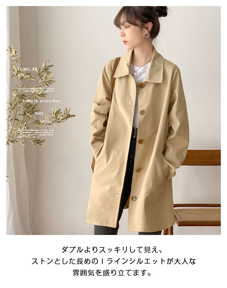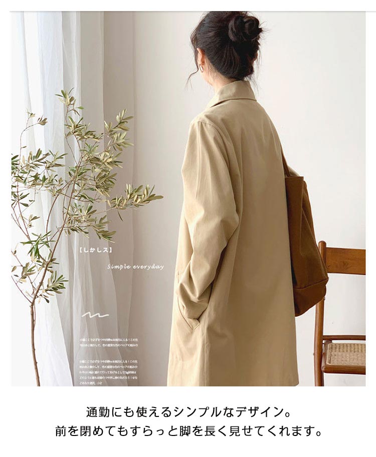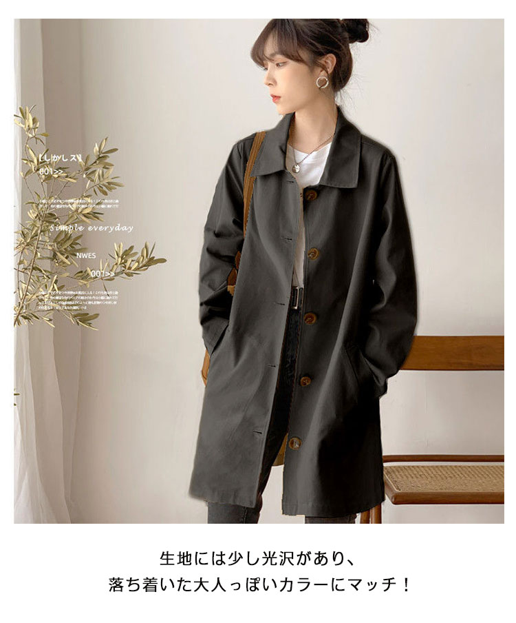 デイリーからビジネスまで、様々なシーンで活躍するスプリングコートです。レイヤード次第で今から春までロングシーズン愛用できる、春アウターの定番!生地には少し光沢があり、落ち着いた大人っぽいカラーにマッチ!ダブルよりスッキリして見え、ストンとした長めのIラインシルエットが大人な雰囲気を盛り立てます。あわせるアイテム次第で、カジュアルにもフォーマルにも着ていただけるアイテムです。通勤にも使えるシンプルなデザイン。前を閉めてもすらっと脚を長く見せてくれます。サイズ展開は大きいサイズまで揃えたので40代50代の方まで体型にあったものをお選び頂けます。