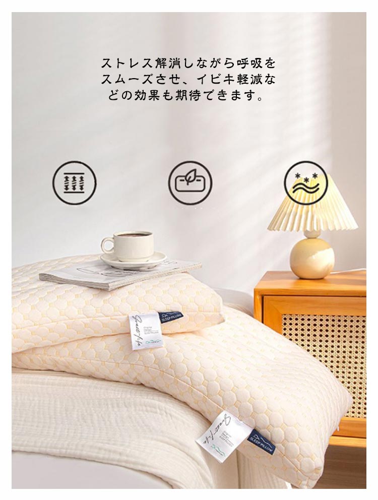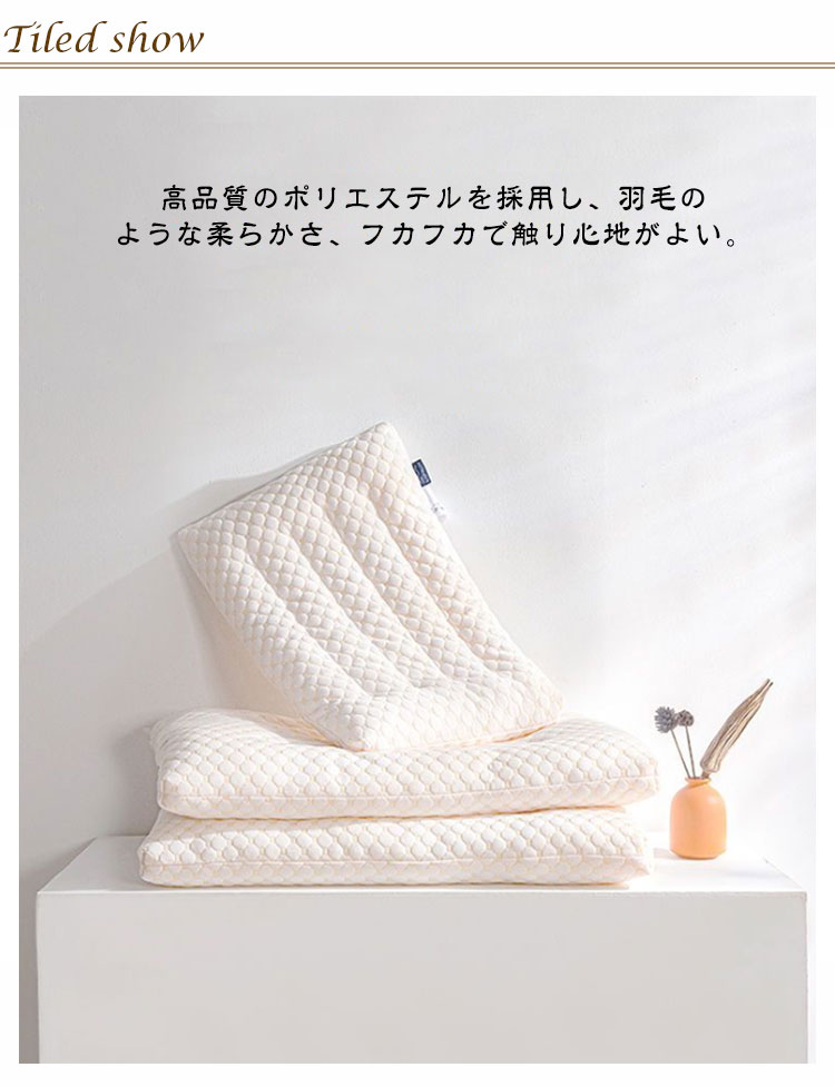 頭全体を優しくサポートでき、爽やかな睡眠環境を与えられ、気持ちよく眠れる枕。高品質のポリエステルを採用し、羽毛のような柔らかさ、フカフカで触り心地がよい。カバーにはお肌に優しい素材を採用し、柔らかくて手触り良い、通気性に良い。ストレス解消しながら呼吸をスムーズさせ、イビキ軽減などの効果も期待できます。変形しにくく、家庭用洗濯機で丸洗いができ、いつも清潔保つ。