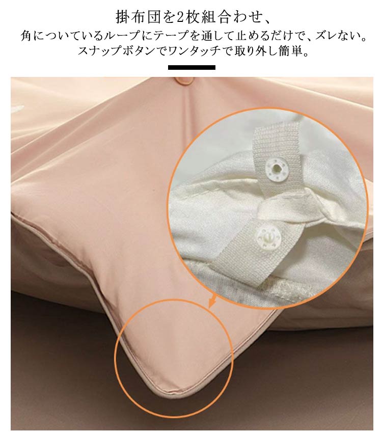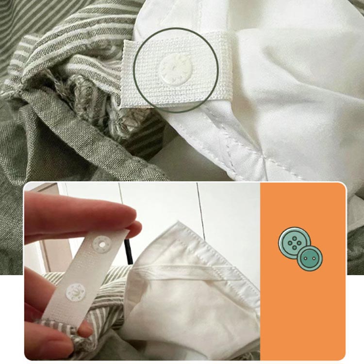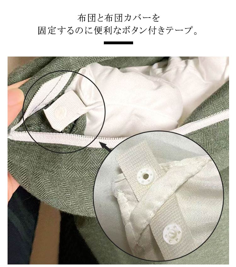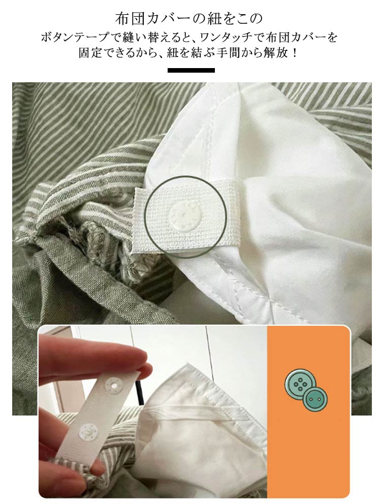 | 紐を結ぶ手間から解放!布団カバーの交換がラクになる。 布団と布団カバーを固定するのに便利なボタン付きテープ。 掛布団を2枚組合わせ、角についているループにテープを通して止めるだけで、ズレない。スナップボタンでワンタッチで取り外し簡単。 布団カバーの紐をこのボタンテープで縫い替えると、ワンタッチで布団カバーを固定できるから、紐を結ぶ手間から解放! 発送は16本分繋がって発送いただけます。ハサミで切ってご利用してくだい。 | |