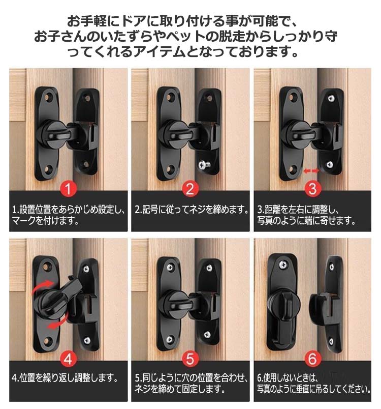| ドアや窓のセキュリティーに役立つ後付けドアロック。 ねじでしっかり固定するタイプですので、丈夫で長持ちとなっております。 お手軽にドアに取り付ける事が可能で、お子さんのいたずらやペットの脱走からしっかり守ってくれるアイテムとなっております。 また、90度も180度も取り付けられるから、開き戸も引き戸も様々なドアに対応できます。 子供ケガ防止だけでなく、部屋の外に出ていかないようにしたり、様々な危険を防止できます。 簡単施錠でスライドドアの防犯対策ができます。猫の脱走防止用としてもお使いいただけます。 | |