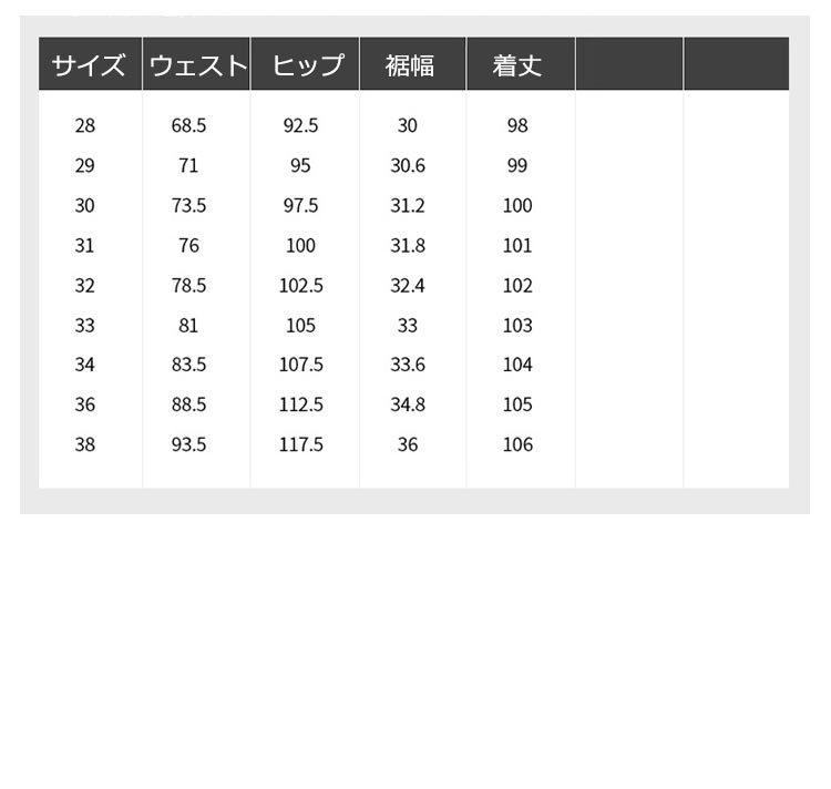 | サイズ | 28 29 30 31 32 33 34 36 38 |