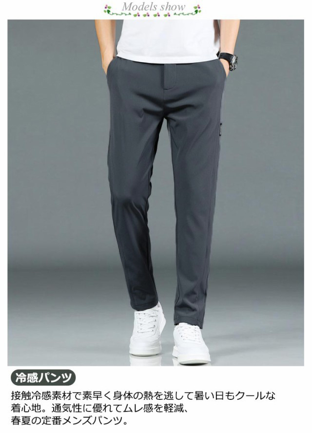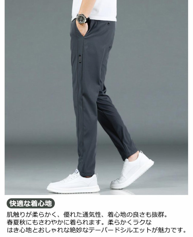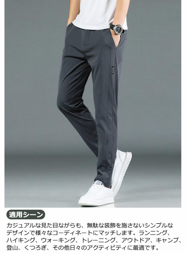 【冷感パンツ】接触冷感素材で素早く身体の熱を逃して暑い日もクールな着心地。通気性に優れてムレ感を軽減、春夏の定番メンズパンツ。【ストレッチパンツ】伸縮自在のストレッチ素材を採用し、よく伸びるからアクテイブな動きもストレスなく快適◎【快適な着心地】肌触りが柔らかく、優れた通気性、着心地の良さも抜群。春夏秋にもさわやかに着られます。柔らかくラクなはき心地とおしゃれな絶妙なテーパードシルエットが魅力です。【適用シーン】カジュアルな見た目ながらも、無駄な装飾を施さないシンプルなデザインで様々なコーディネートにマッチします。ランニング、ハイキング、ウォーキング、トレーニング、アウトドア、キャンプ、登山、くつろぎ、その他日々のアクティビティに最適です。