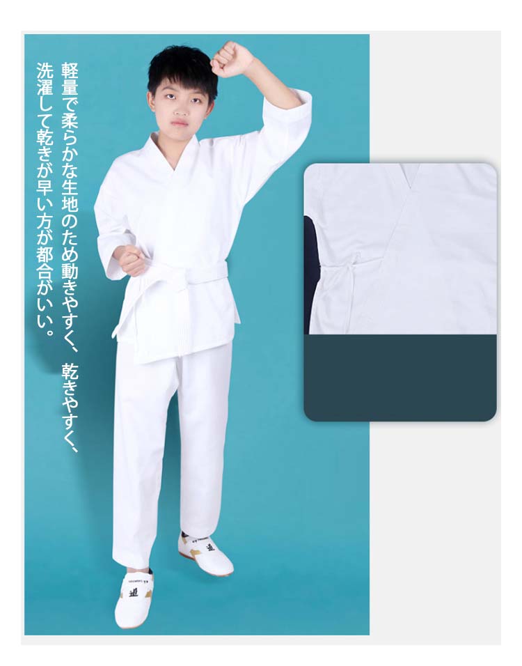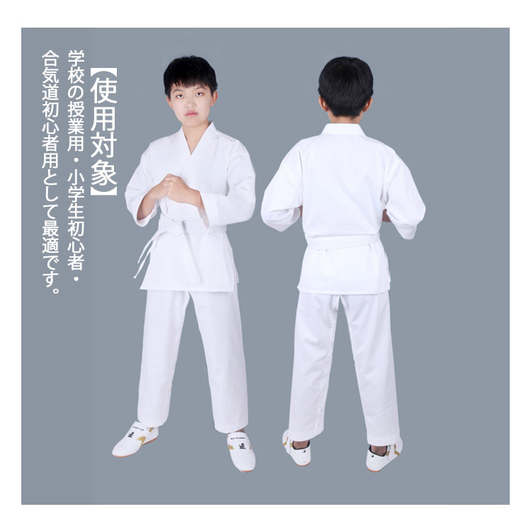 【3点セット】【子供~大人】【100-180cm】入門者向けの空手着 上下白帯 3点セット上着とパンツ、白帯がセットになっているので、これから空手を始めてみたい人、試しに習ってみたい人におすすめ。通気性、快適性、耐変形・耐摩耗性、柔らかな生地、手触りにも優れています。パンツのウエストはゴムと紐仕様で子供でも履きやすい軽量で柔らかな生地のため動きやすく、乾きやすく、洗濯して乾きが早い方が都合がいい。【使用対象】学校の授業用・小学生初心者・合気道初心者用として最適です。