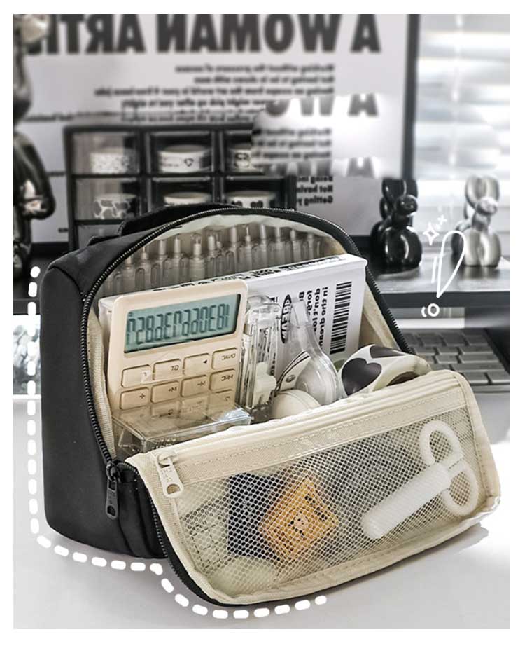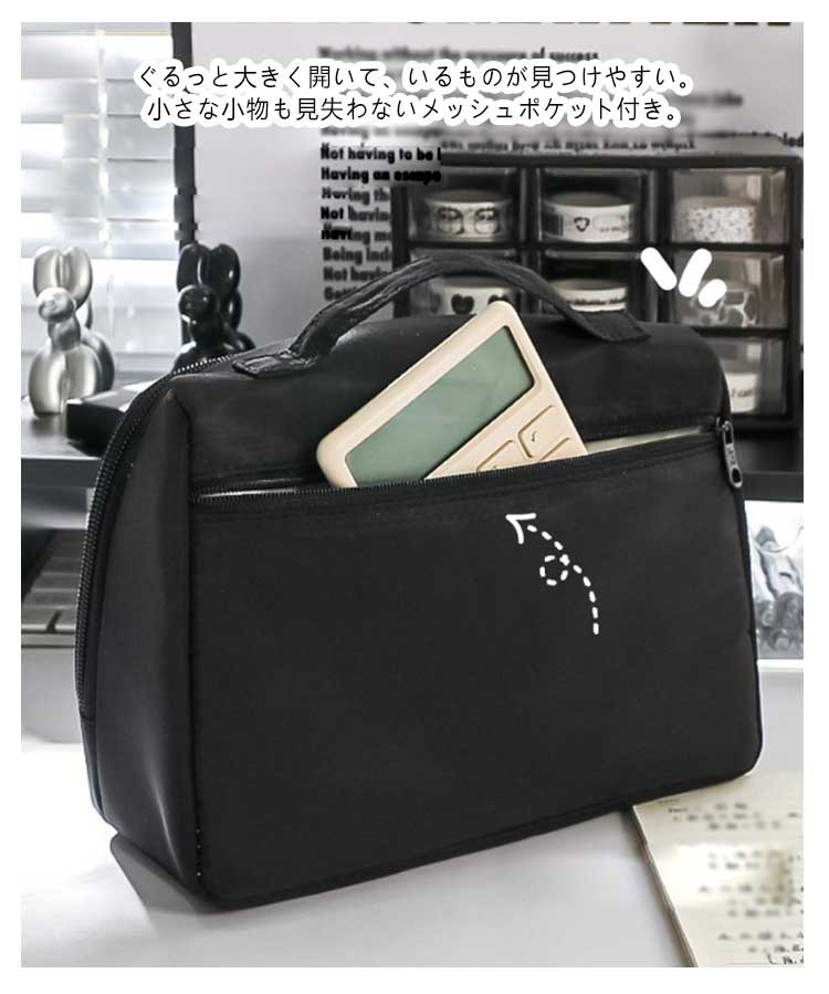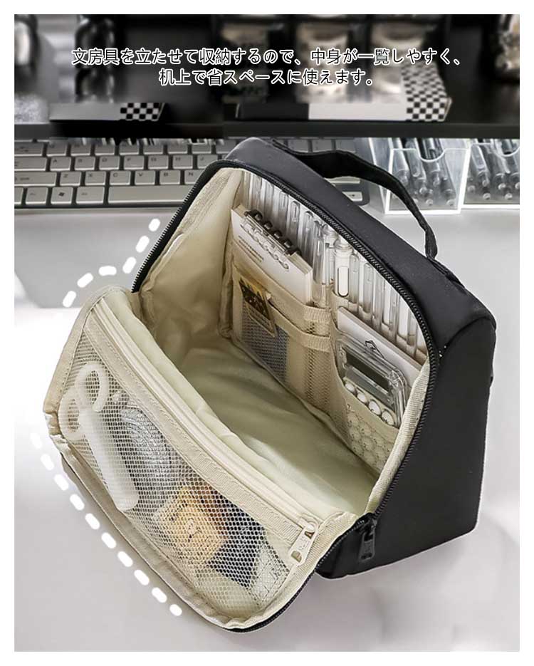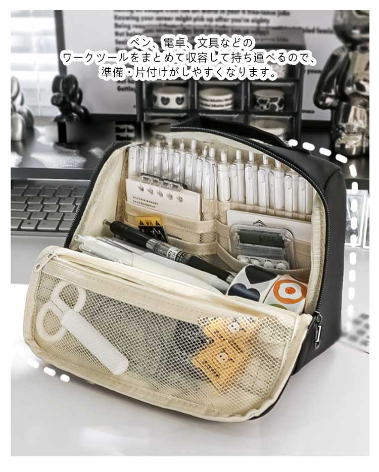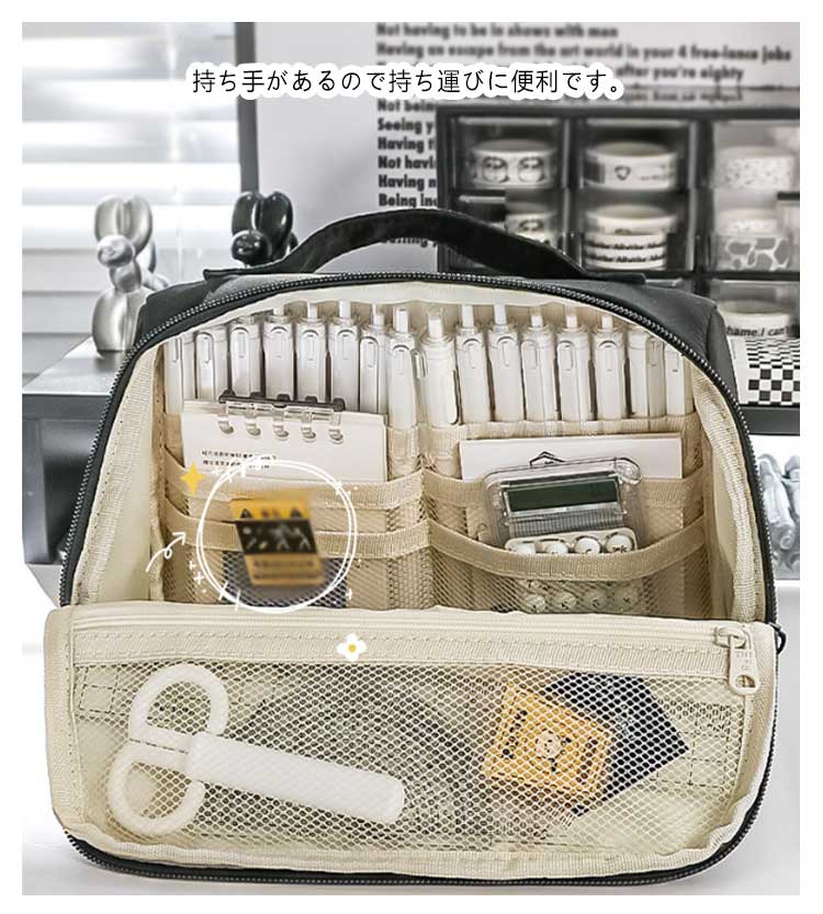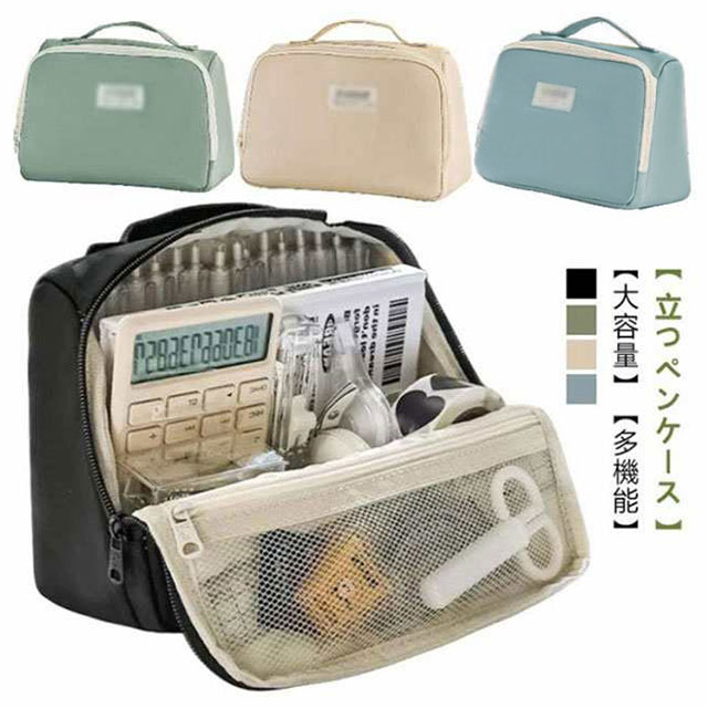 | 【立つペンケース】【大容量】【多機能】 文房具を立たせて収納するので、中身が一覧しやすく、机上で省スペースに使えます。 ぐるっと大きく開いて、いるものが見つけやすい。 小さな小物も見失わないメッシュポケット付き。 持ち手があるので持ち運びに便利です。 ペン、電卓、文具などのワークツールをまとめて収容して持ち運べるので、準備?片付けがしやすくなります。 | |