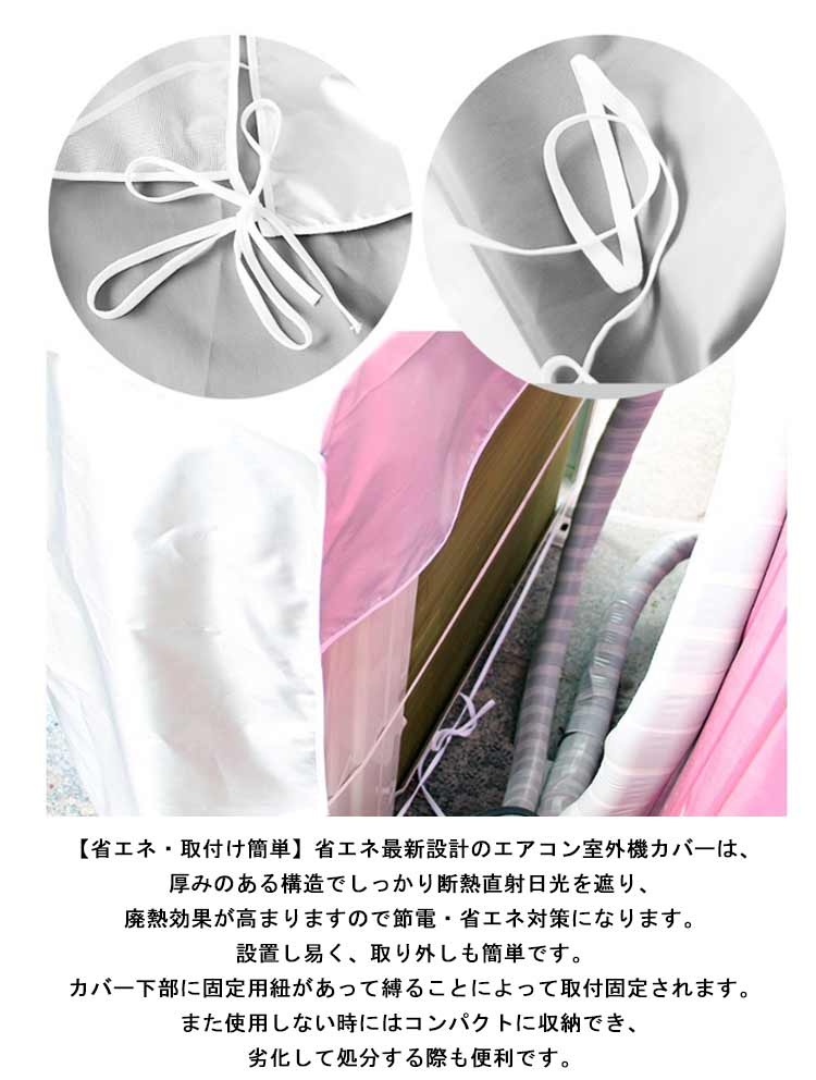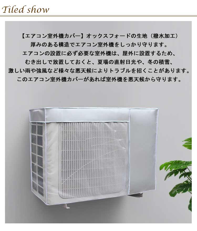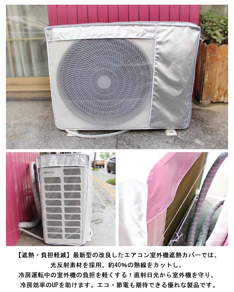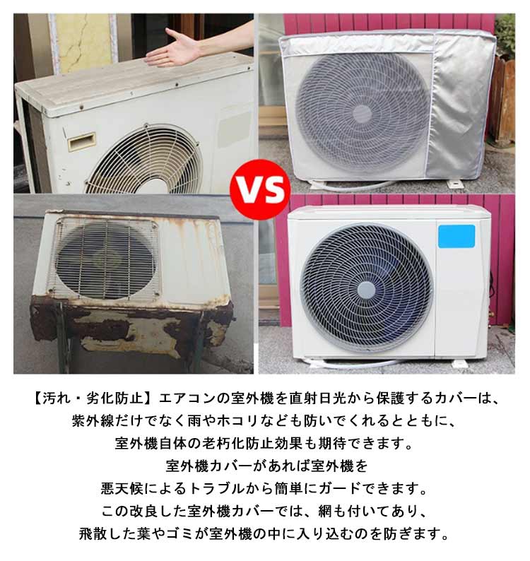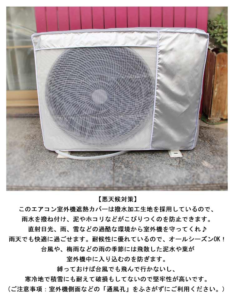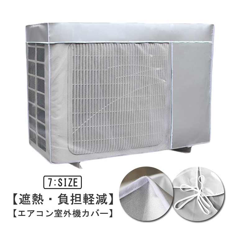 【エアコン室外機カバー】オックスフォードの生地(撥水加工)厚みのある構造でエアコン室外機をしっかり守ります。エアコンの設置に必ず必要な室外機は、屋外に設置するため、むき出しで放置しておくと、夏場の直射日光や、冬の積雪、激しい雨や強風など様々な悪天候によりトラブルを招くことがあります。このエアコン室外機カバーがあれば室外機を悪天候から守ります。【汚れ・劣化防止】エアコンの室外機を直射日光から保護するカバーは、紫外線だけでなく雨やホコリなども防いでくれるとともに、室外機自体の老朽化防止効果も期待できます。室外機カバーがあれば室外機を悪天候によるトラブルから簡単にガードできます。この改良した室外機カバーでは、網も付いてあり、飛散した葉やゴミが室外機の中に入り込むのを防ぎます。【遮熱・負担軽減】最新型の改良したエアコン室外機遮熱カバーでは、光反射素材を採用、約40%の熱線をカットし、冷房運転中の室外機の負担を軽くする!直射日光から室外機を守り、 冷房効率のUPを助けます。エコ・節電も期待できる優れな製品です。【省エネ・取付け簡単】省エネ最新設計のエアコン室外機カバーは、厚みのある構造でしっかり断熱直射日光を遮り、廃熱効果が高まりますので節電・省エネ対策になります。設置し易く、取り外しも簡単です。カバー下部に固定用紐があって縛ることによって取付固定されます。また使用しない時にはコンパクトに収納でき、劣化して処分する際も便利です。【悪天候対策】このエアコン室外機遮熱カバーは撥水加工生地を採用しているので、雨水を撥ね付け、泥やホコリなどがこびりつくのを防止できます。直射日光、雨、雪などの過酷な環境から室外機を守ってくれ♪雨天でも快適に過ごせます。耐候性に優れているので、オールシーズンOK!台風や、梅雨などの雨の季節には飛散した泥水や葉が室外機中に入り込むのを防ぎます。縛っておけば台風でも飛んで行かないし、寒冷地で積雪にも耐えて破損もしてないので堅牢性が高いです。(ご注意事項:室外機側面などの「通風孔」をふさがずにご利用ください。)