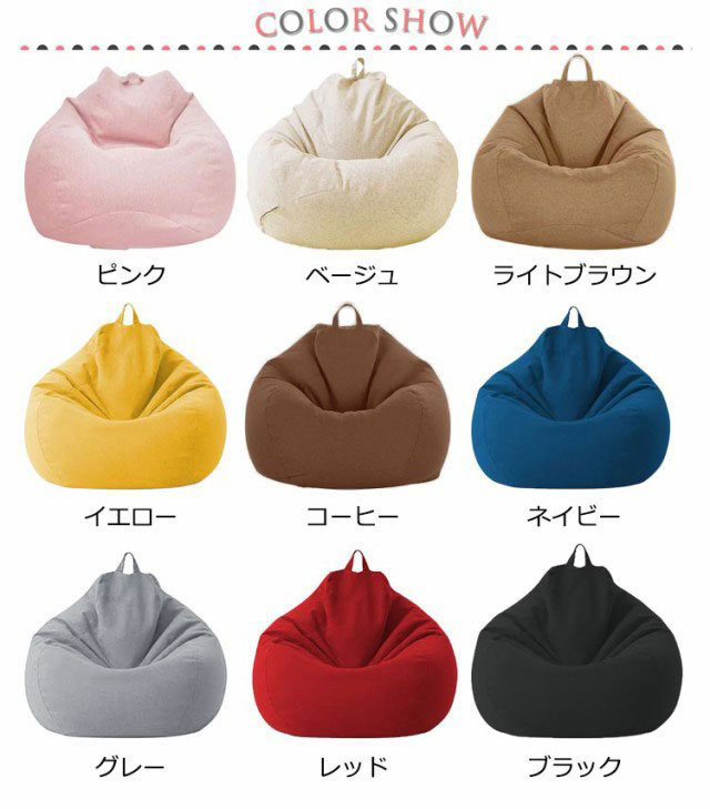 | 全9色の豊富なカラーバリエーションがあるクッションカバー。 オールシーズン使用可能な綿麻調ビーズクッションカバー。 シンプルなカラーでどんなお部屋にもおしゃれに合わせやすい、落ち着いた色合い。 ファスナー式で着脱が可能です。 取っ手広くで持っち運びにもっと便利、女性も子供も簡単に移動できます。 洗濯機で丸洗いOK!いつでも清潔。簡単お手入れ。 | |