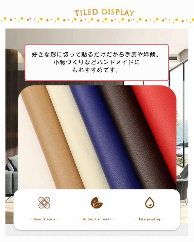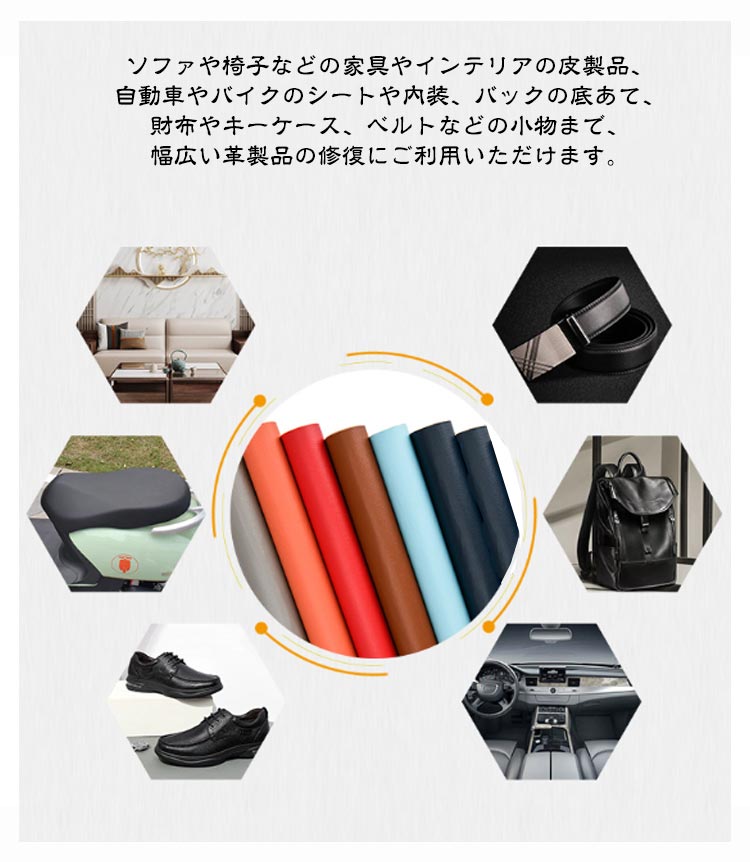 | 合皮シート、5枚入りです。 ソファや椅子などの家具やインテリアの皮製品、自動車やバイクのシートや内装、バックの底あて、財布やキーケース、ベルトなどの小物まで、幅広い革製品の修復にご利用いただけます。 好きな形に切って貼るだけだから手芸や洋裁、小物づくりなどハンドメイドにもおすすめです。 粘着シールでしっかり貼り付けできます。 PUレザーで高級感バッチリです。 | |