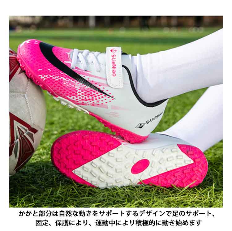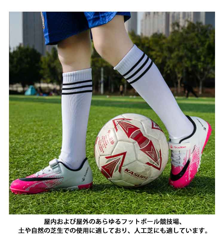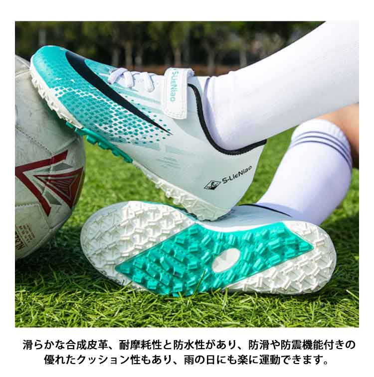 靴紐のつまずきがなく、運動中の安全性を高めます。小さな子でも自分で履き脱ぎラクラクのマジックテープ式サッカーシューズ。滑らかな合成皮革、耐摩耗性と防水性があり、防滑や防震機能付きの優れたクッション性もあり、雨の日にも楽に運動できます。踵部分には保護設計を採用し、足をしっかりと保護。かかと部分は自然な動きをサポートするデザインで足のサポート、固定、保護により、運動中により積極的に動き始めます屋内および屋外のあらゆるフットボール競技場、土や自然の芝生での使用に適しており、人工芝にも適しています。