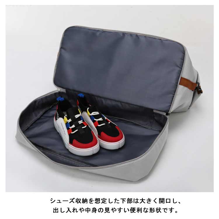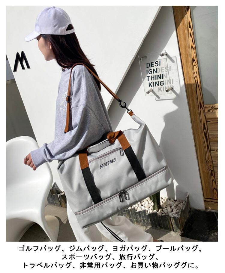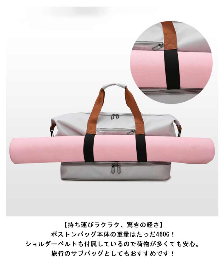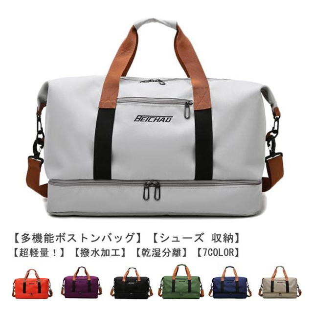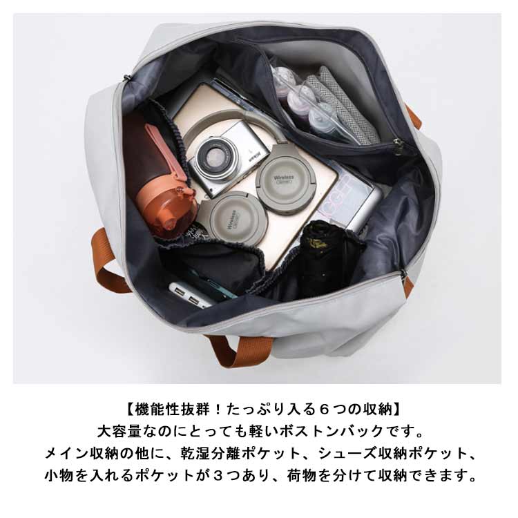 【機能性抜群!たっぷり入る6つの収納】大容量なのにとっても軽いボストンバックです。メイン収納の他に、乾湿分離ポケット、シューズ収納ポケット、小物を入れるポケットが3つあり、荷物を分けて収納できます。シューズ収納を想定した下部は大きく開口し、出し入れや中身の見やすい便利な形状です。【持ち運びラクラク、驚きの軽さ】ボストンバッグ本体の重量はたっだ460g!ショルダーベルトも付属しているので荷物が多くても安心。旅行のサブバッグとしてもおすすめです!【お手入れ簡単!傷がつきにくく丈夫な素材】耐久性が高く、撥水効果のあるポリエステル生地を採用しているので急な雨でも安心。上品な光沢があり、傷もつきにくく、シワもできにくい。汚れた場合は水で手洗いが可能です。【スタイルに合わせて使える3wayタイプ】手持ち、肩掛け、キャリーオンバッグとして3wayで使えます。ゴルフバッグ、ジムバッグ、ヨガバッグ、プールバッグ、スポーツバッグ、旅行バッグ、トラベルバッグ、非常用バッグ、お買い物バッググに。小学生の修学旅行のバッグや出張用としてもおすすめです。【スタイリッシュで洗練されたデザイン】男女問わず、子供から大人まで家族みんなで使えるシンプルなデザインです。スポーツ、アウトドア、旅行などの用途から普段使いまで、あらゆる場面でご使用いただけます。