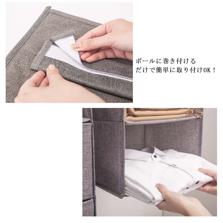 | クローゼットやハンガーラックのポールに吊るすだけで簡単にタテ置き収納の棚が設置できます。 棚置き式で、出し入れが簡単にでき、シャツやセーター、帽子などの気になる型くずれを防いで収納できます。 ポールに巻き付けるだけで簡単に取り付けOK! 通気性が良い不織布製なので、カビがつきにくく、やわらかい生地でやさしく保管できます。 使わない時は、折りたたんでおけば、かさばらすに省スペースで保管ができます。 | |