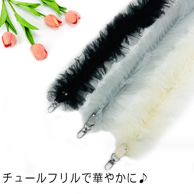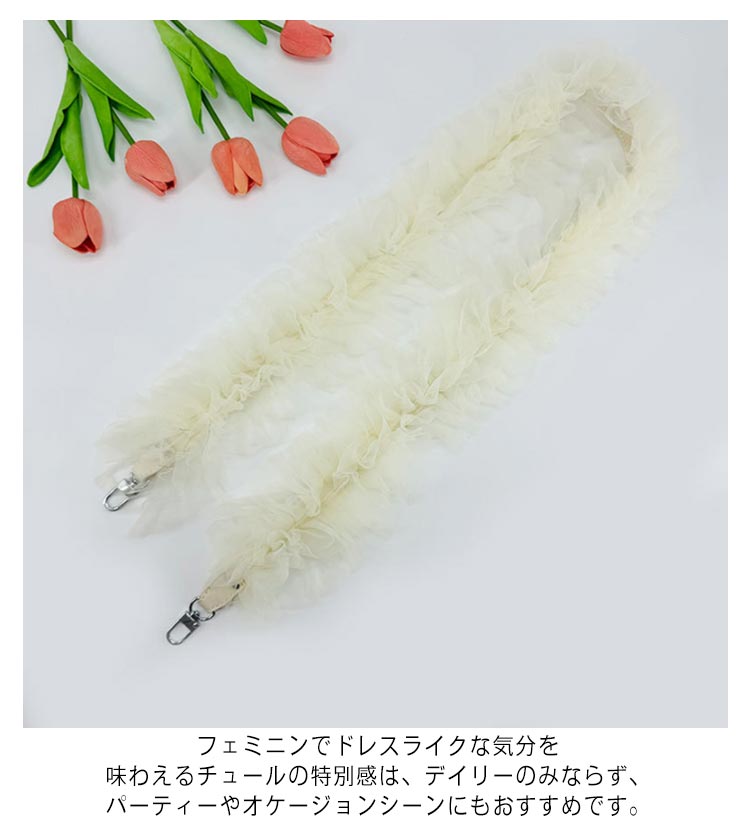 ・チュールフリルで華やかに♪・トレンドのチュール素材を使ったショルダーストラップ。・スマホやミニバッグに付けてお楽しみいただけます。・チュールはたっぷりとギャザーを取りボリューミーなフリル感に仕上げました。・フェミニンでドレスライクな気分を味わえるチュールの特別感は、デイリーのみならず、パーティーやオケージョンシーンにもおすすめです。