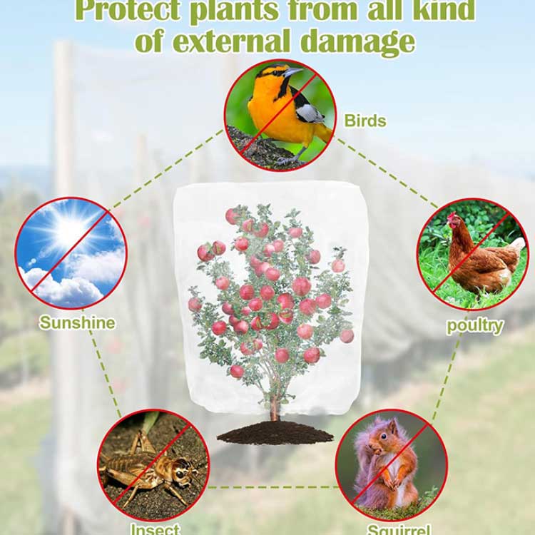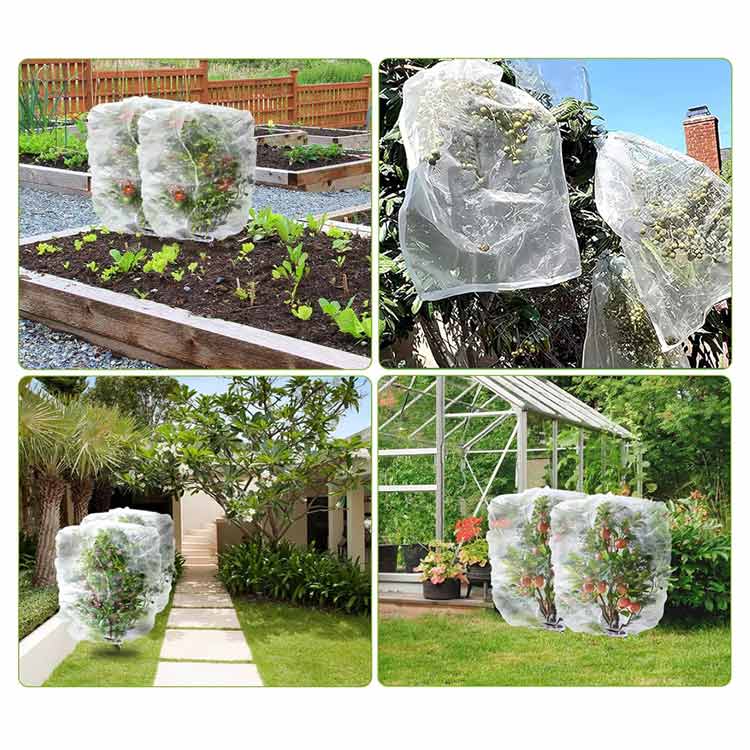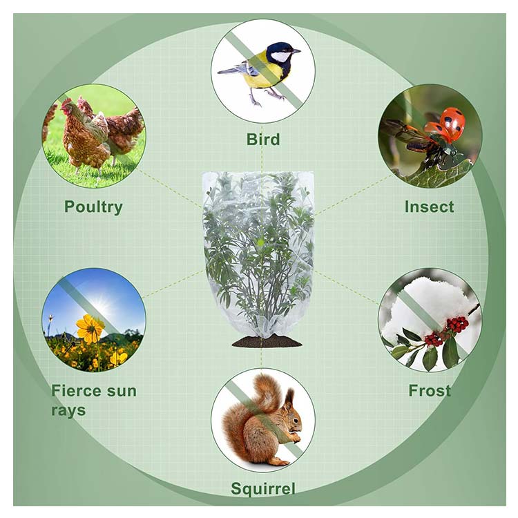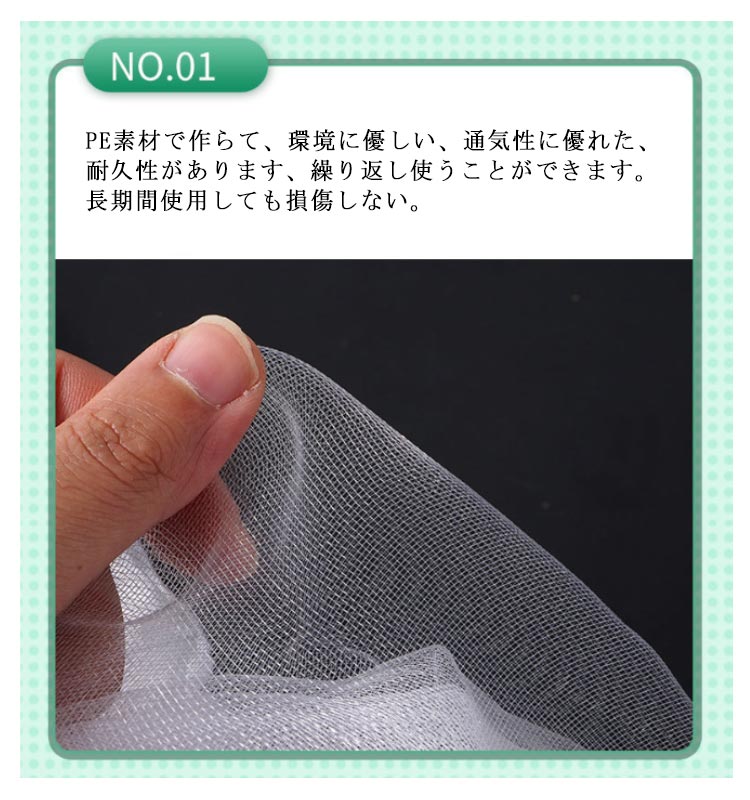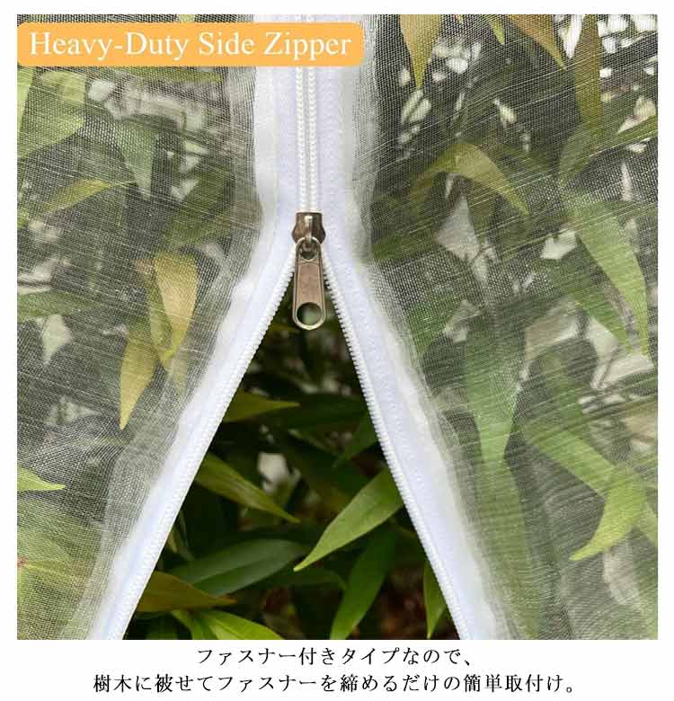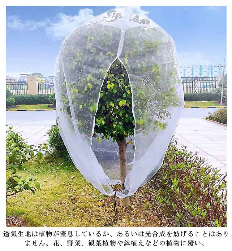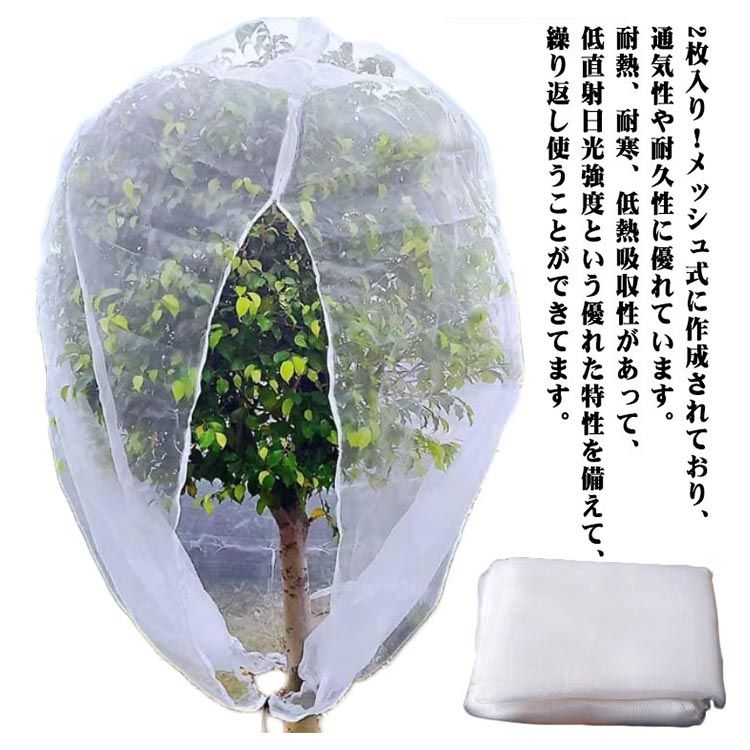 2枚入り!メッシュ式に作成されており、通気性や耐久性に優れています。耐熱、耐寒、低熱吸収性があって、低直射日光強度という優れた特性を備えて、繰り返し使うことができてます。PE素材で作らて、環境に優しい、通気性に優れた、耐久性があります、繰り返し使うことができます。長期間使用しても損傷しない。果樹栽培には必須!鳥、ウサギ、その他の虫による噛み付きから植物を保護します。恐ろしい天気から大切な花木を守ります。透気生地は植物が窒息しているか、あるいは光合成を妨げることはありません。 花、野菜、観葉植物や鉢植えなどの植物に覆い。ファスナー付きタイプなので、樹木に被せてファスナーを締めるだけの簡単取付け。広い開口部により、花や木に直接覆って、プラントの高さや大きさに合わせて自由に保護カバーを調整することができます。