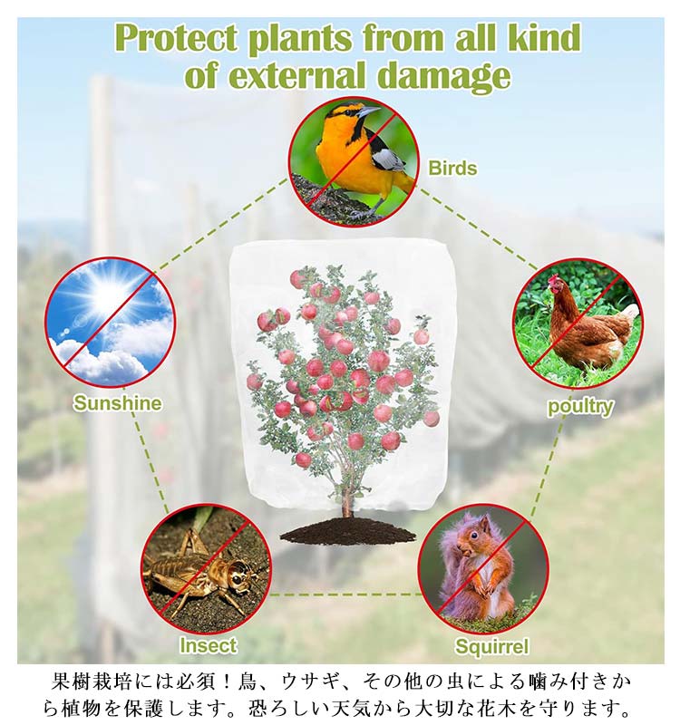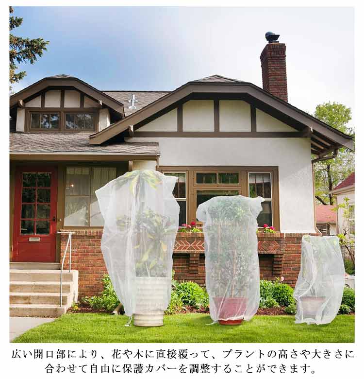 | 2枚入り!メッシュ式に作成されており、通気性や耐久性に優れています。耐熱、耐寒、低熱吸収性があって、低直射日光強度という優れた特性を備えて、繰り返し使うことができてます。 PE素材で作らて、環境に優しい、通気性に優れた、耐久性があります、繰り返し使うことができます。長期間使用しても損傷しない。 果樹栽培には必須!鳥、ウサギ、その他の虫による噛み付きから植物を保護します。恐ろしい天気から大切な花木を守ります。 透気生地は植物が窒息しているか、あるいは光合成を妨げることはありません。 花、野菜、観葉植物や鉢植えなどの植物に覆い。 ファスナー付きタイプなので、樹木に被せてファスナーを締めるだけの簡単取付け。 広い開口部により、花や木に直接覆って、プラントの高さや大きさに合わせて自由に保護カバーを調整することができます。 | |