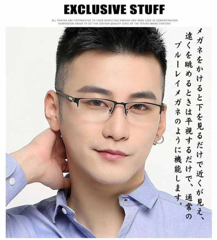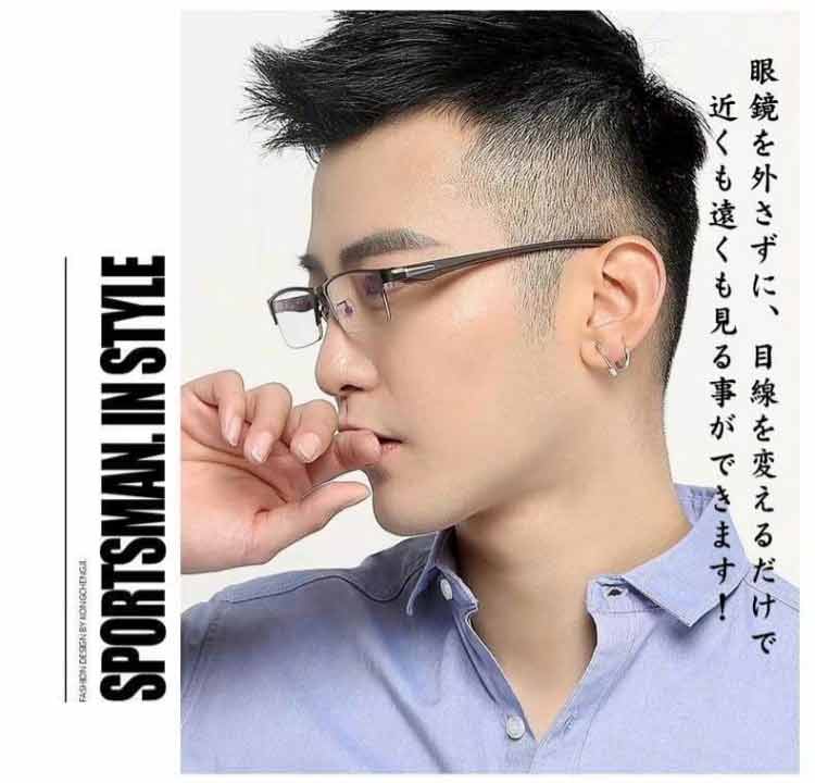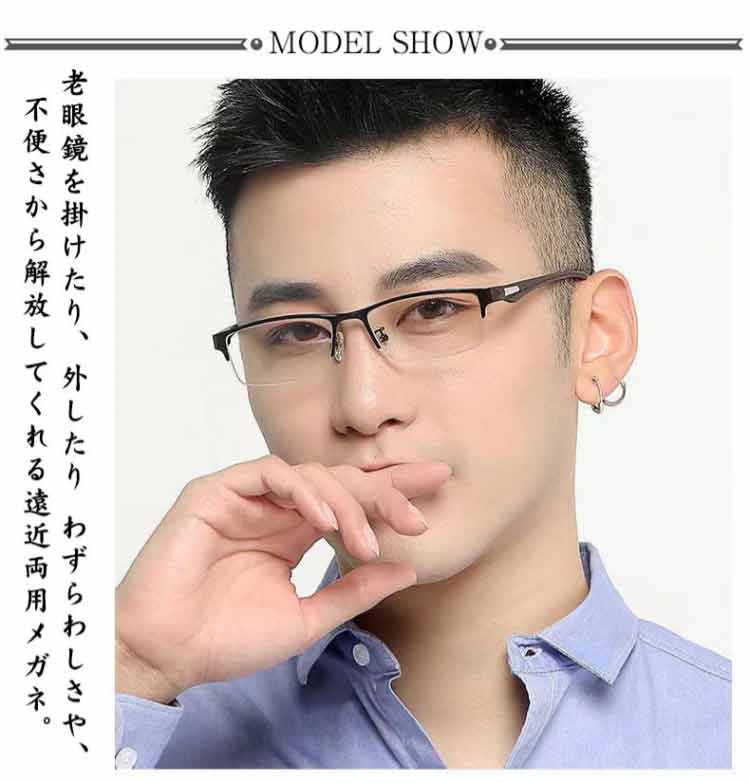 | 遠近両用メガネ 累進多焦点レンズ ブルーライトカット&変色メガネ 老眼鏡を掛けたり、外したり わずらわしさや、不便さから解放してくれる遠近両用メガネ。 メガネをかけると下を見るだけで近くが見え、遠くを眺めるときは平視するだけで、通常のブルーレイメガネのように機能します。 眼鏡を外さずに、目線を変えるだけで近くも遠くも見る事ができます! 室内では、有害な青色光をカットして、眼精疲労を解消して、頭痛を緩和します。室外では、有害な紫外線をカットすることができます。 | |