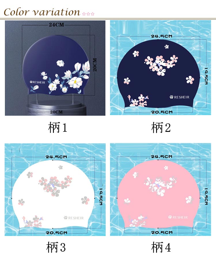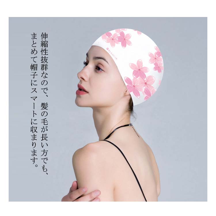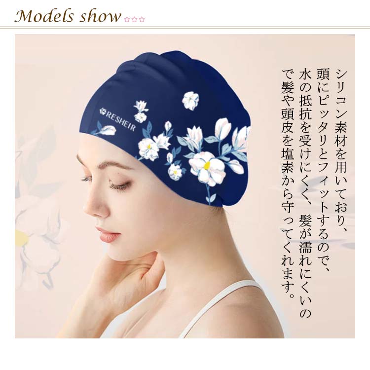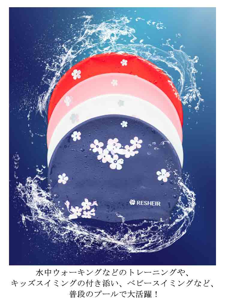 | 塩素から髪の毛を守るシリコンスイムキャップ 伸縮性抜群なので、髪の毛が長い方でも、まとめて帽子にスマートに収まります。 シリコン素材を用いており、頭にピッタリとフィットするので、水の抵抗を受けにくく、髪が濡れにくいので髪や頭皮を塩素から守ってくれます。 女性らしい美しい花柄を設計して、スイム時間を彩りします。 水中ウォーキングなどのトレーニングや、キッズスイミングの付き添い、ベビースイミングなど、普段のプールで大活躍! | |