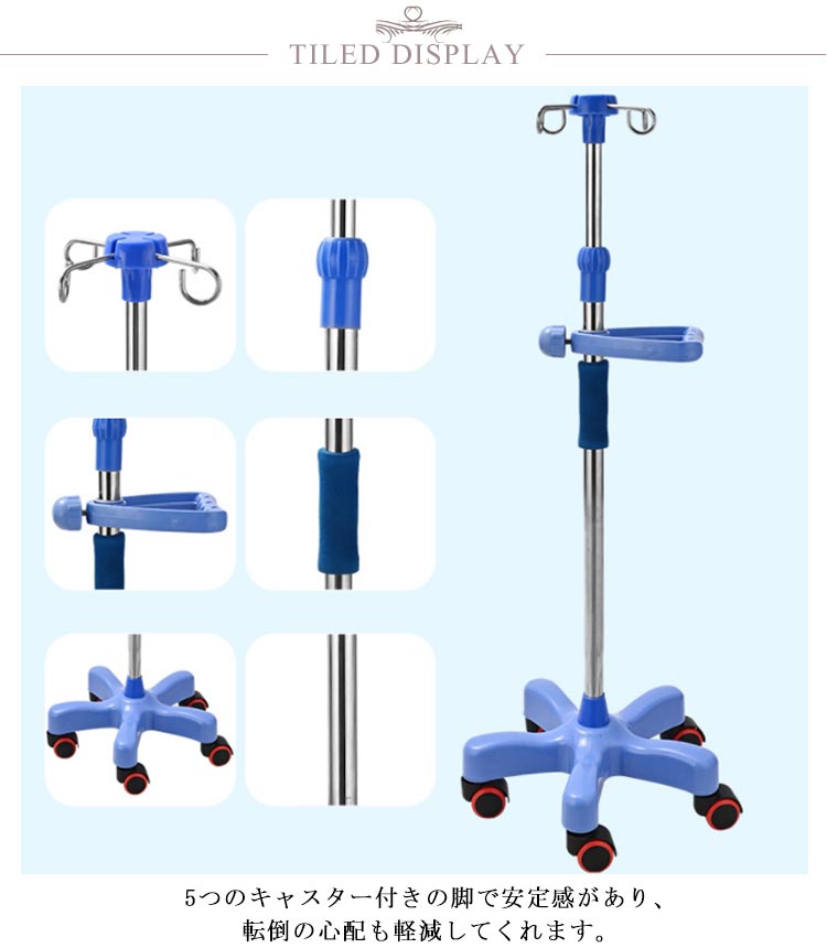 | 点滴スタンド!安定性抜群5本脚キャスター! 5つのキャスター付きの脚で安定感があり、転倒の心配も軽減してくれます。 360°スムーズに移動が可能です。 また、点滴に必要な道具など置ける便利なトレー付きです。 自由に調節が可能!子供から大人まで、ご使用頂く方の身長や使用場所に合わせて自由に高さを変更できます。 適用範囲は病院 療養院 診療所 家庭 コミュニティ 家庭看護 診療所 ペット診療所 美容院など。 | |