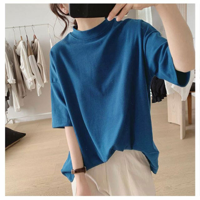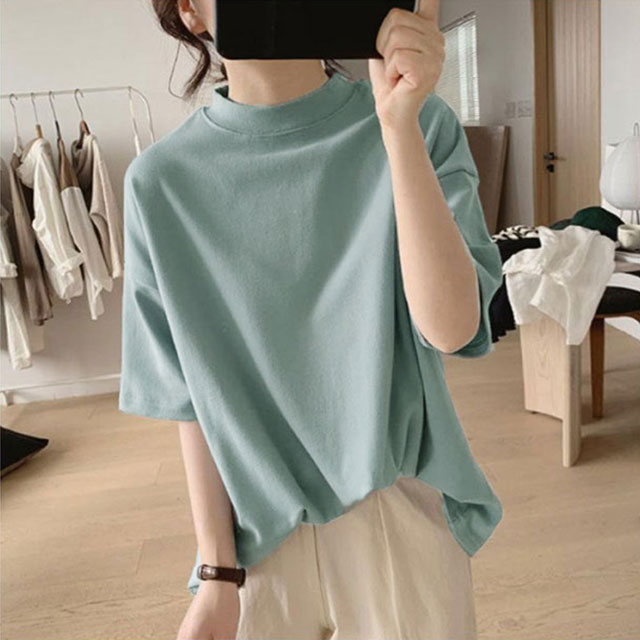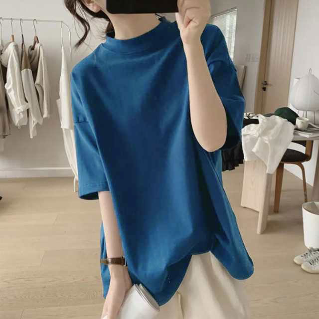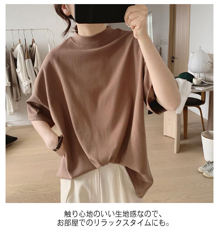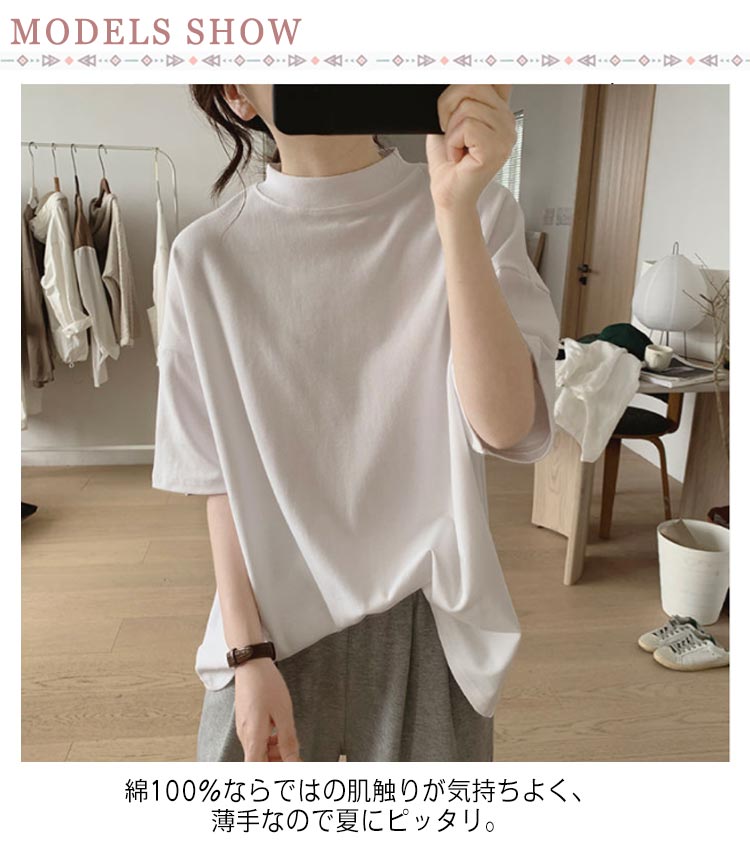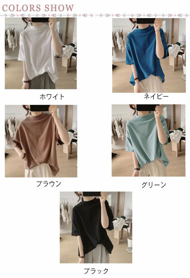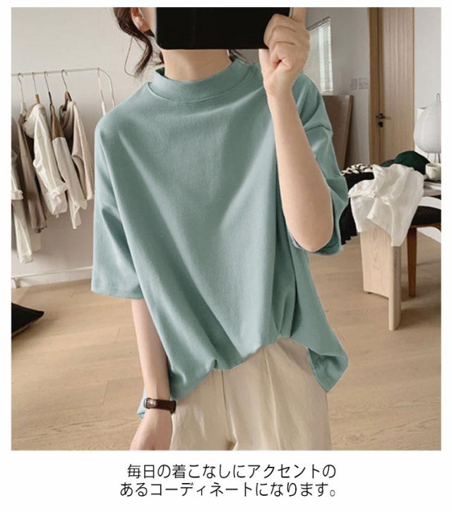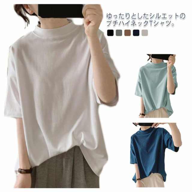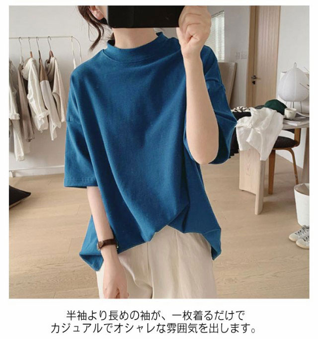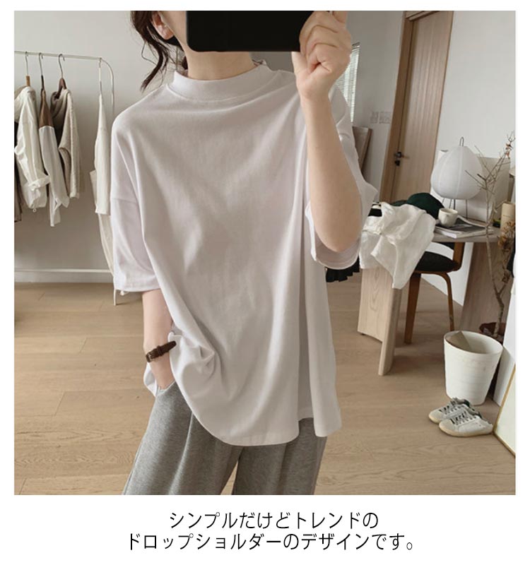 プチハイネック tシャツ レディース 春夏 ゆったり シンプル 半袖 綿100% トップス 韓国ファッション 可愛い 無地 コットン ドロップショルダー ボトルネック おしゃれ モックネック 5分袖 二の腕カバー 送料無料