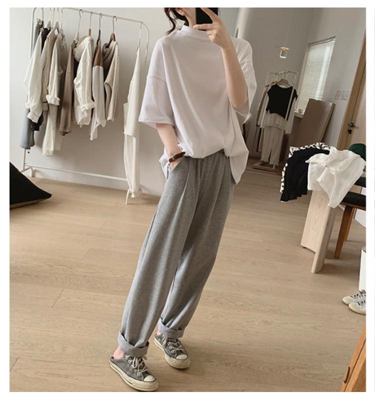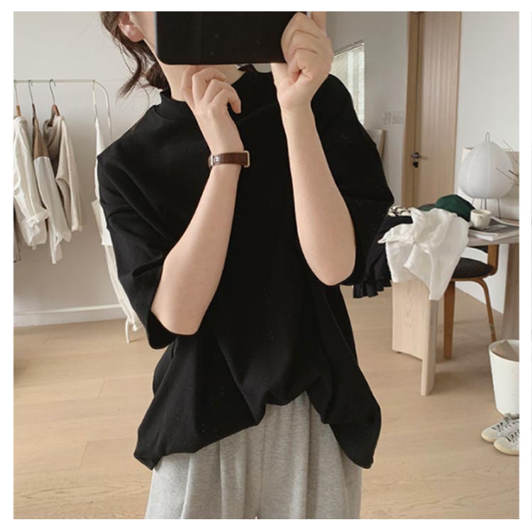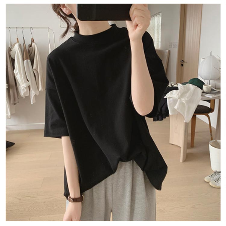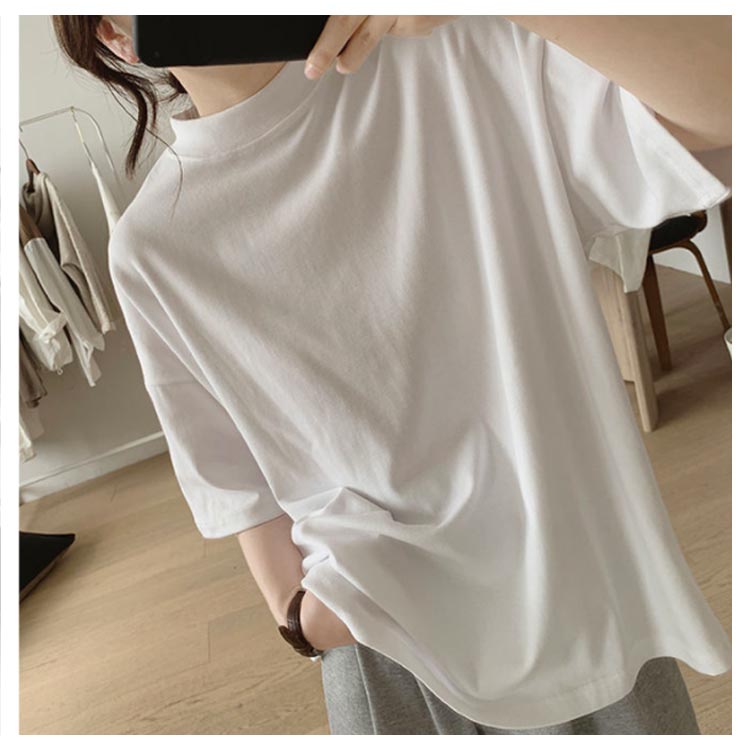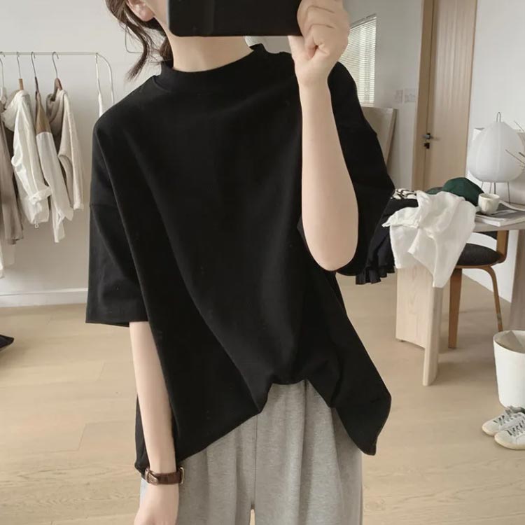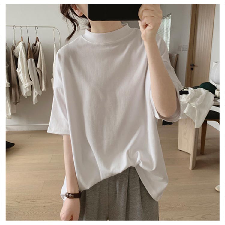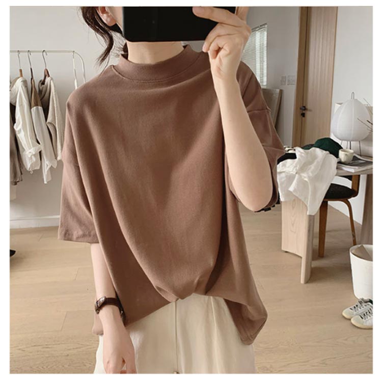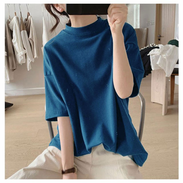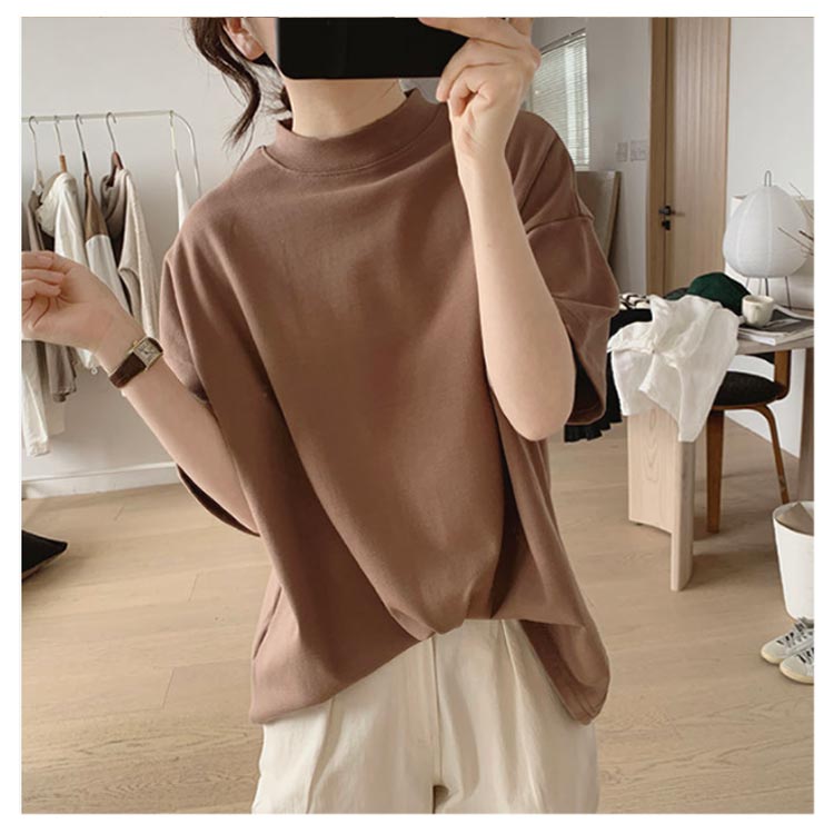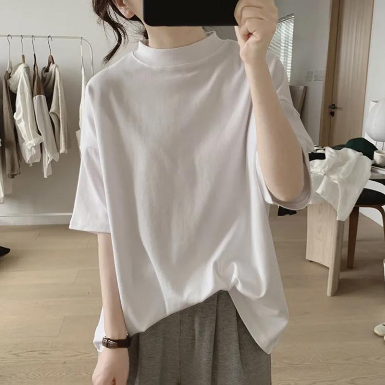 プチハイネック tシャツ レディース 春夏 ゆったり シンプル 半袖 綿100% トップス 韓国ファッション 可愛い 無地 コットン ドロップショルダー ボトルネック おしゃれ モックネック 5分袖 二の腕カバー 送料無料